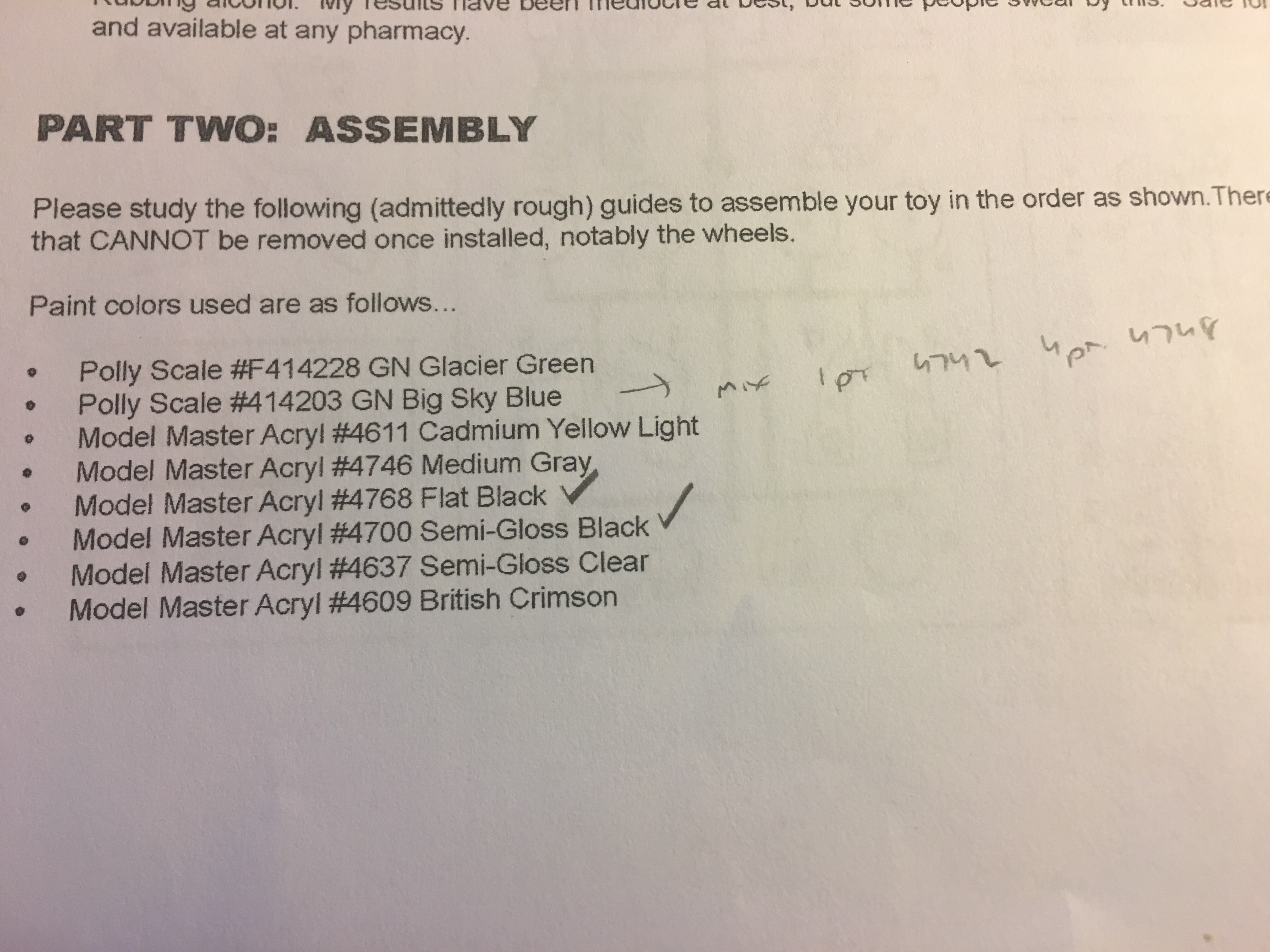 Attached below is the paint list for Botcon 2009 SG Thunderclash. If you look at the list, you will see Polly Scale paints. They don't make Polly Scale paint anymore. However, I was able to buy the GN Glacier Green paint off of eBay. Let me know if you need it - If be willing to ship it to you (I doubt that I will use it again.). For GN Big Sky Blue, I saw somewhere on the internet that Model Master Acrylic Insignia Blue #4742 (1 part) mixed with Model Master Acrylic Duck Egg Blue #4748 (4 parts) is a close match.