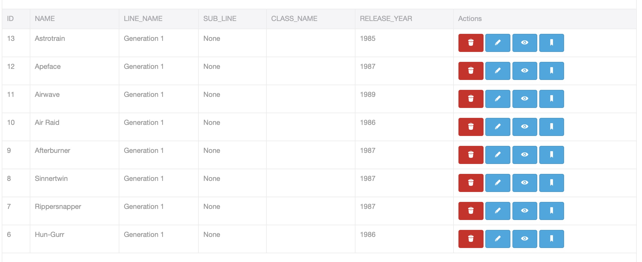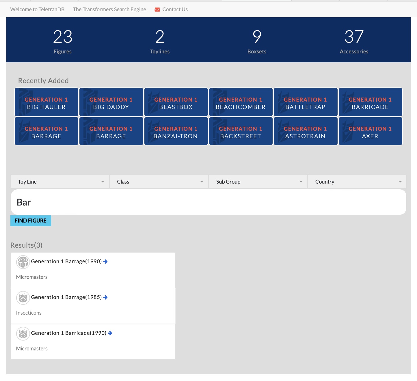 This is what I'm currently working on. The DB design and the management interface of all the data. Eventually I want it to be a sort of repository of Tf data that can be searched directly for information on the figures. I'm not going to be adding images, there's already a ton of sites that do that including Seibertron.com so there's no point in that. I'll likely just have links to galleries in those websites so you can navigate there and view them.