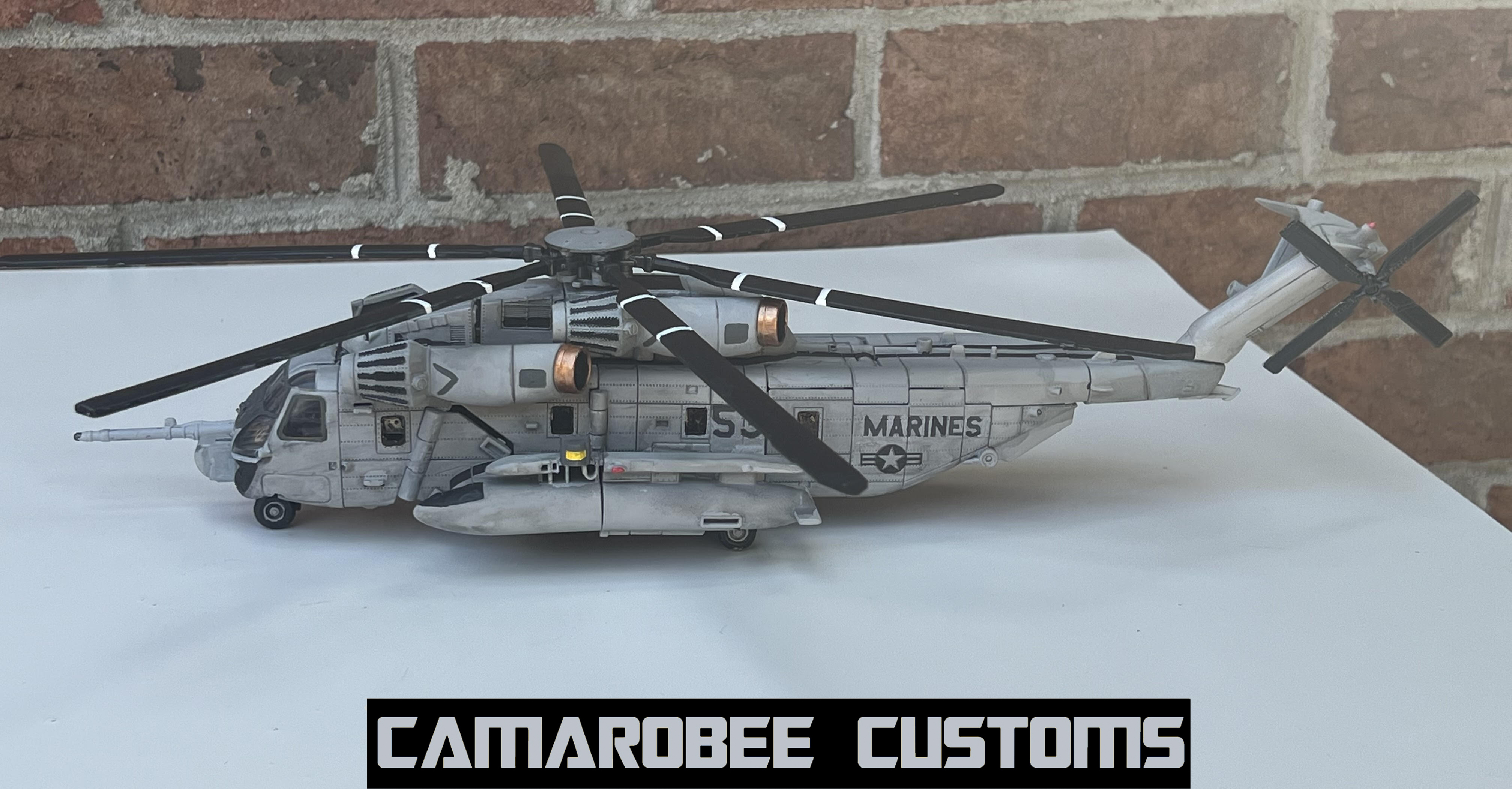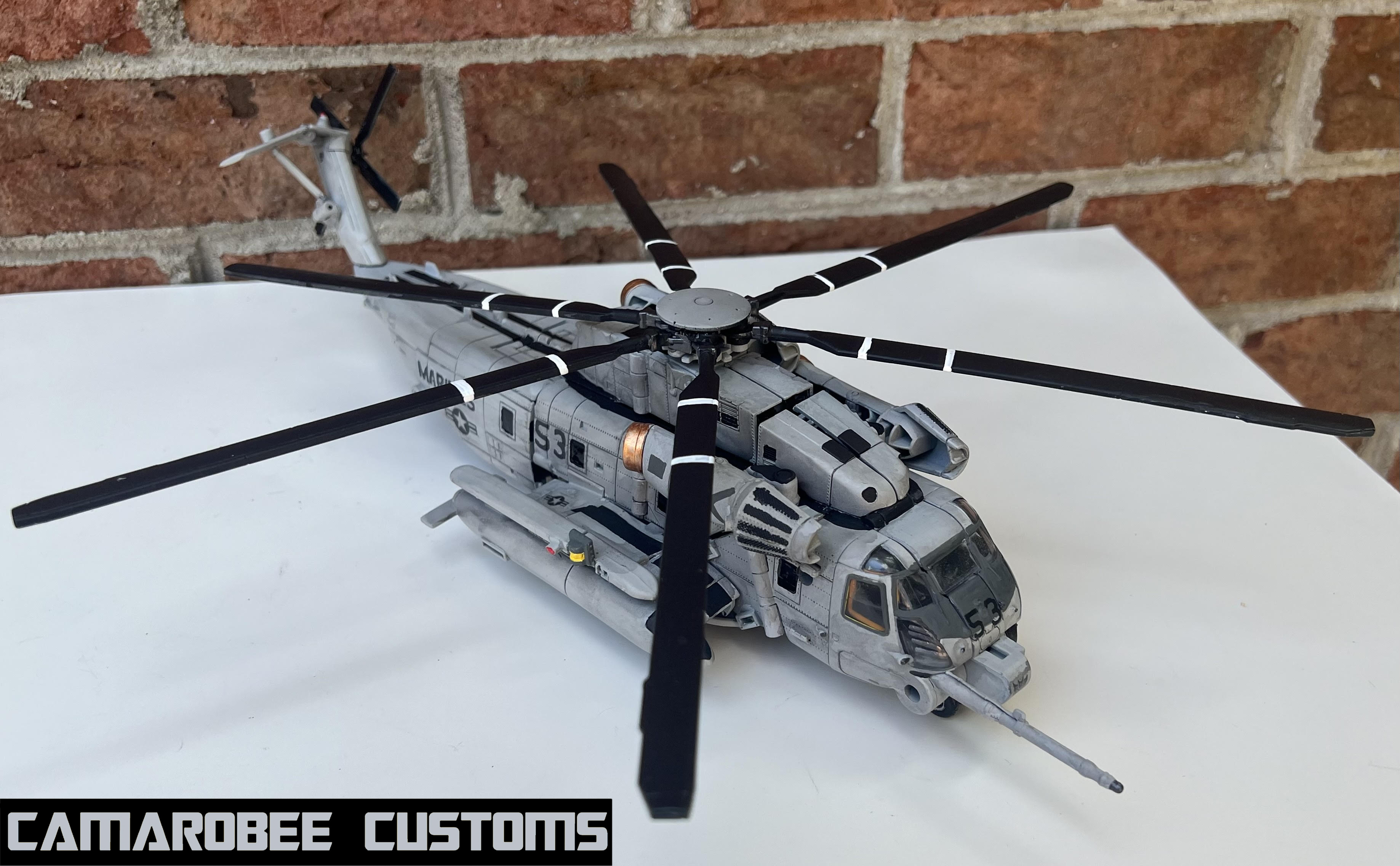 Now looking at alt mode, most of my time spent on this project was spent on figuring out the modding. First up is the nose of the helicopter, which saw the removal of most of the lower section to get it more accurate to the CH-53. I did have to leave the central portion so the upper and lower body sections can connect in robot mode, which is largely unavoidable if you want him to still transform but still makes it more evocative of the proper helicopter. I then sanded down the part of the right side cockpit below the lower window and painted on a new window sitting below that one.