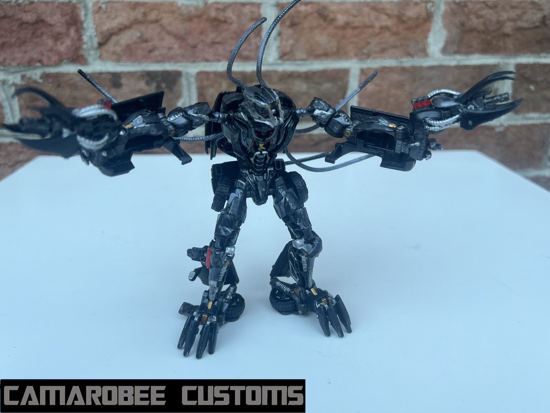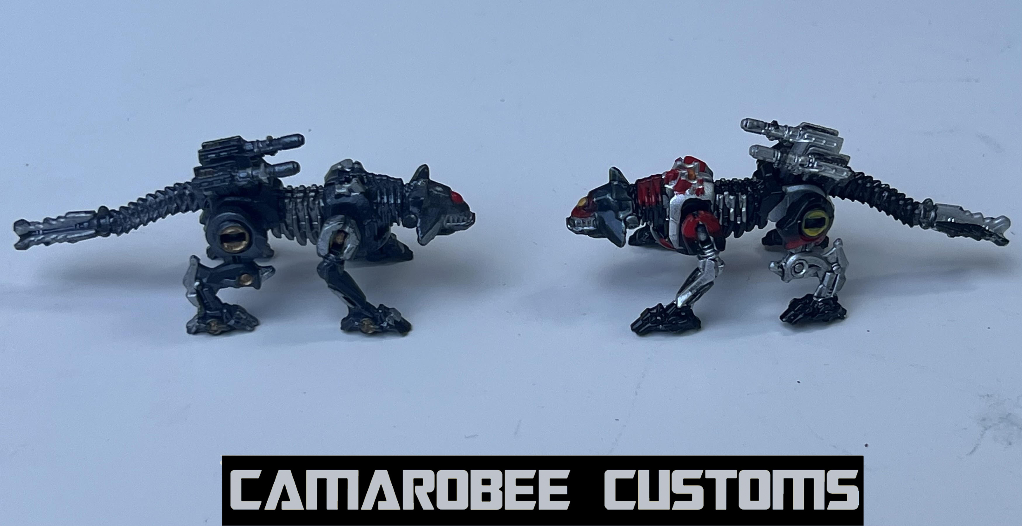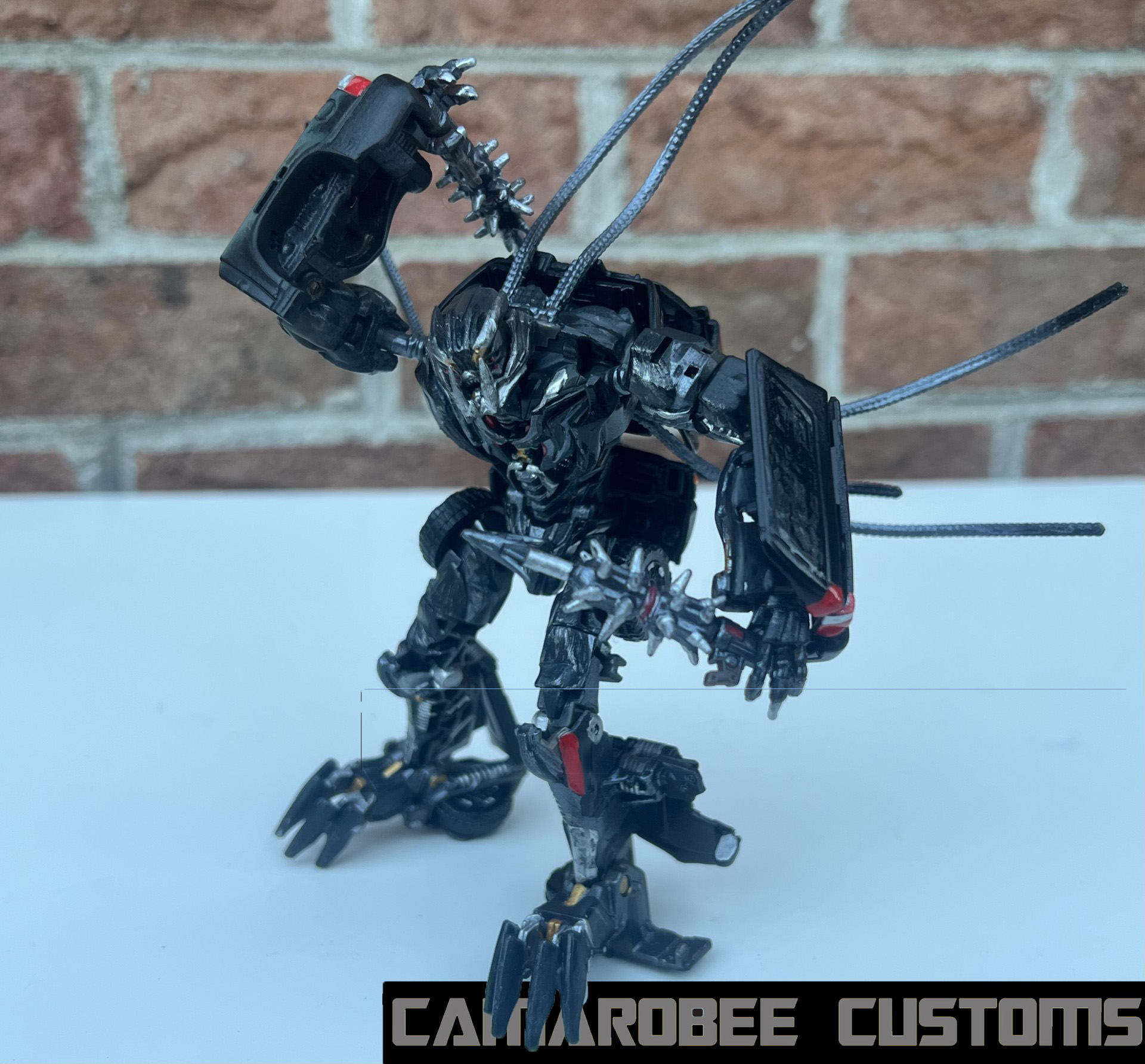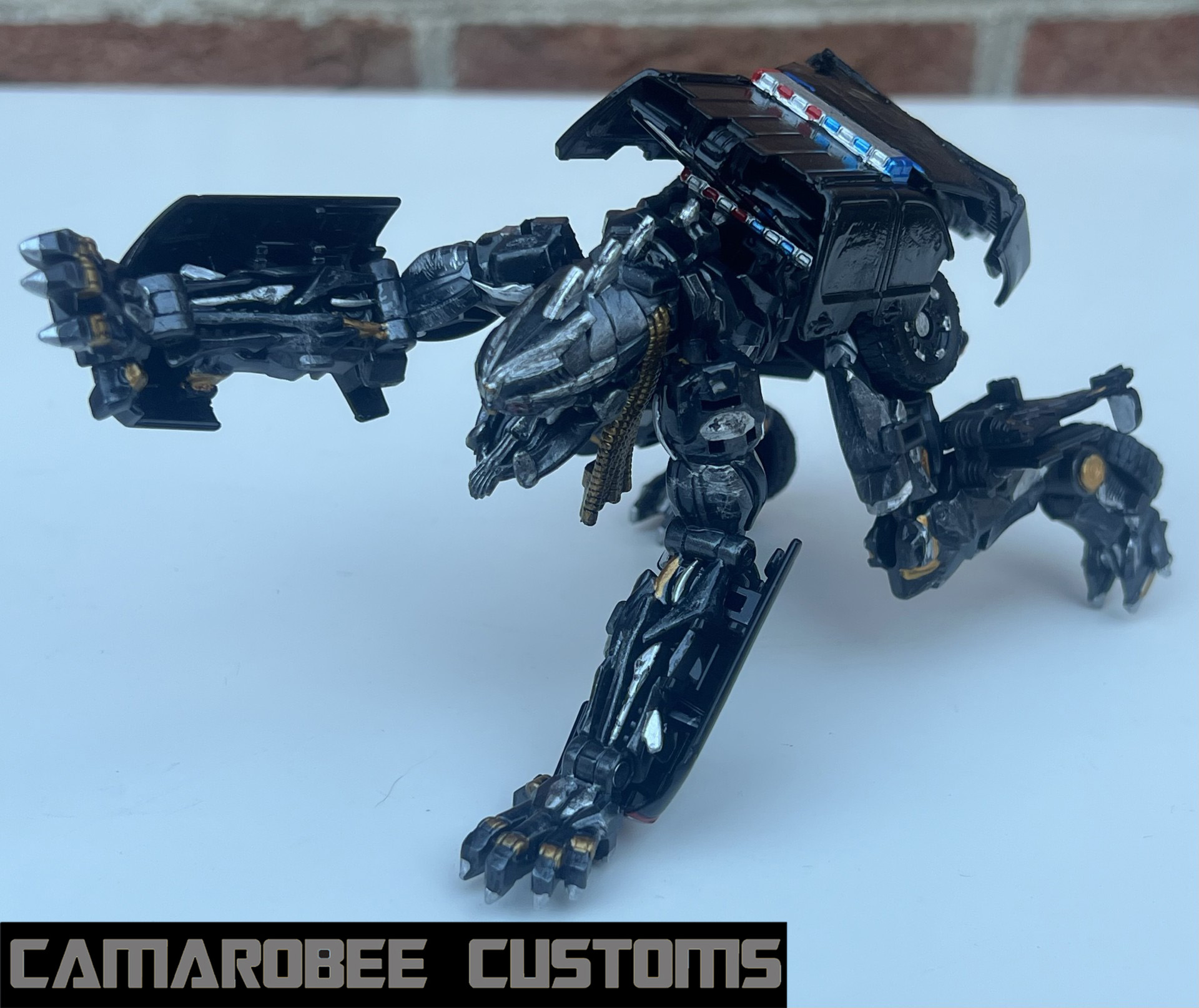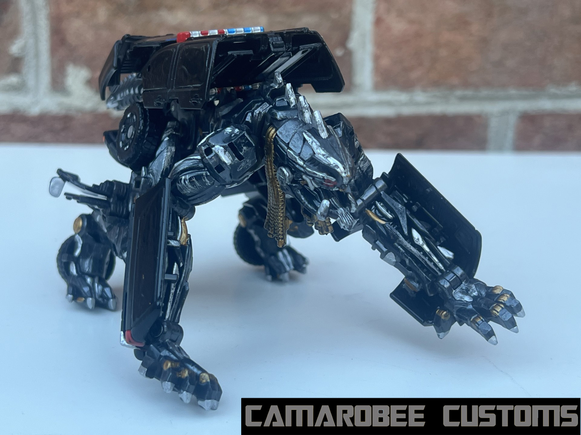 Having gone through 2 Grindors to get my finished custom, I had 2 Ravages to work with as well! The first of which has a screen accurate deco, and the other is based on the ROTF deluxe Recon Ravage (inspired by @digitaldecagon's digibash of the same idea). Our regular Ravage has a gunmetal base coat with silver and gold accents and a bright red eye. Recon Ravage has a gunmetal and silver base with lots of red detailing (with a fade in multiple sections as well), yellow on the legs, and an orange eye.