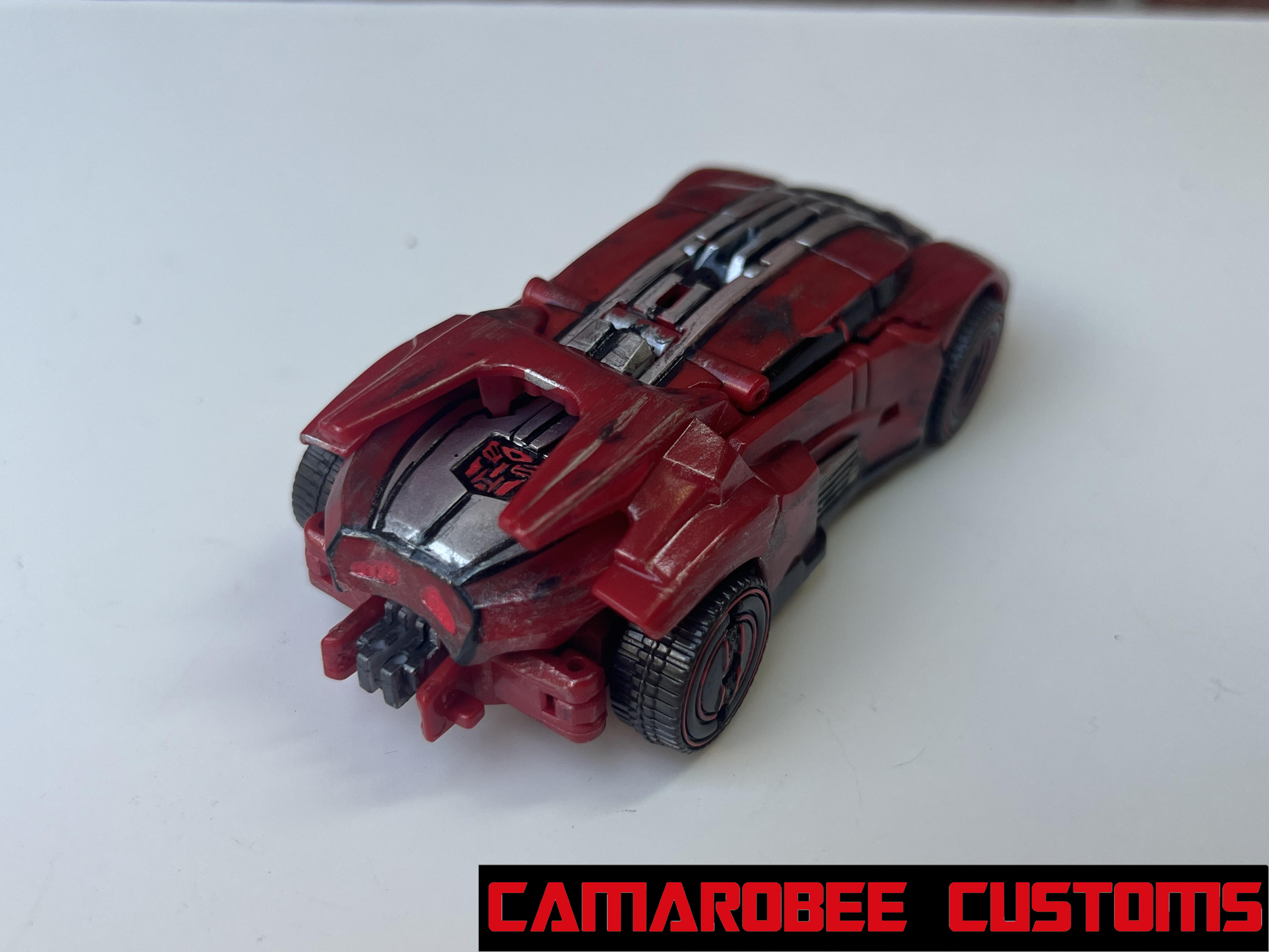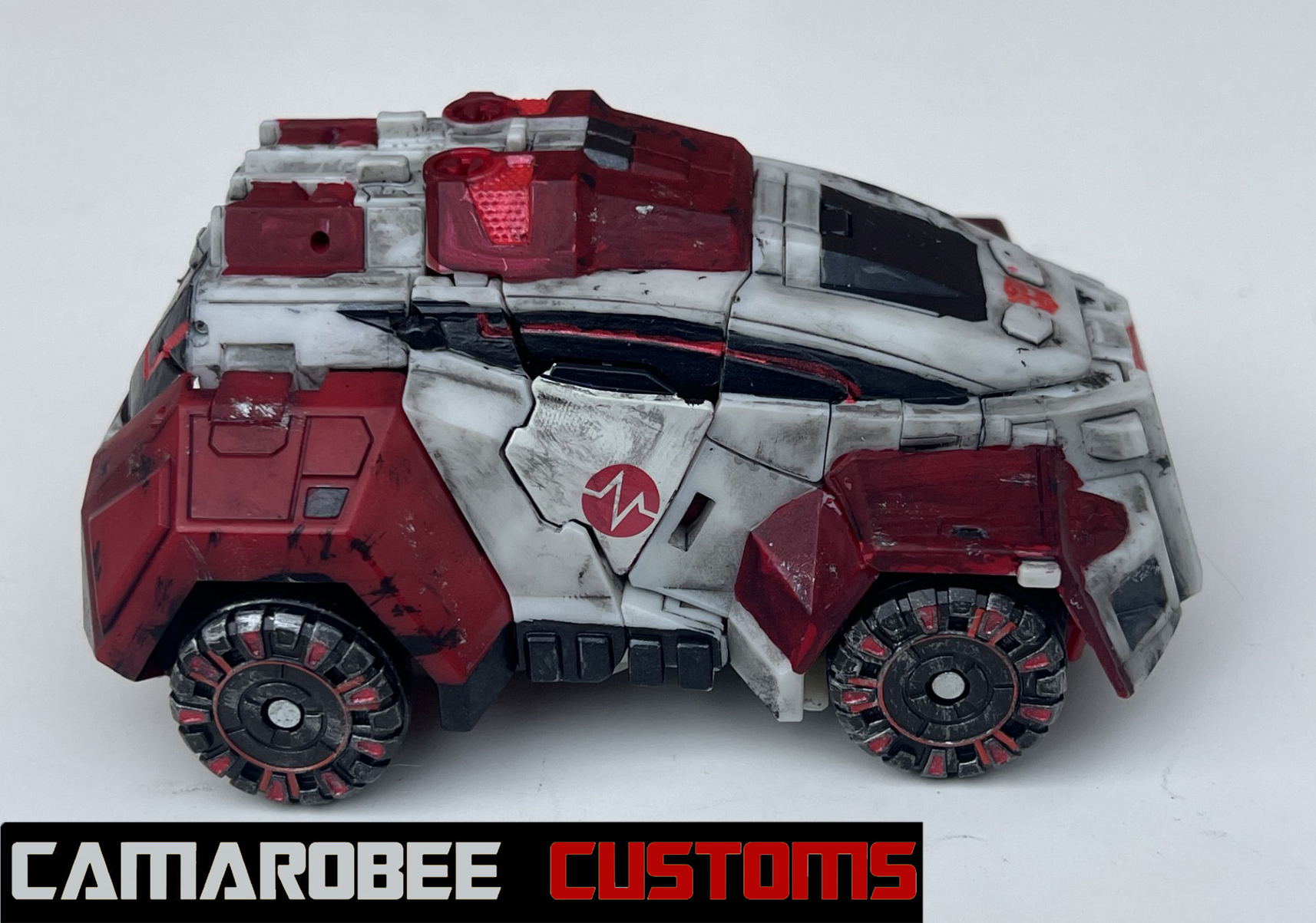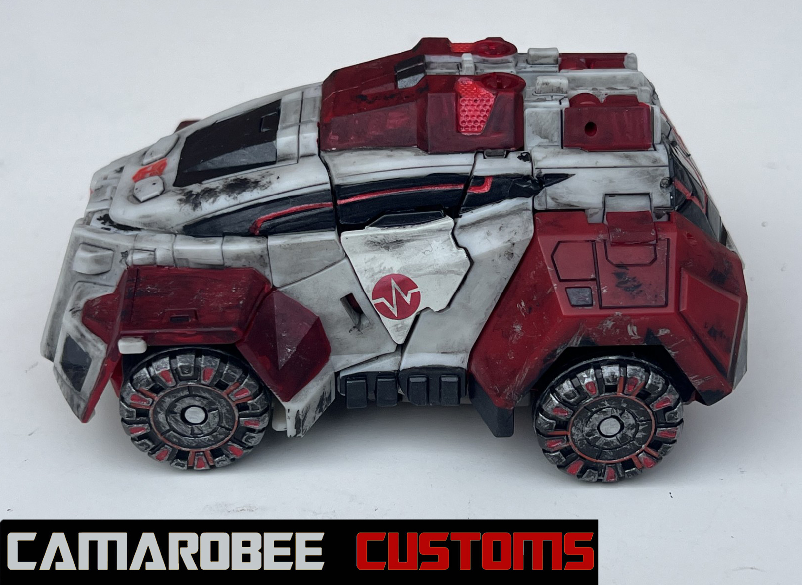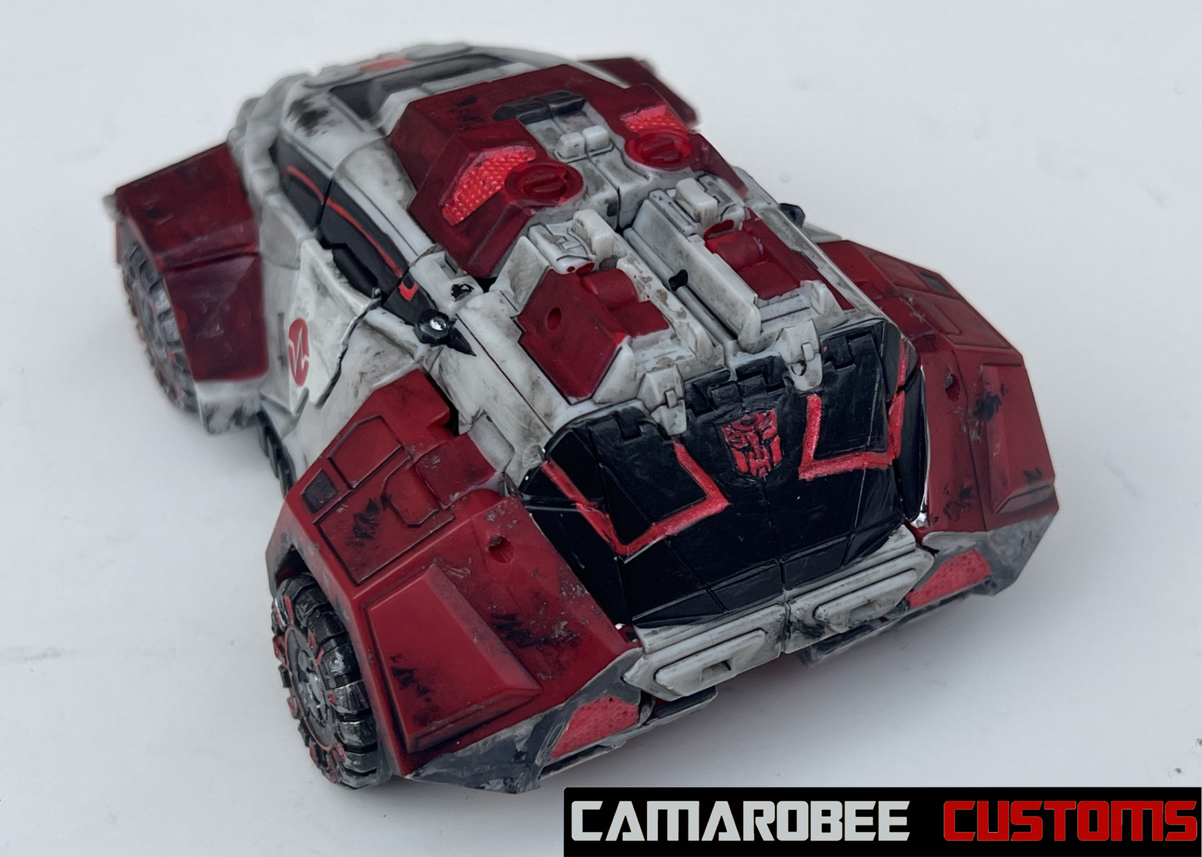 For Ratchet's alt mode, I started by repainting all the red sections in a new, slightly darker shade. The windows were repainted as well, which I accomplished by combining gloss black and gunmetal. I used that bright metallic red for the glowing sections throughout, and I got the Autobot logo on the back! I used the same technique as WFC Bee where I placed a sticker on a white background and then painted over it. I weathered up this mode with a mix of flat black sponge brushing, silver dry brushing, and model wash.