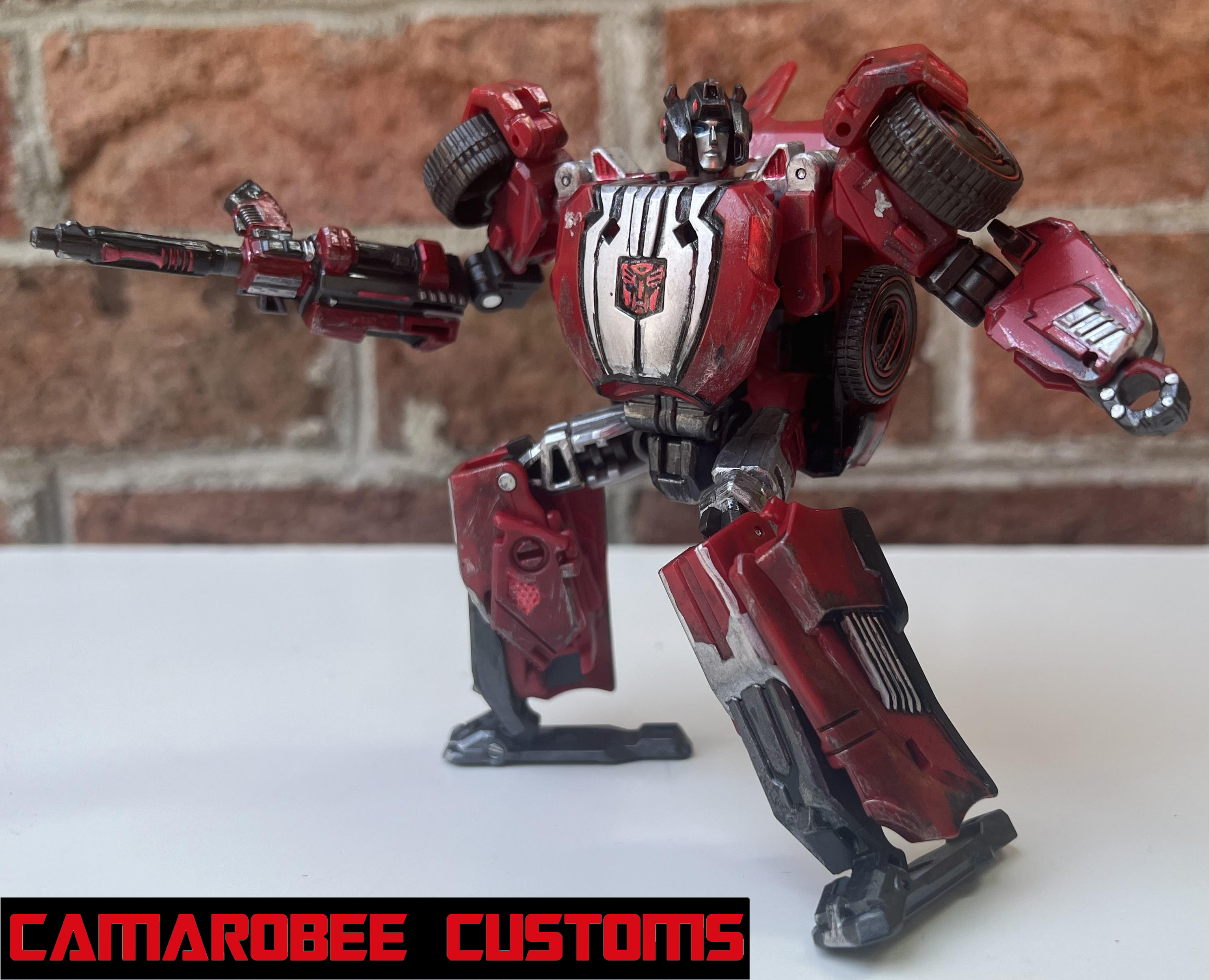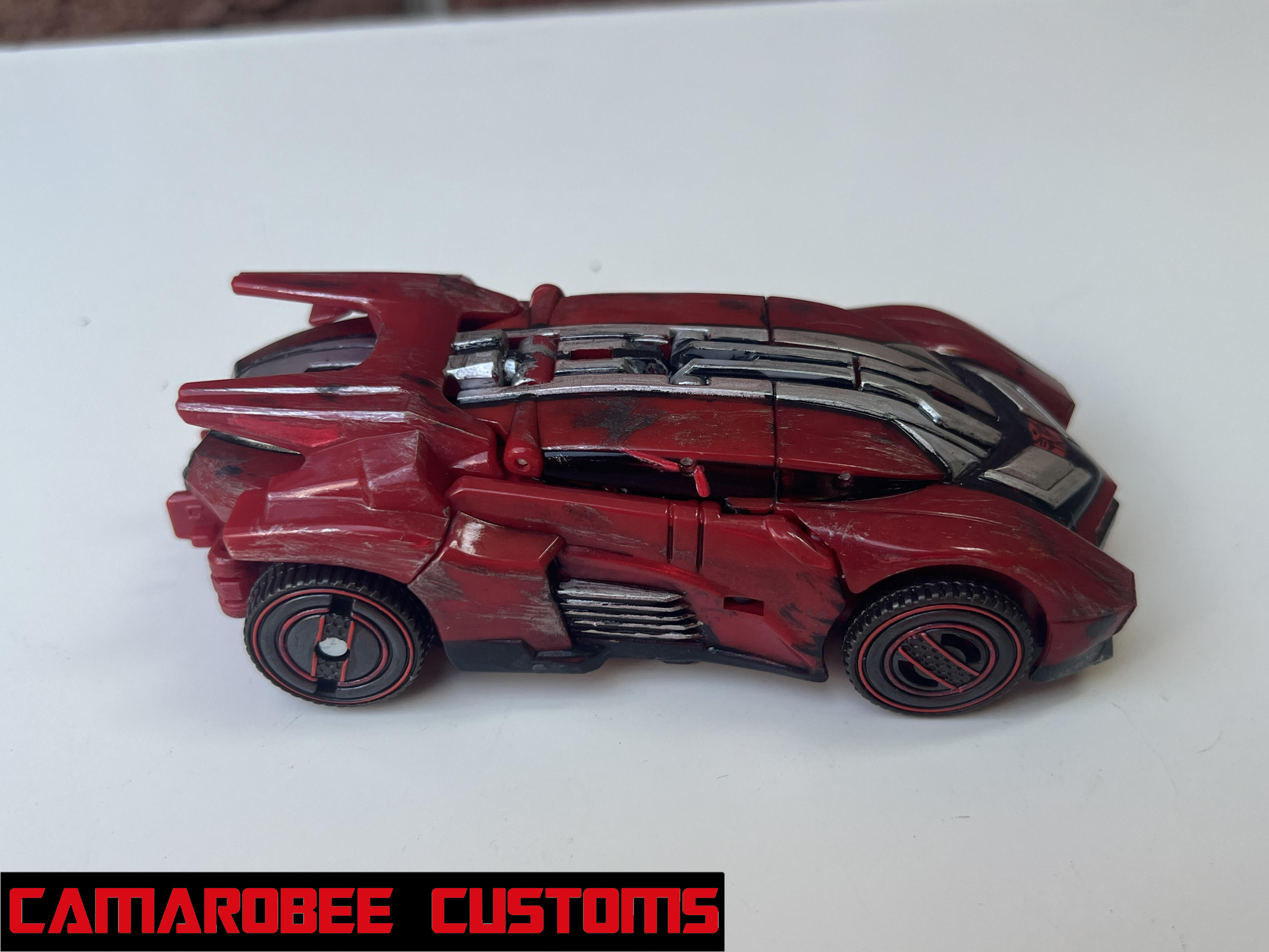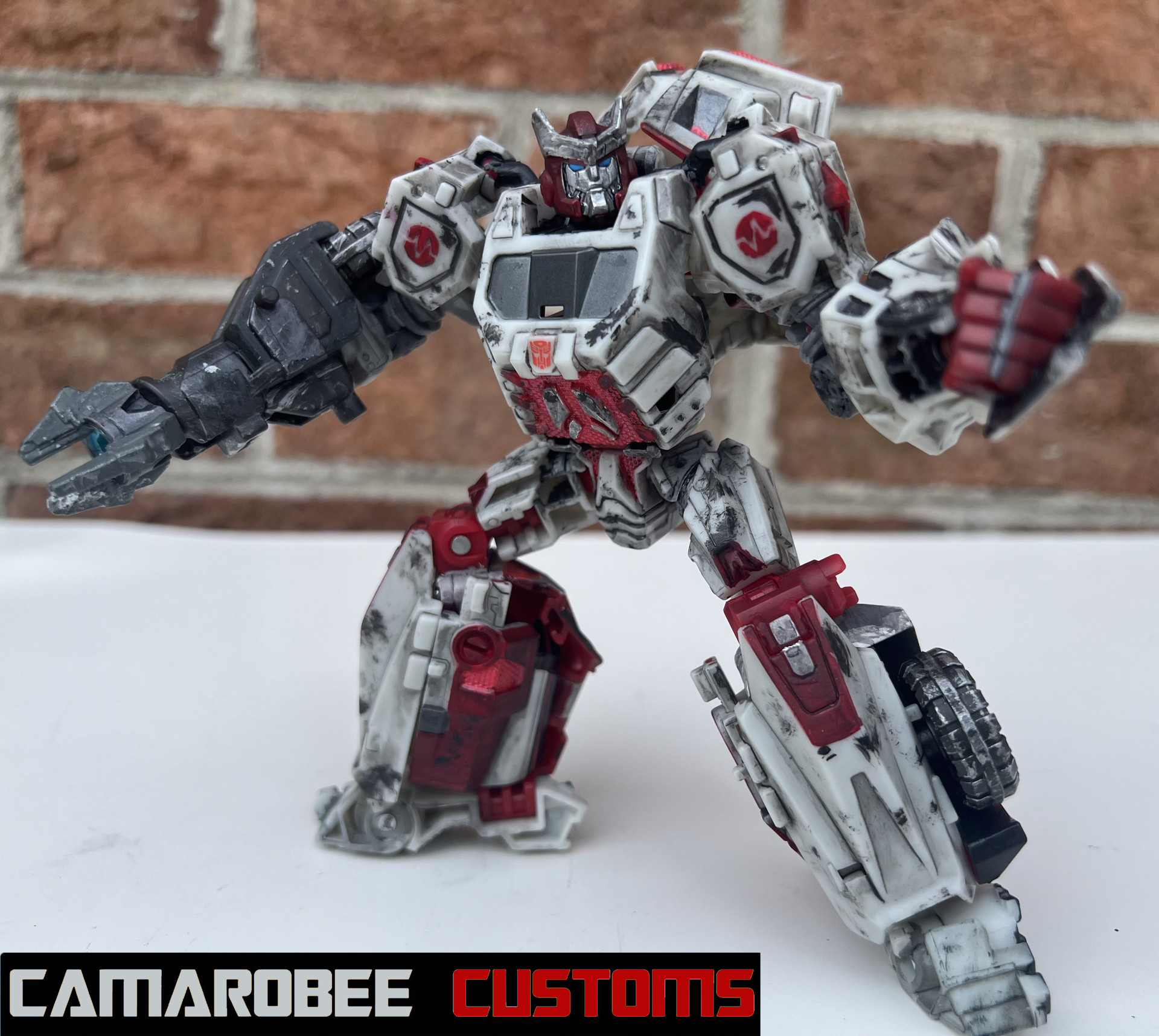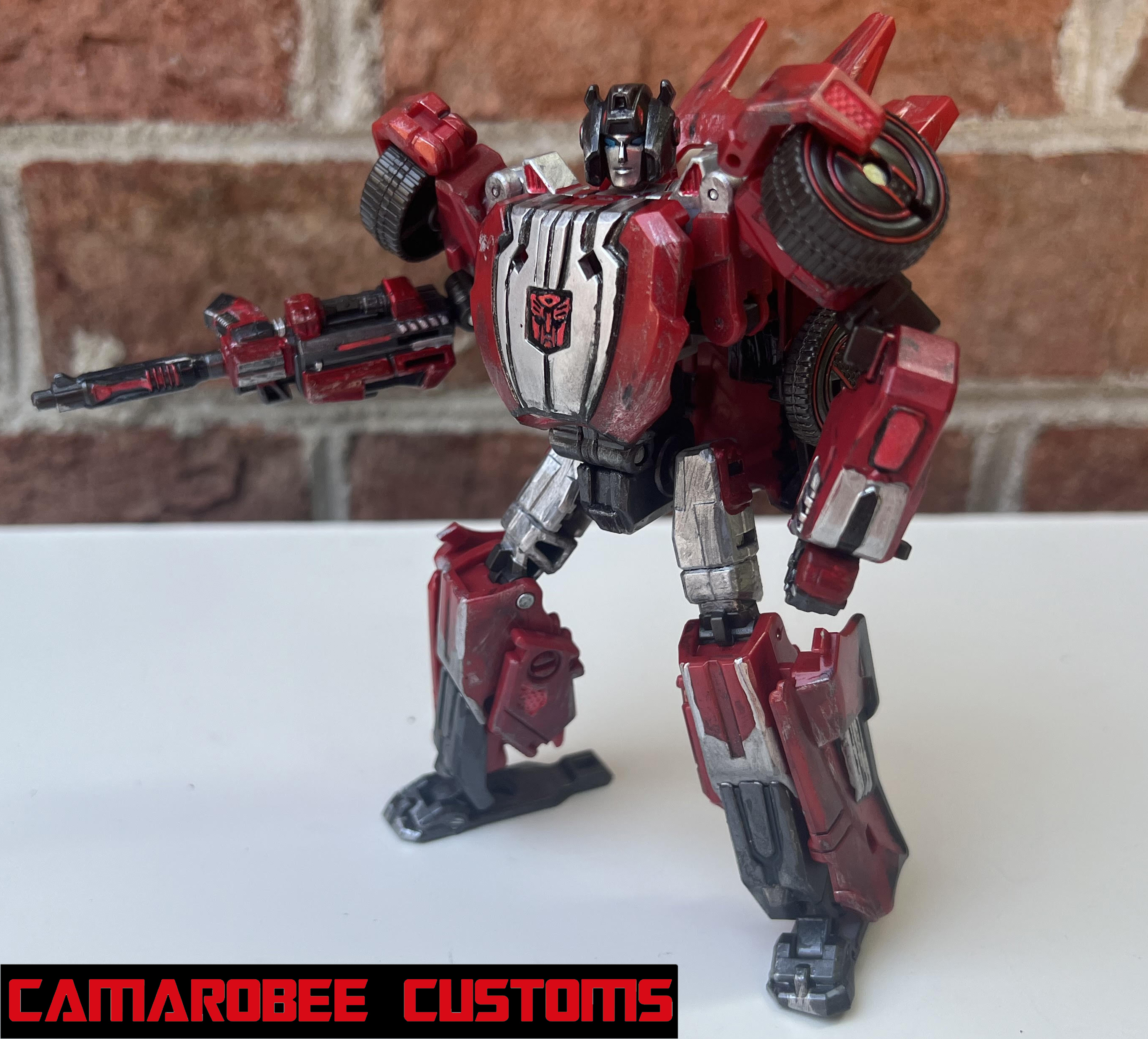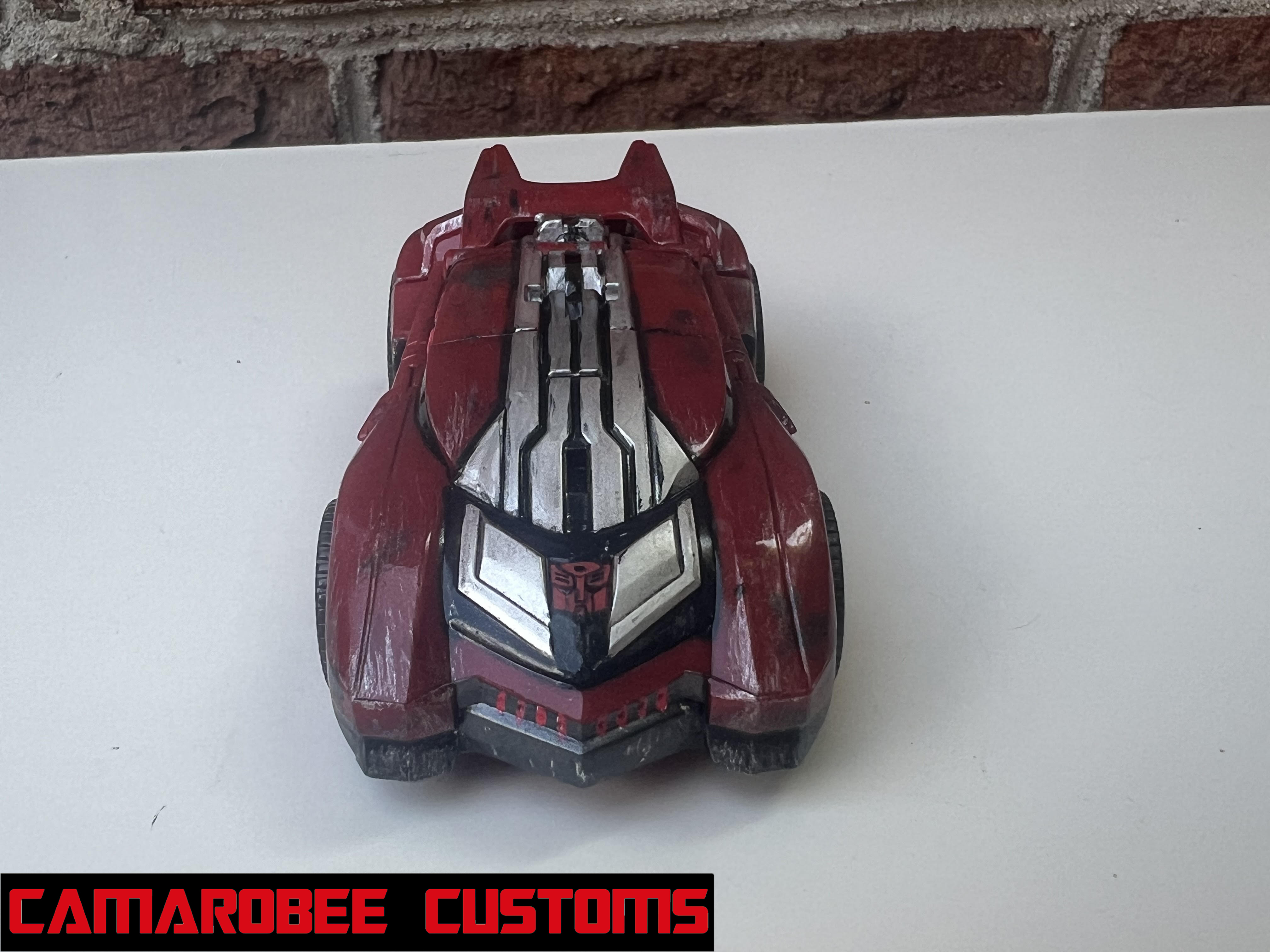 For Ratchet's alt mode, I started by repainting all the red sections in a new, slightly darker shade. The windows were repainted as well, which I accomplished by combining gloss black and gunmetal. I used that bright metallic red for the glowing sections throughout, and I got the Autobot logo on the back! I used the same technique as WFC Bee where I placed a sticker on a white background and then painted over it. I weathered up this mode with a mix of flat black sponge brushing, silver dry brushing, and model wash.