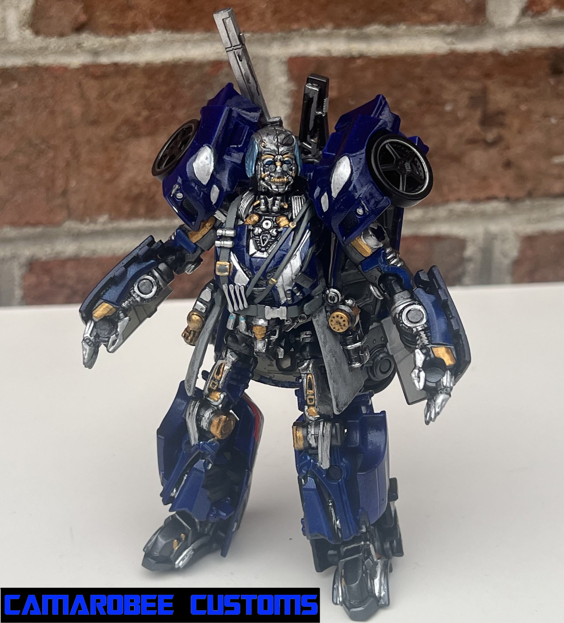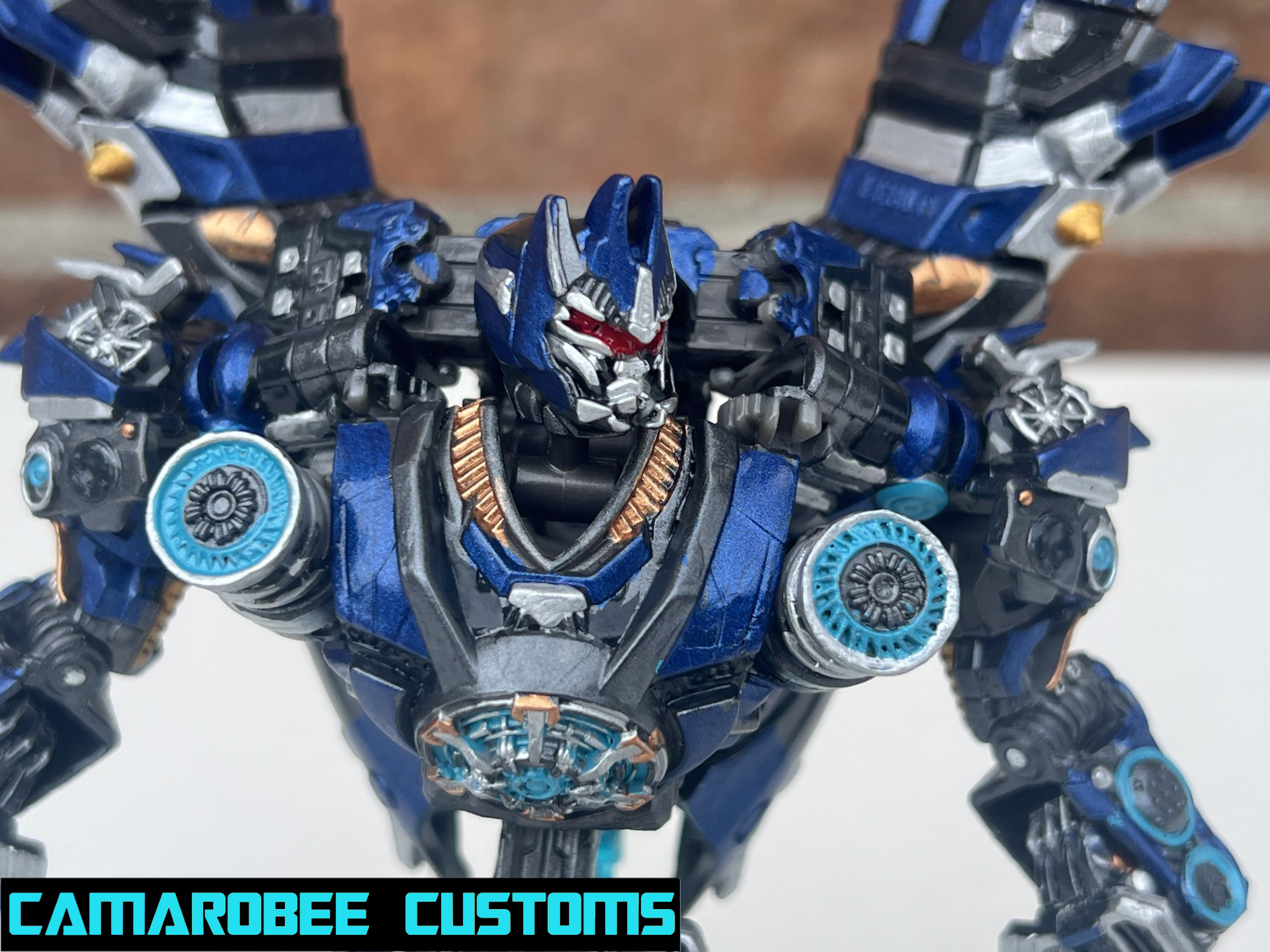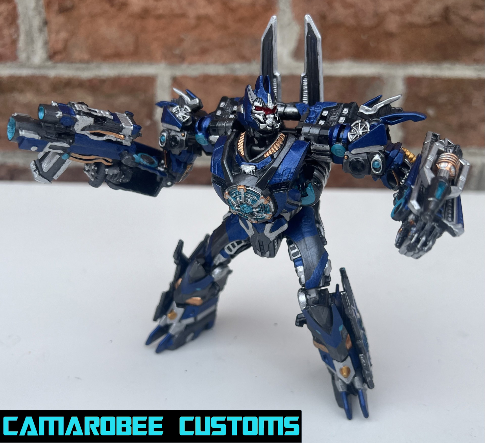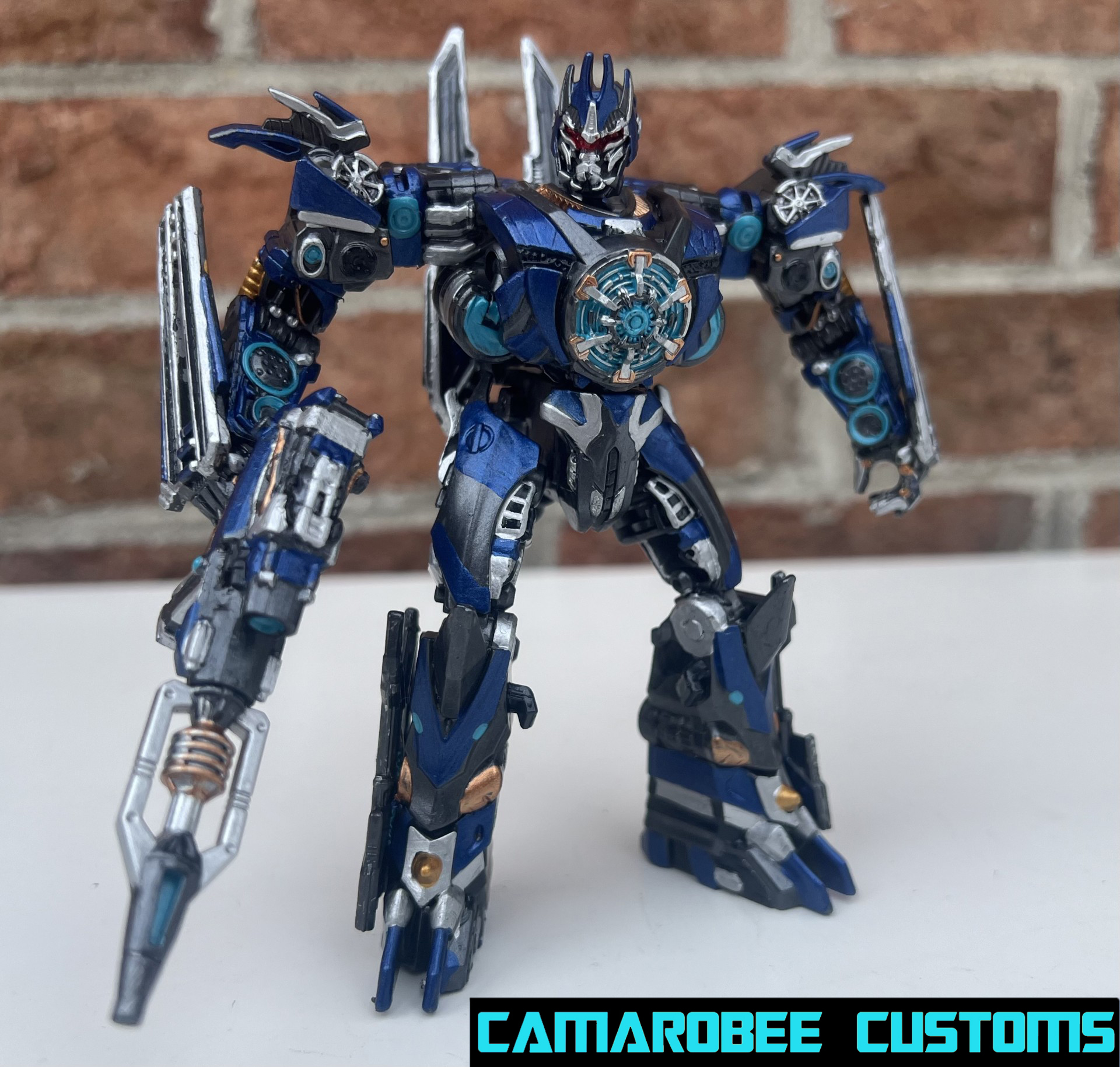 This is a project I've had on the back burner for a little while now, partially because of how many other customs of this guy are out there, but also because I didn't have as much of a plan for what I wanted to do. The detail that moved this project to the main burner was actually the silver trim around the windows - I really like how it looked and decided to get this project wrapped up. I added a lot of gunmetal throughout since ROTB prime has more gunmetal on him than the BB design, and for the blue I ended up mixing several shades of metallic blue together to get somethign I liked. Somethign interesting happened with the gloss coat too, where it deepened the metallic properties of the paint and leading to a really cool result. I used this same blue mixture on another custom you'll be seeing soon!