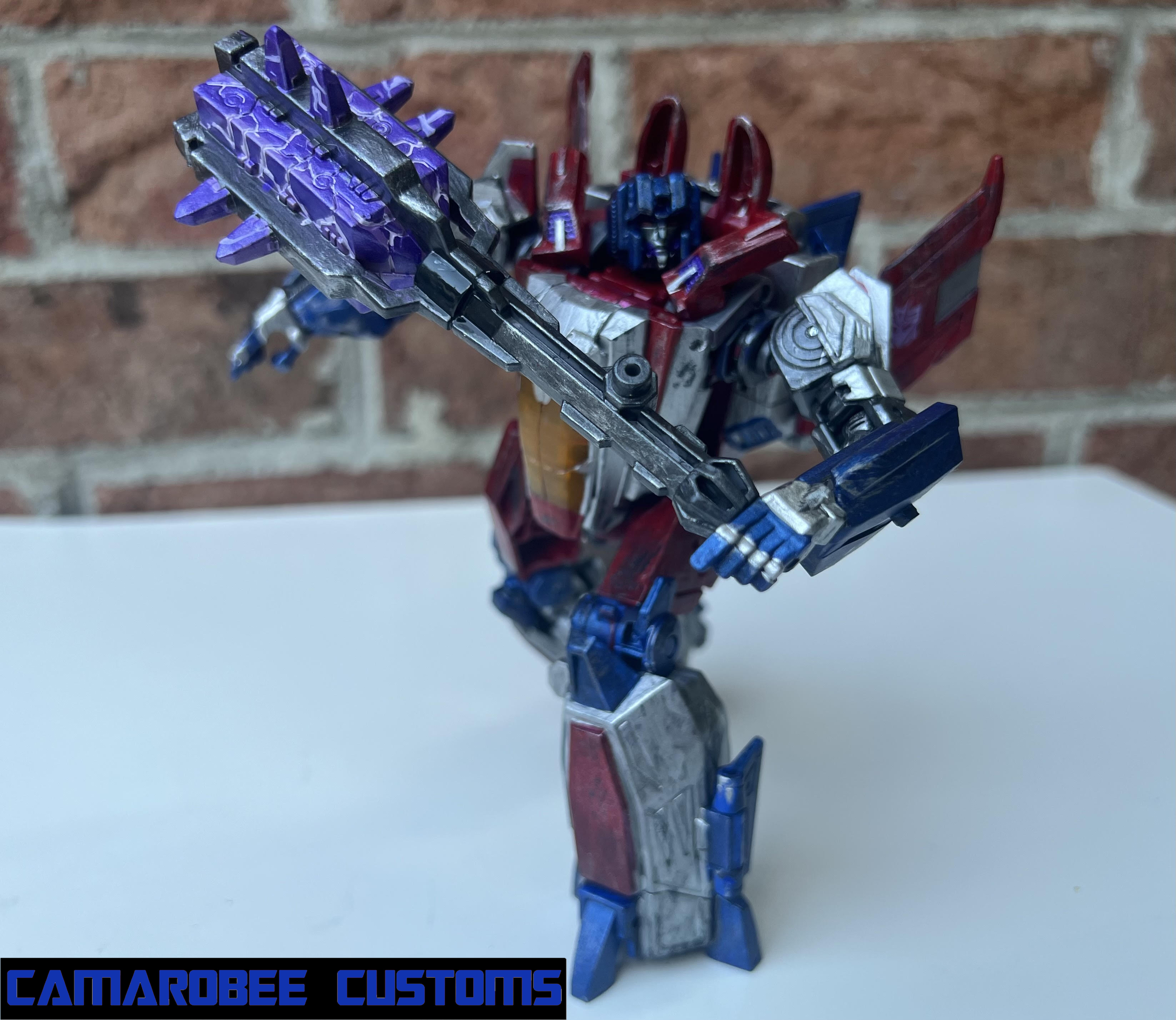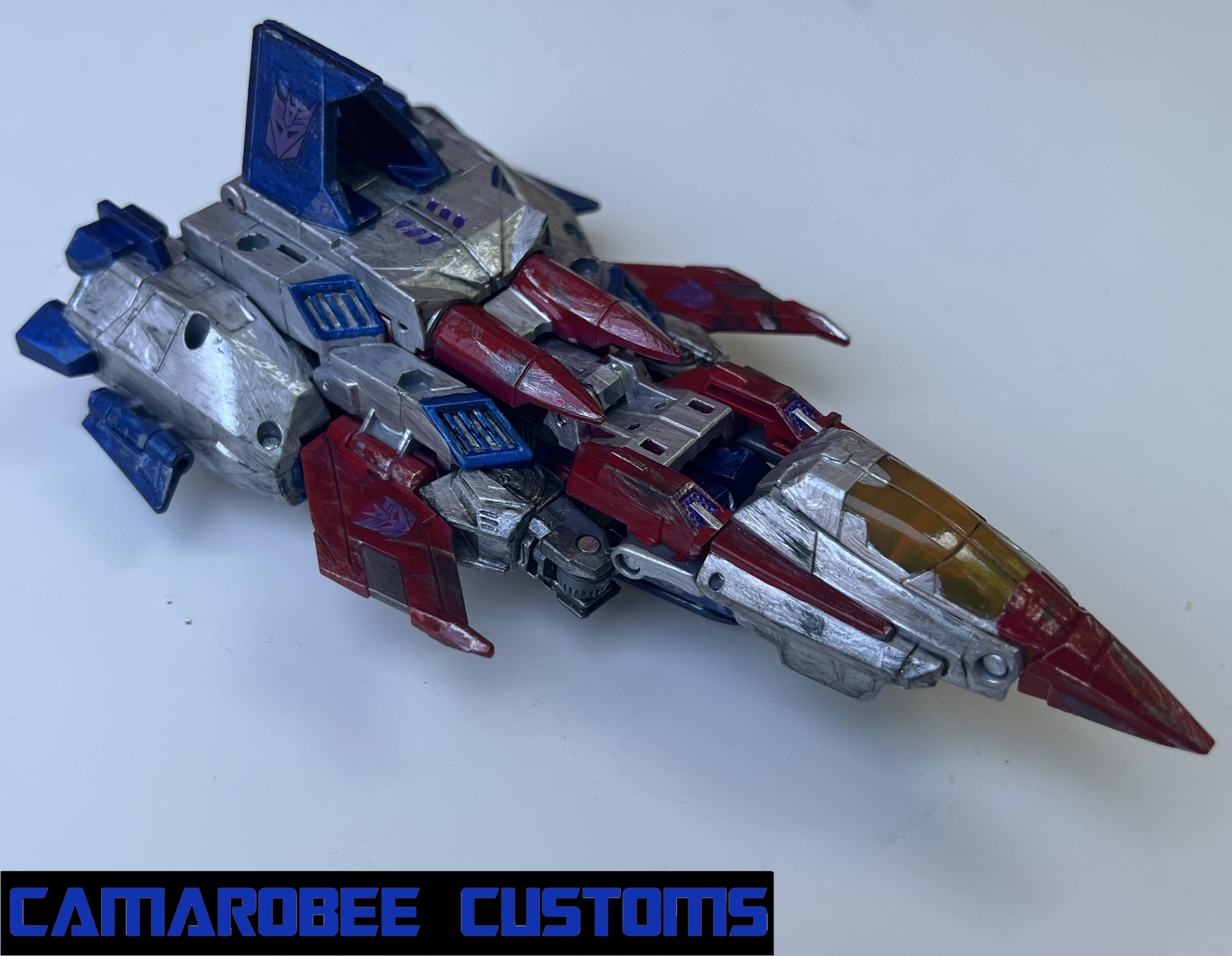 I started off Starscream with new base colors - silver replacing the gray, and a new metallic ble and red for the primary colors. I did some detail work with metallic purple to recreate the dark energon glow effect, and then went into weatherign with some wash and primarily dry brushing with silver and gunmetal.