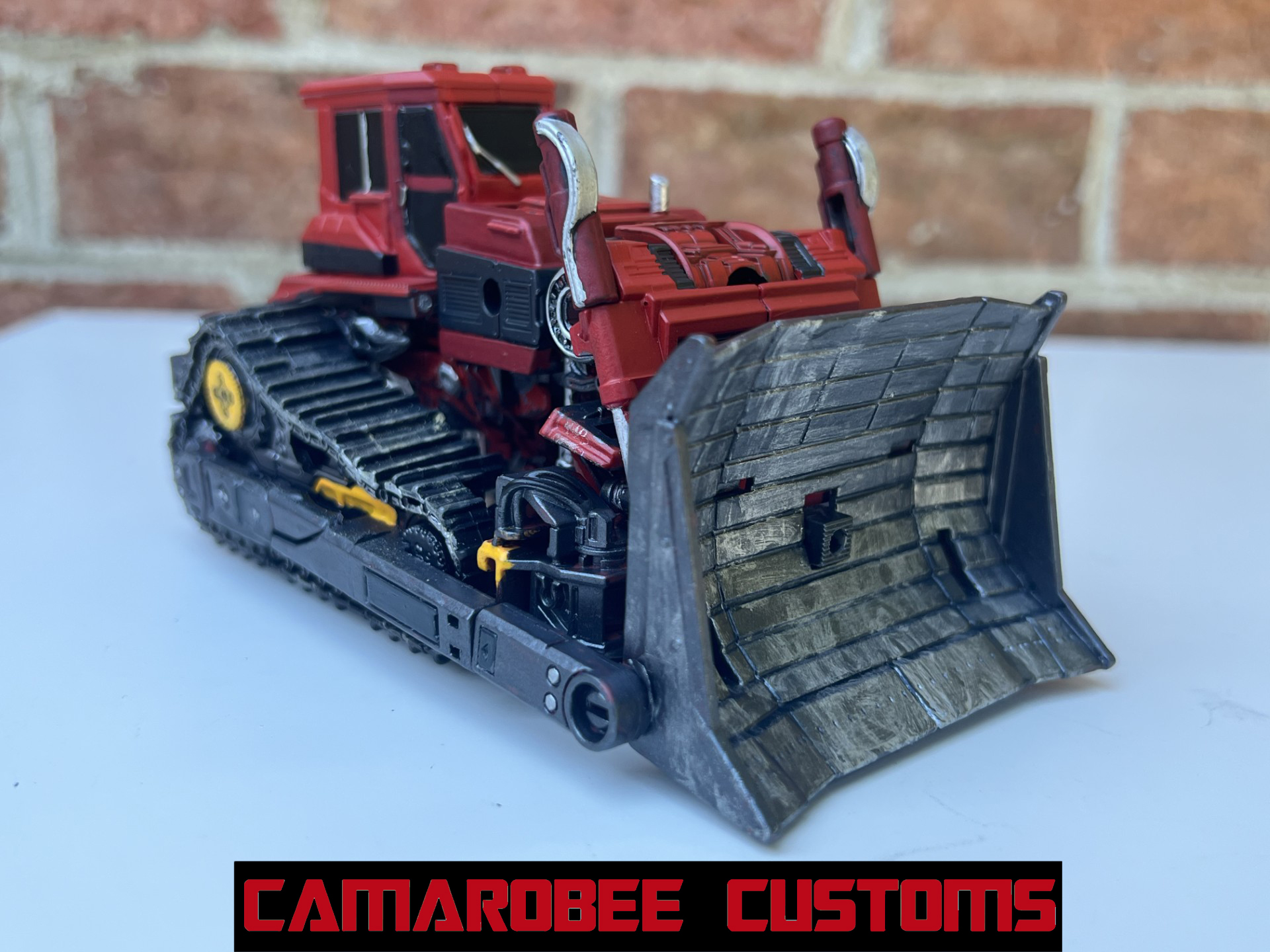 While Rampage's robot mode is pretty weathered, vehicle mode is largely clean, with the exception of wear on the treads and plow sections. I started with that same new red base coat for alt mode, and painted the plow section in gunmetal. Rampage also has some yellow sections in alt mode that I was able to add, and I think it's cool that, like in the movie, these yellow parts don't appear in robot mode (at least not from the front). I also painted the sections between the panels on the plow in black to try and highlight the distinction between them, and then did some silver dry brushing for wear. The treads got that same dry brushing and some desert sand weathering to fit the scene.
