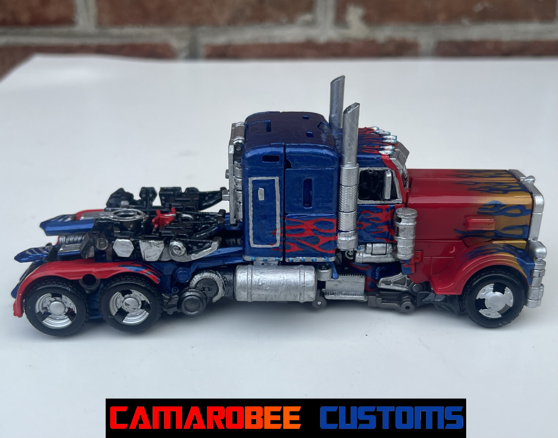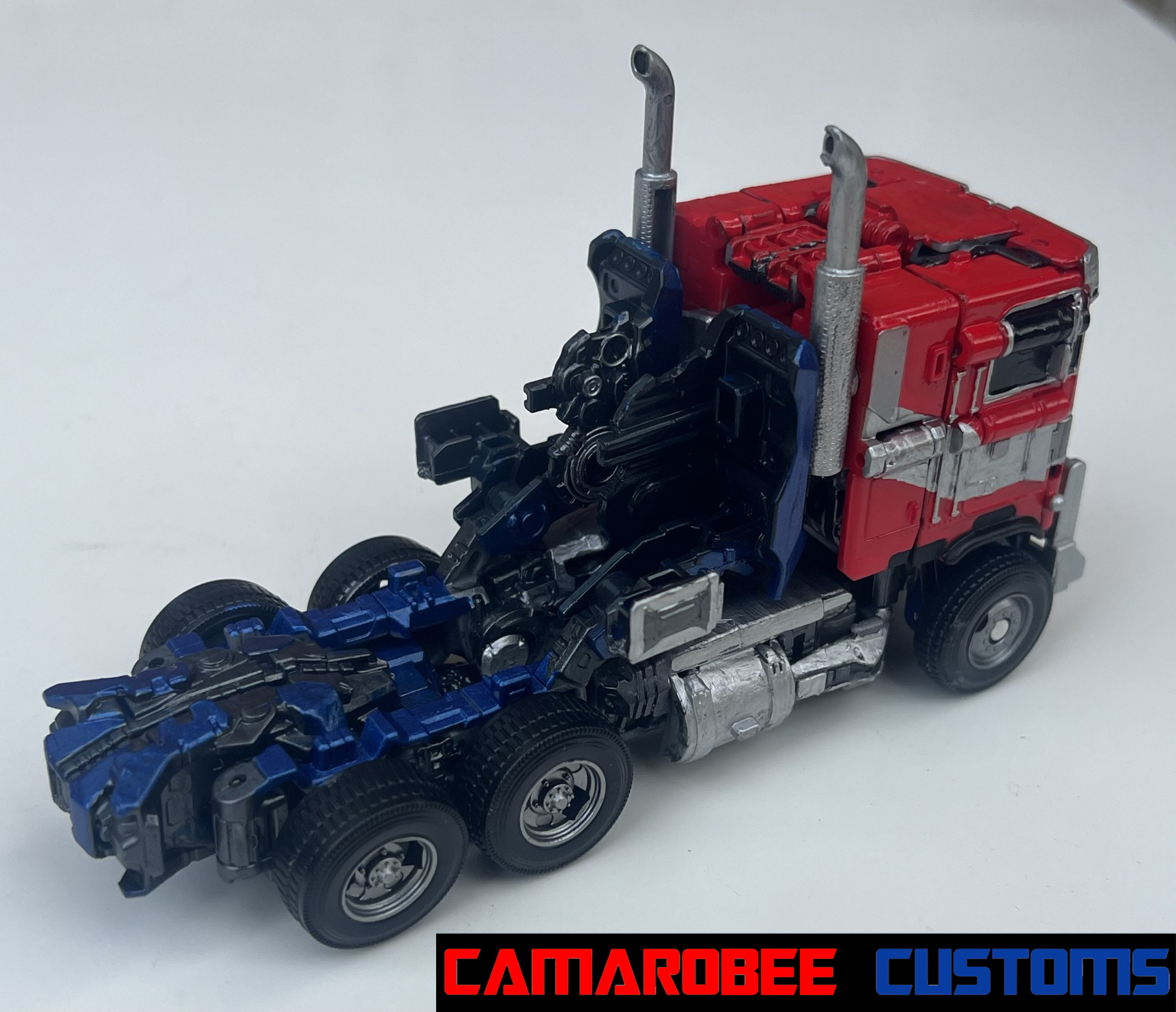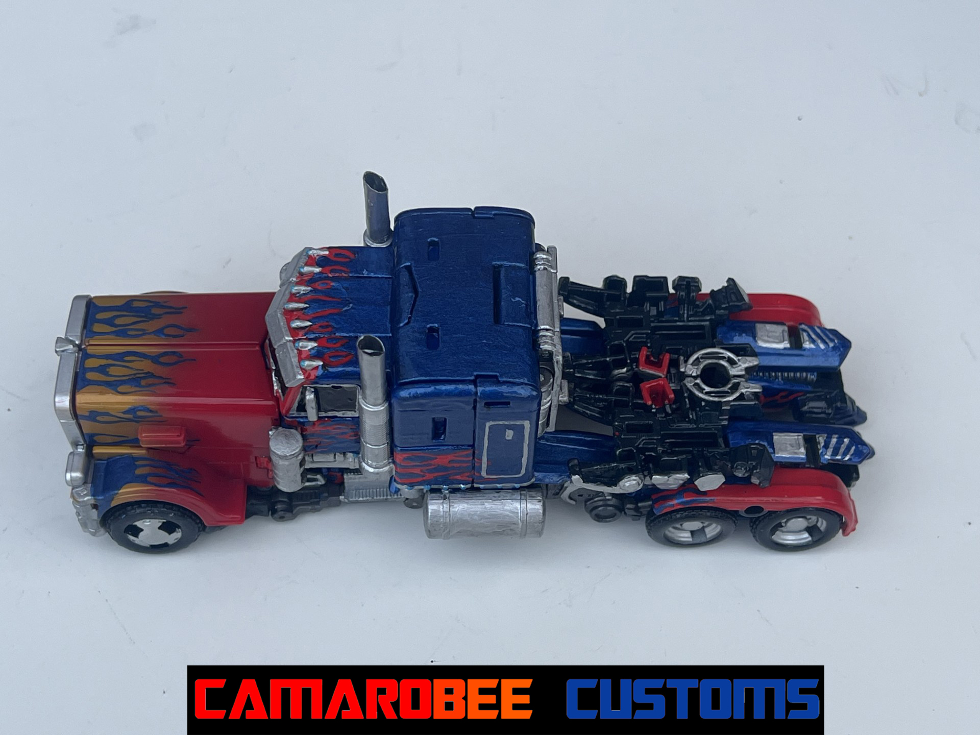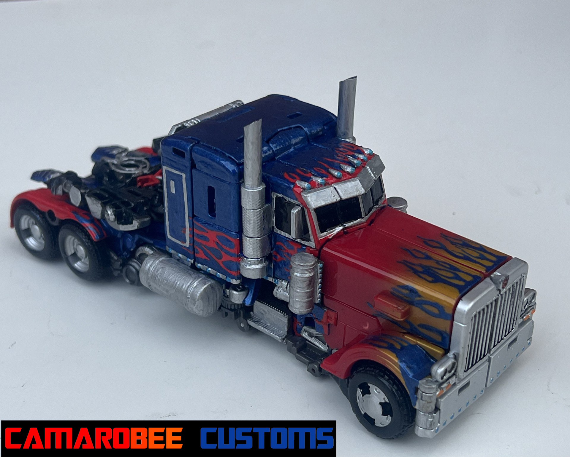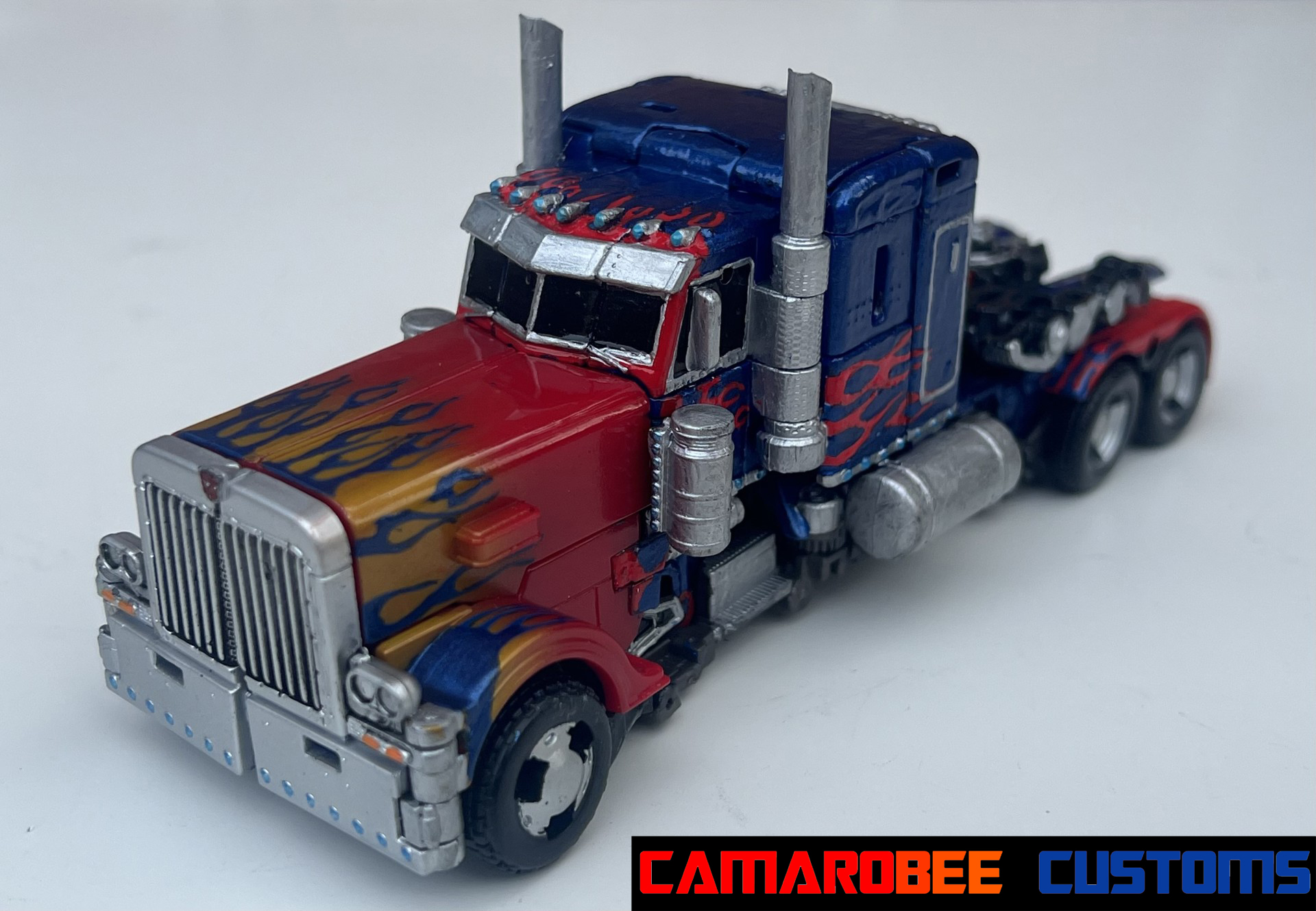 For alt mode, I started off with gloss red and a similar blue mix to my last few Prime customs and repainted all the original red and blue sections. I then went and added new flames, both the layered ones over the back wheels and the small ones over the side windows. I also redid the flames over the front wheels to get them more accurate. I then repainted the side sections and exhaust pipes in silver with some gunmetal accents, and moved to detailing with the silver pieces all over. I repainted the lights on the front with black, silver, and orange, and painted the grill with black and silver. For the truck bed, I painted it primarily in black and silver with red lights on the back. The final gloss coat really amplifies the metallic blue paint, completing this mode!
