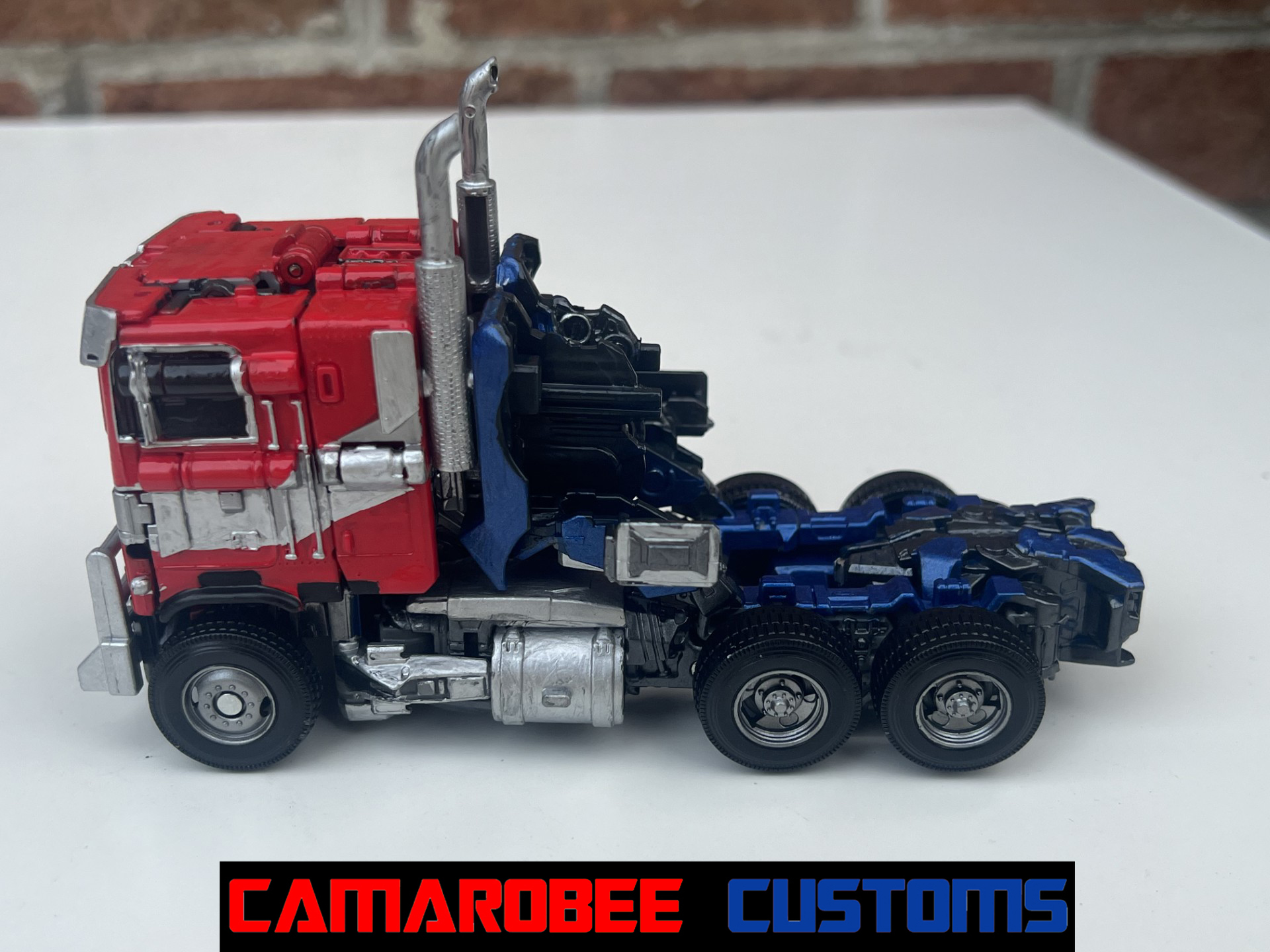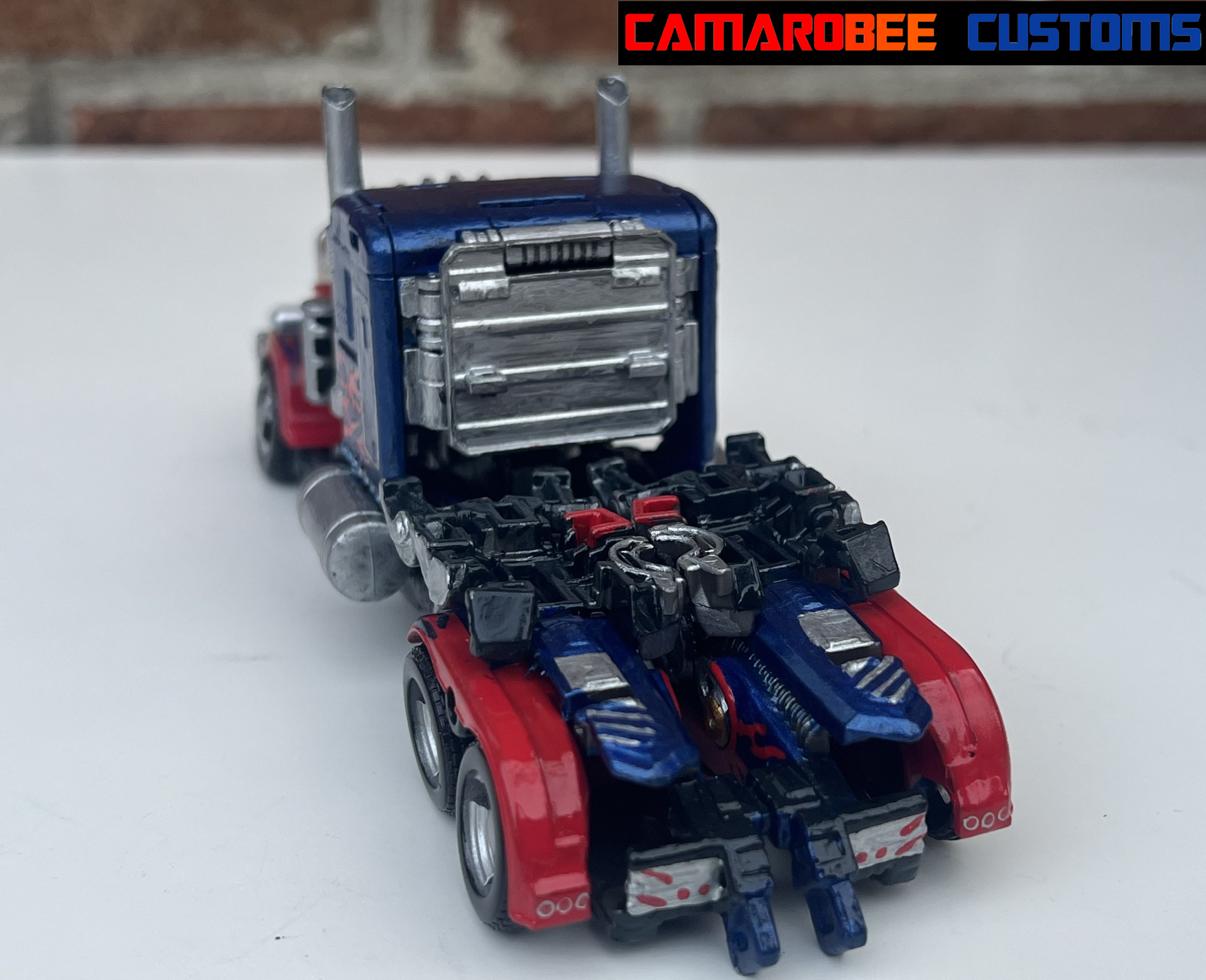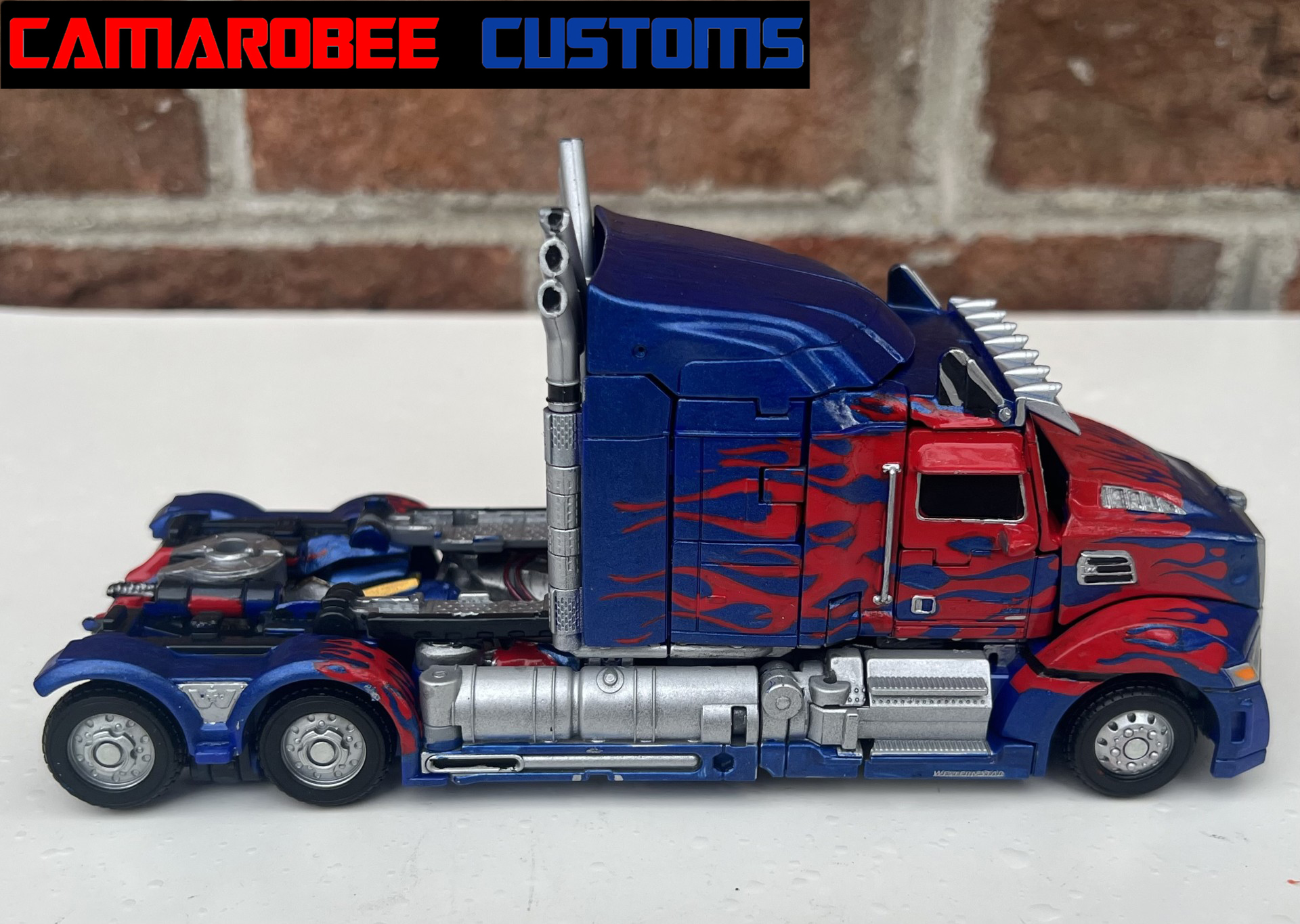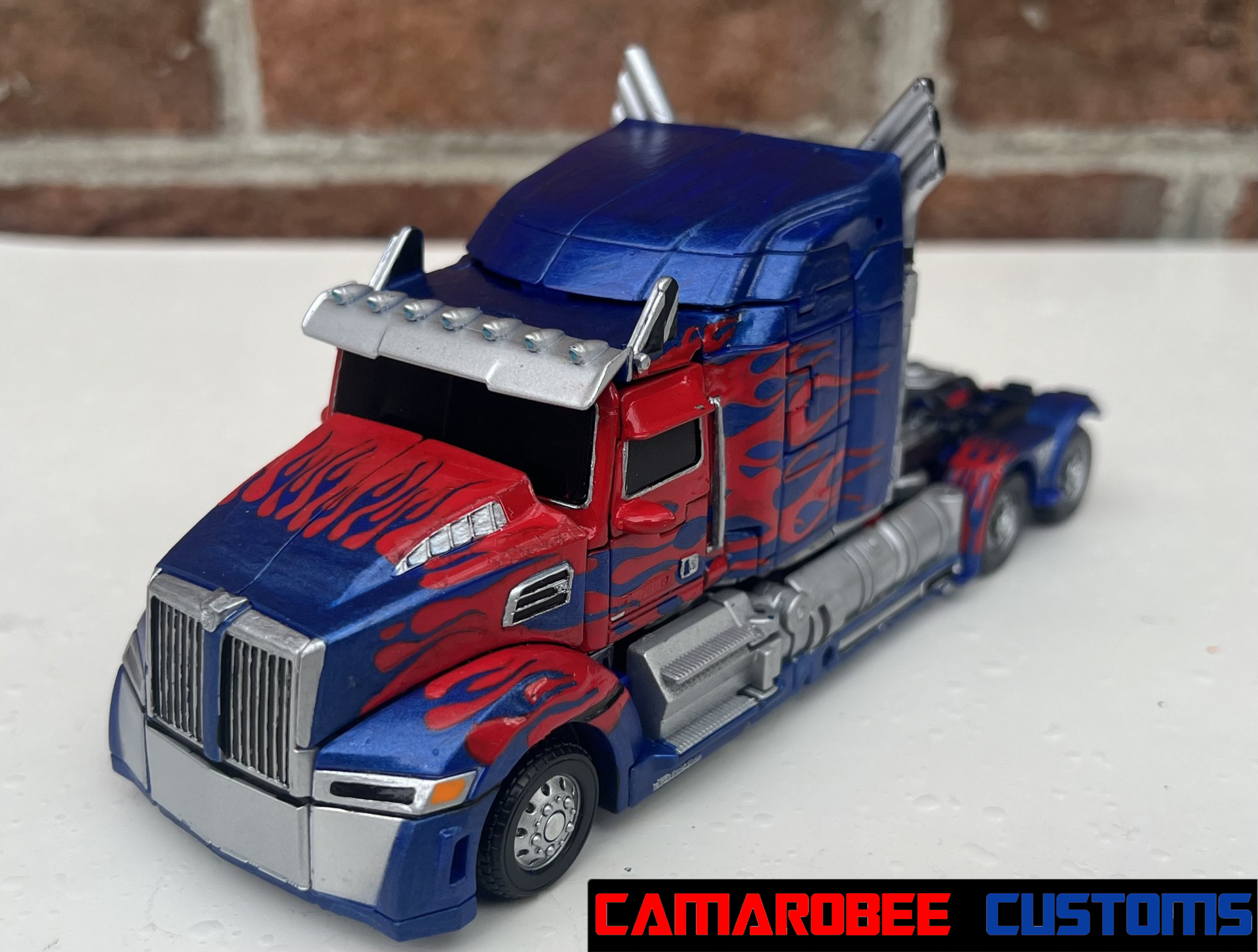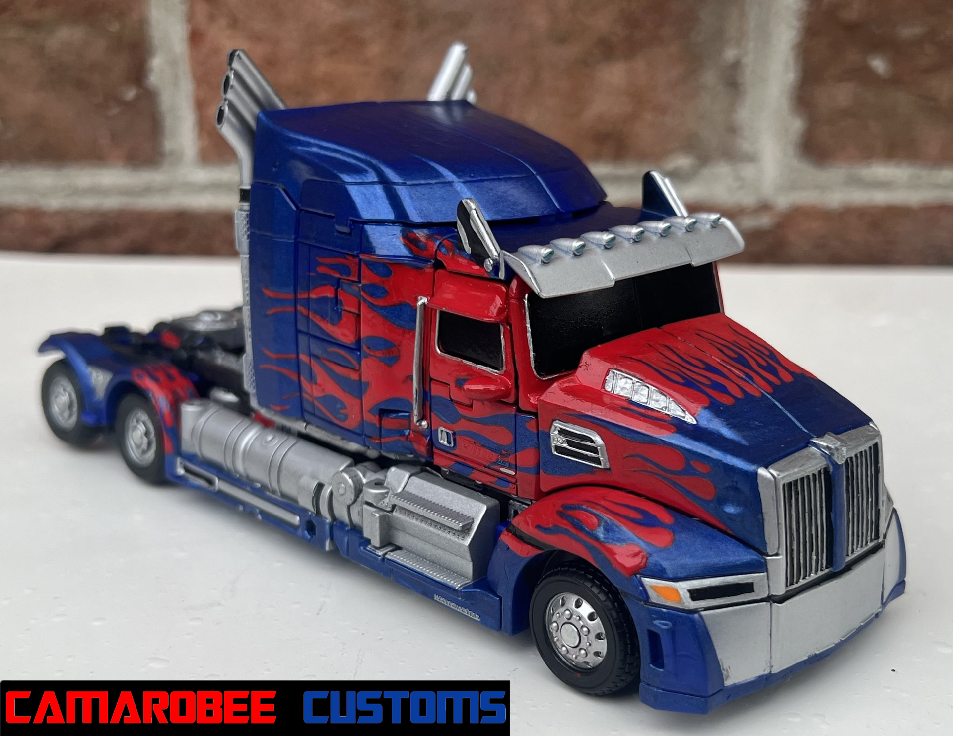 For alt mode, I started off with gloss red and a similar blue mix to my last few Prime customs and repainted all the original red and blue sections. I then went and added new flames, both the layered ones over the back wheels and the small ones over the side windows. I also redid the flames over the front wheels to get them more accurate. I then repainted the side sections and exhaust pipes in silver with some gunmetal accents, and moved to detailing with the silver pieces all over. I repainted the lights on the front with black, silver, and orange, and painted the grill with black and silver. For the truck bed, I painted it primarily in black and silver with red lights on the back. The final gloss coat really amplifies the metallic blue paint, completing this mode!
