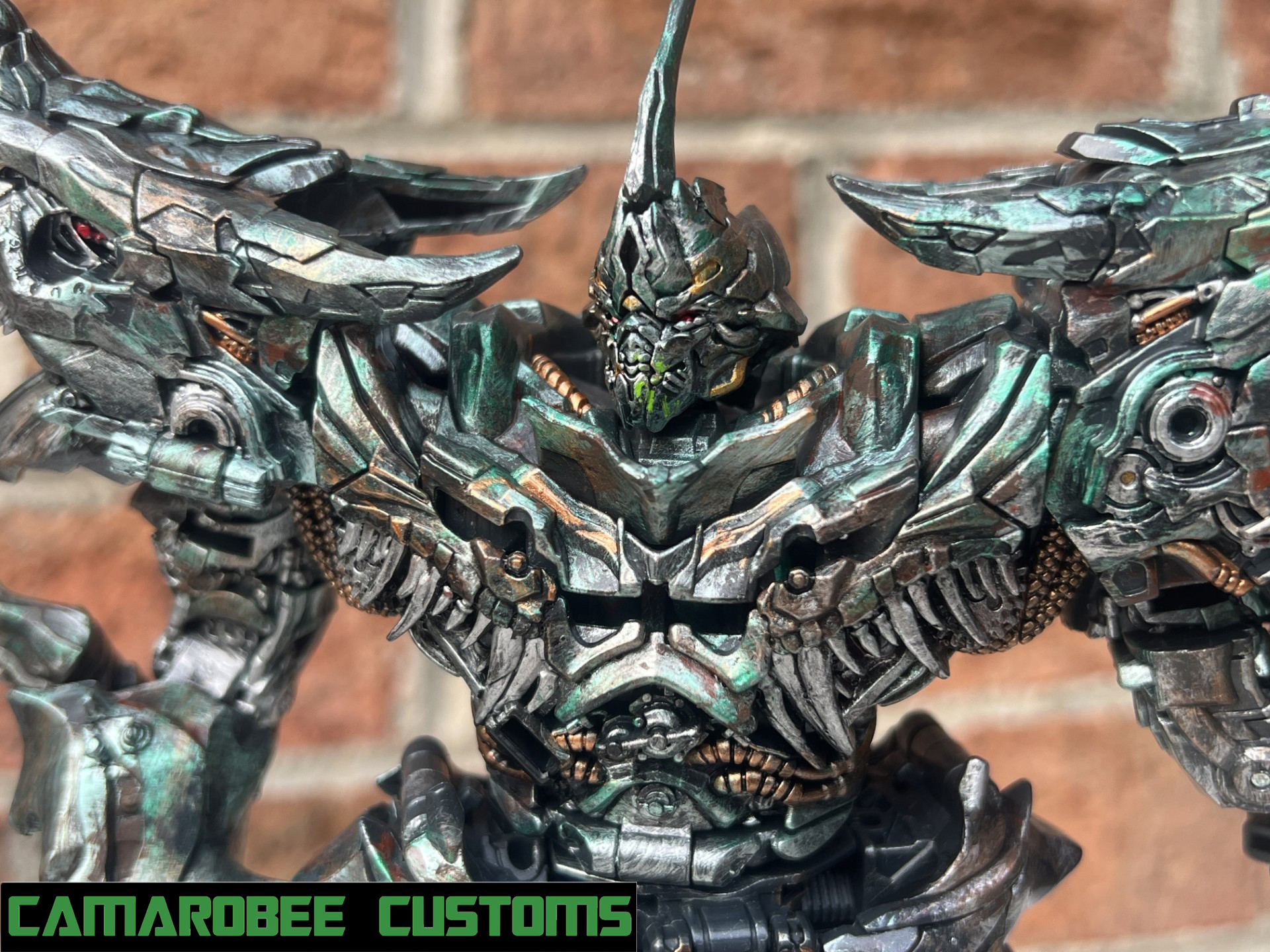 Grimlock is another project I found very daunting due to the complexity of the weathering on his design. There are many different components that make up Grimlock's worn and rusted appearance in the film, which I aimed to recreate! To do that, I devised 8 different colors to make the weathering pattern that I layered multiple times each: a vibrant metallic green, a duller metallic green, silver, copper, rust, dirt, model wash, and gunmetal. This approach wasn't uniform, the skirt armor and upper legs don't have green and have much more rust and dirt while the upper body has more green. My favorite detail I added is the green Energon on his face from where Prime punches him!