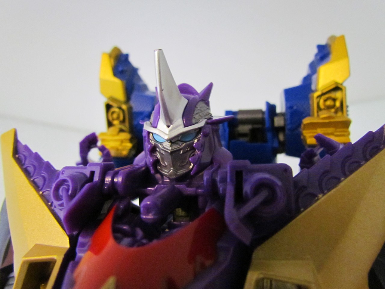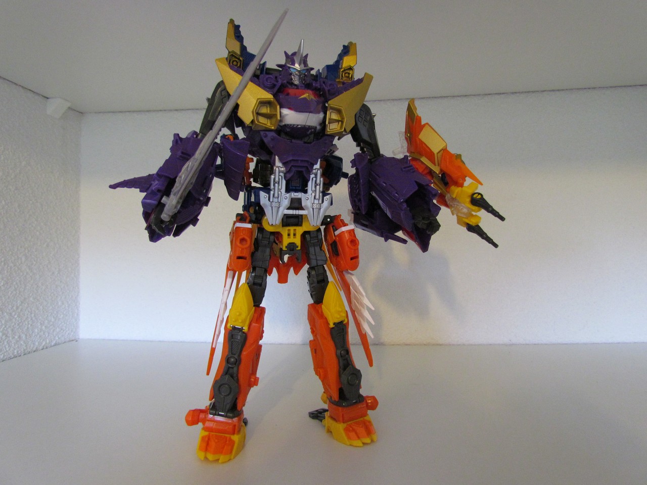 Same as Energon's Prime, despite all his problems he is a fun toy, he has an awesome headsculpt on the smaller robot, he has a dragon head as combined mode and two gigantic Cloud-like swords. It easily compensates for a weak dragon mode, a plain train mode and skinny legs when combined.