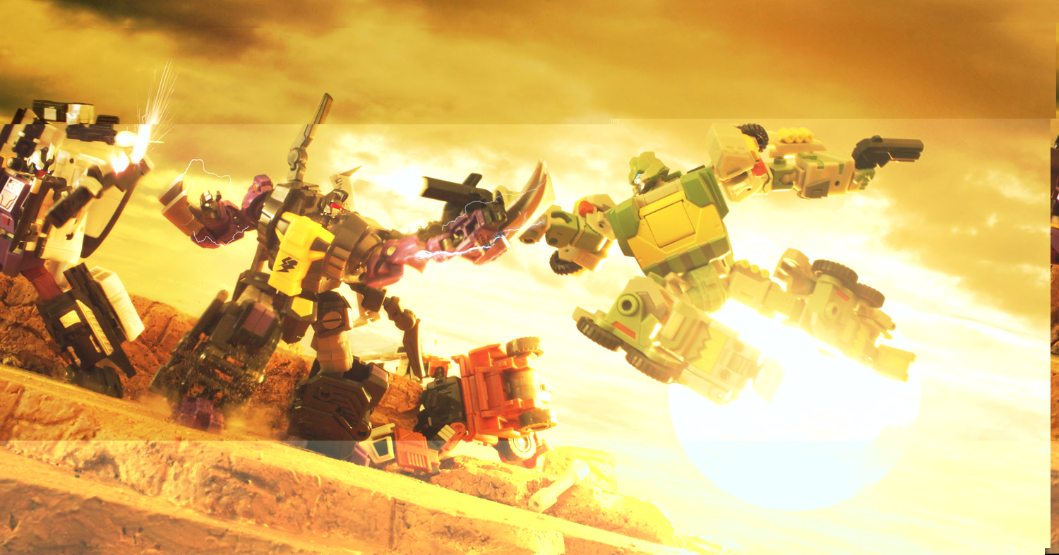 FansProject Warbot Defender, Thundershred, Warcry, and Flameblast in action. Check out http://www.flickr.com/photos/dremerc/ for higher res and other works.