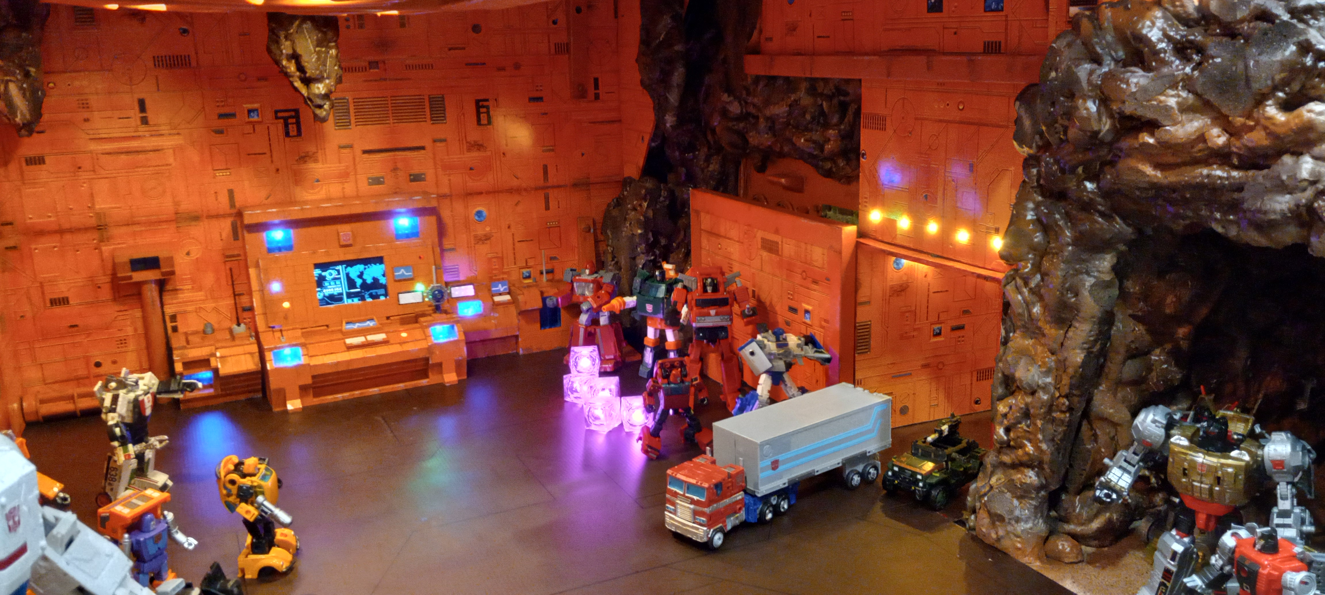 So without further ado, here it is. It is a behemoth, 8 feet long x 4 feet high x 4 feet deep. 3 display platforms that come together to form 1 giant diorama/playset. Moving parts include the Teletraan-1 viewscreen, computer module on the side piece, sliding blast door, a rotating turret under the outside tunnel entrance and a removable sky spy. LED lighting includes the Ark interior ceiling, and the tunnel and entrance walls with a traditional outlet plug.