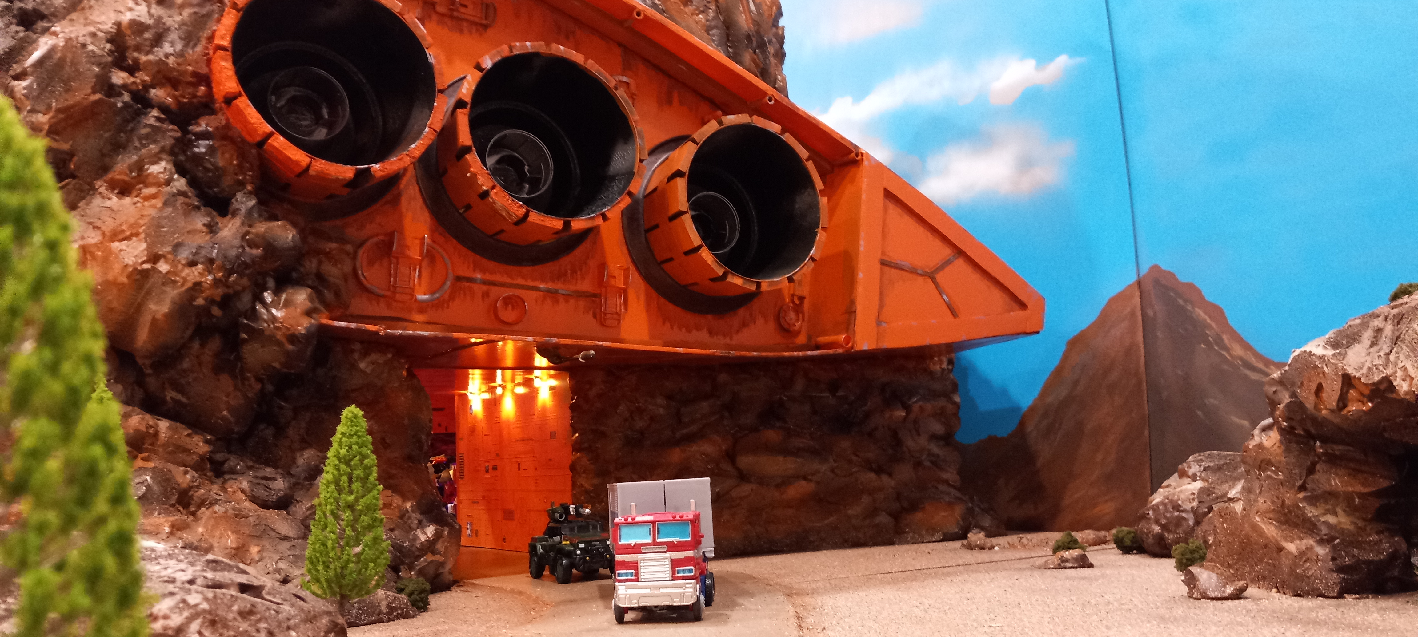 So without further ado, here it is. It is a behemoth, 8 feet long x 4 feet high x 4 feet deep. 3 display platforms that come together to form 1 giant diorama/playset. Moving parts include the Teletraan-1 viewscreen, computer module on the side piece, sliding blast door, a rotating turret under the outside tunnel entrance and a removable sky spy. LED lighting includes the Ark interior ceiling, and the tunnel and entrance walls with a traditional outlet plug.