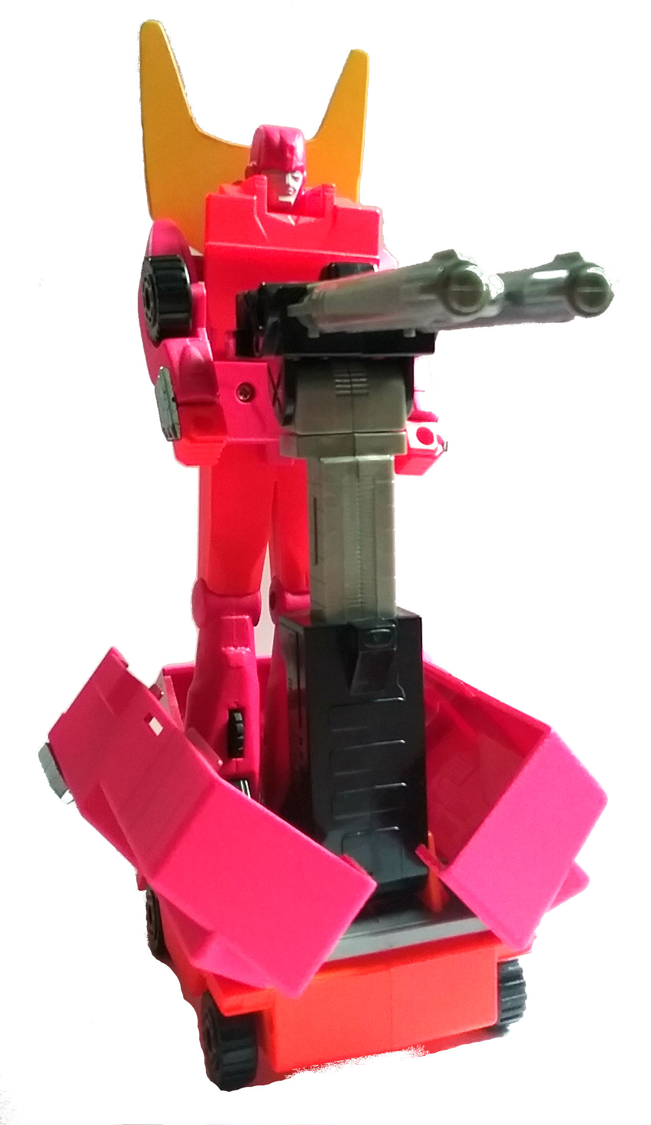 My final G2 entry (at least until I find more G1 junkers). I've been wanting a pink and orange Hot/Rodimus Prime since '86. Since Hot Rod was more purplish in the G2 comics I decided to go with Rodimus. He's kinda plain without any stickers but until I decide on what colors to use (and get my printer working) these oics will have to do. In case anyone is wondering what's up with the spoiler, this figure didn't come with one. I had to cut one out of a plastic kids plate and attach it with an old Bionicle peg.