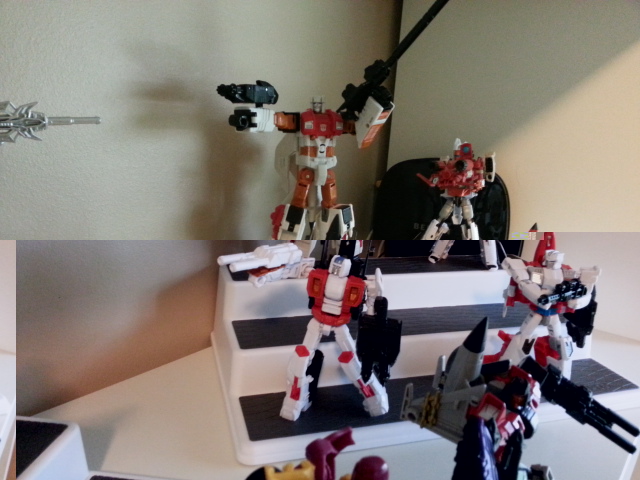 I forgot Jetfire was down there. I put him there to keep him out of the way while unpacking. Forgot he was there until I took pictures. Does look good with Prime and Magnus though. I would like to try and setup a battle scene here as well. Need more steps and a good Megatron. The Decepticons are out numbered.