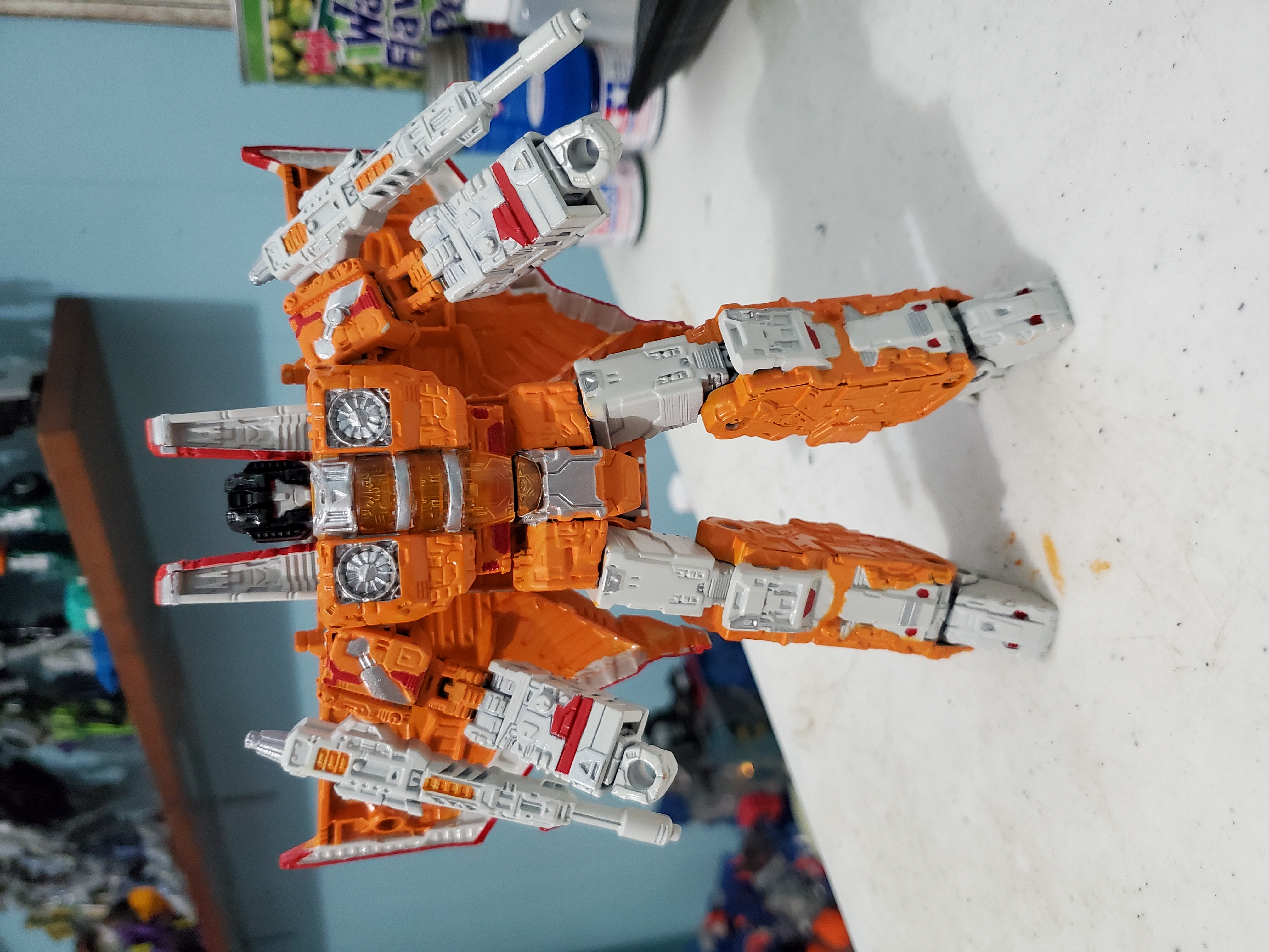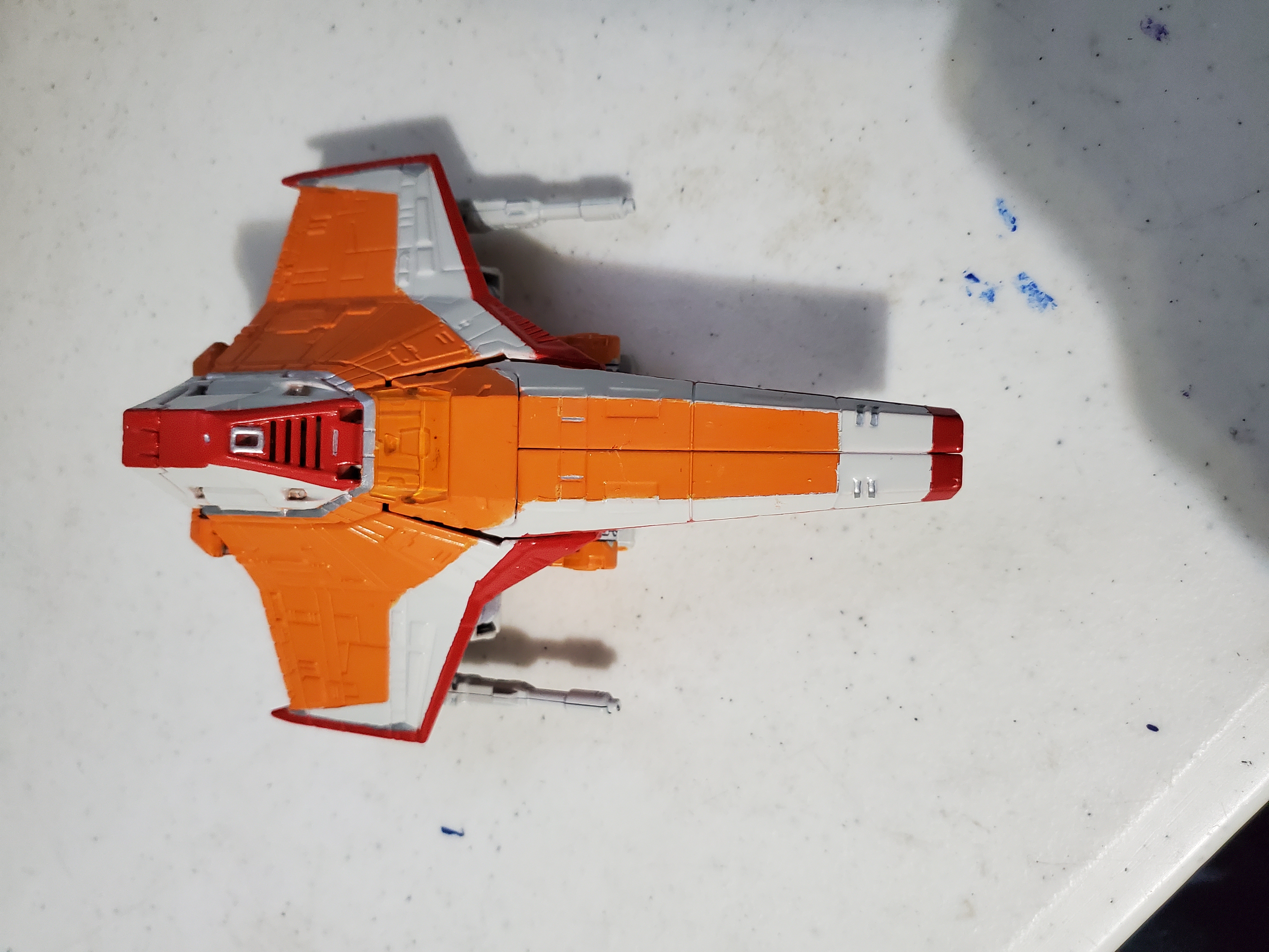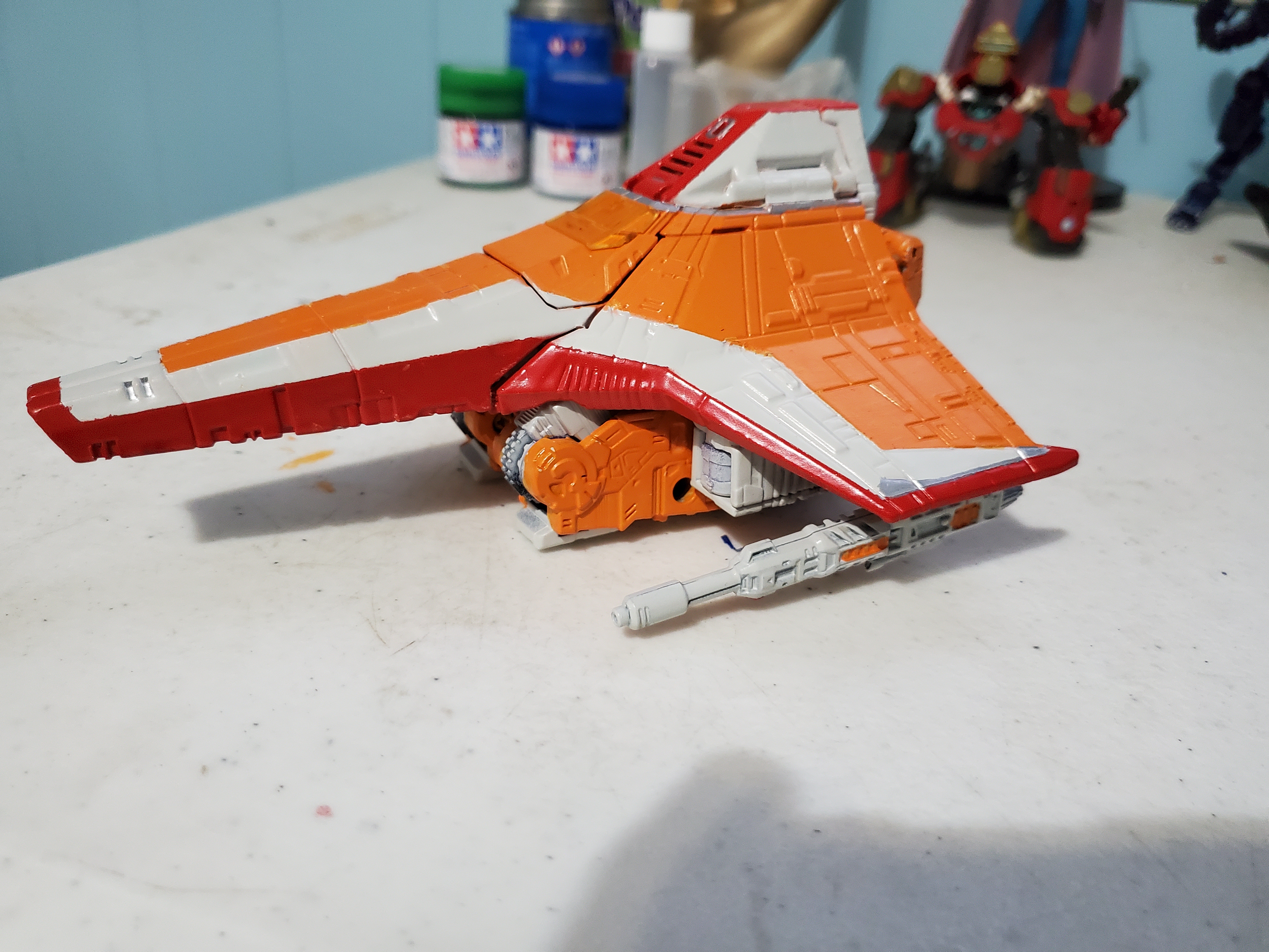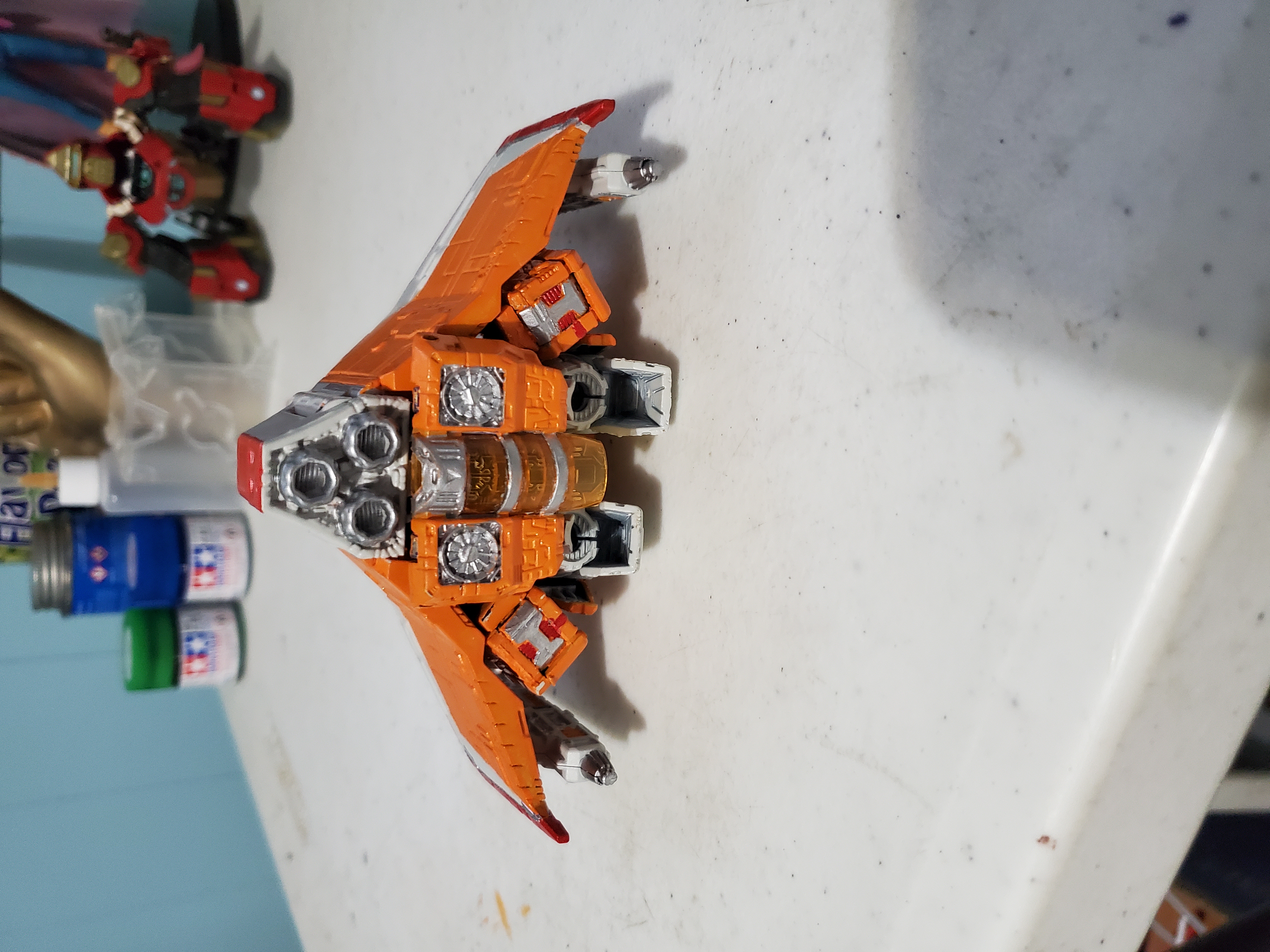Hello All! I forgot to post this here a while back. I took a damaged junker (hence the warped wings no longer tabbing correctly) from the parts bin and tried out a color scheme I had in mind. I may revisit this idea later on with a new copy, but for now, I'm pleased to add Sunstorm to my Seeker shelf. Enjoy!