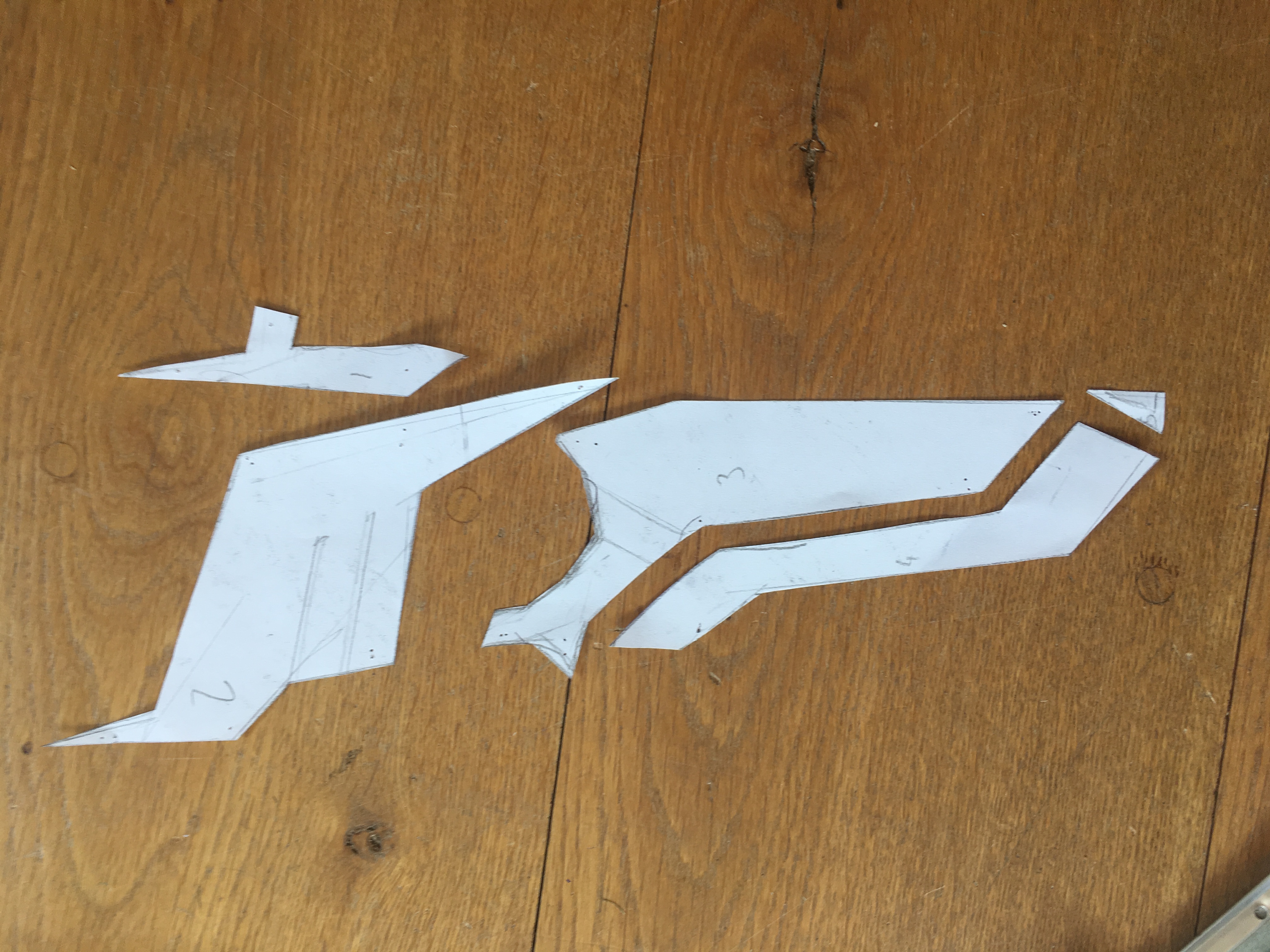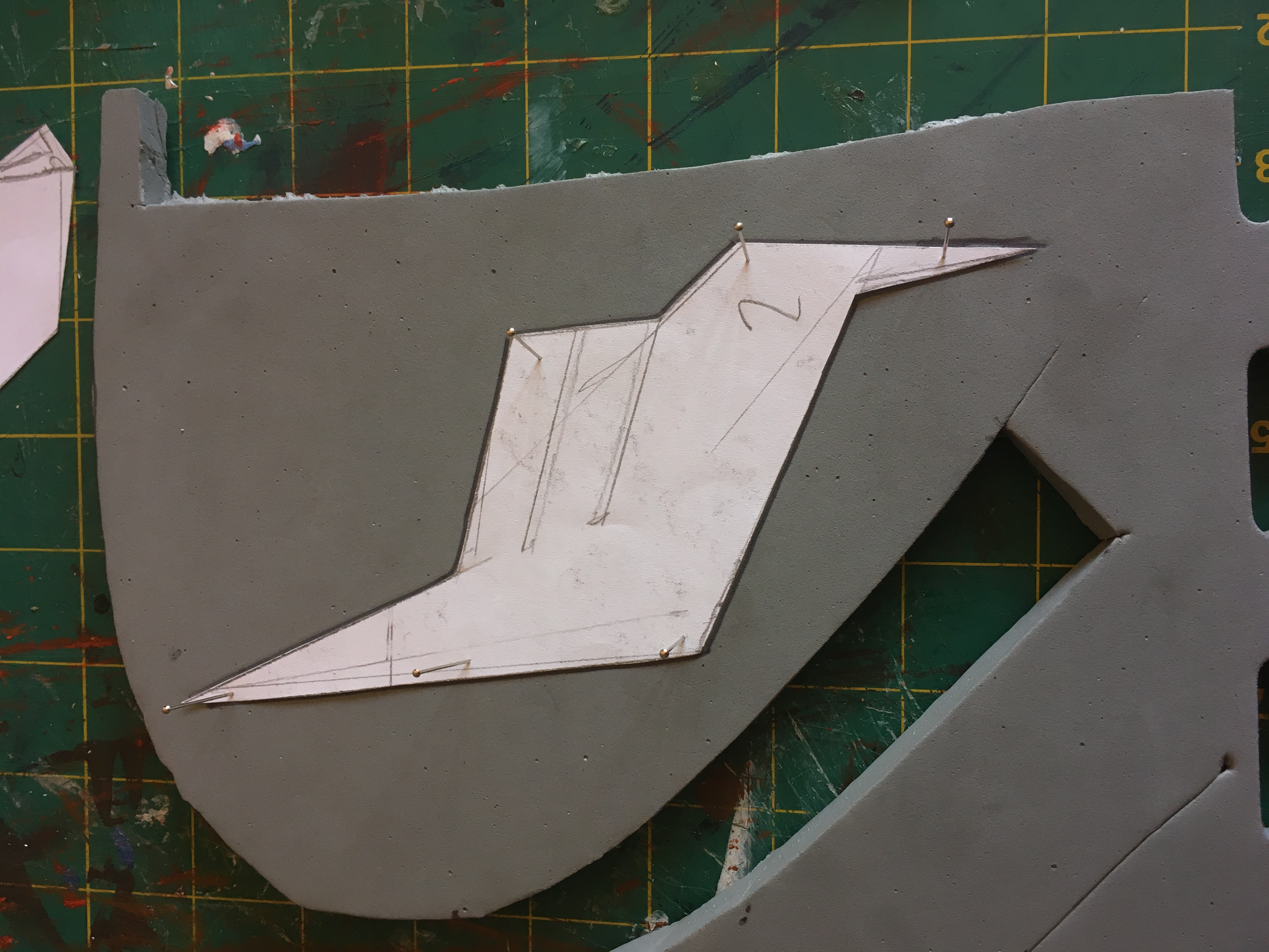 So with the template cut out, with each piece as shown, i drew around the template onto 8mm thick EVA foam using pins to hold the paper down