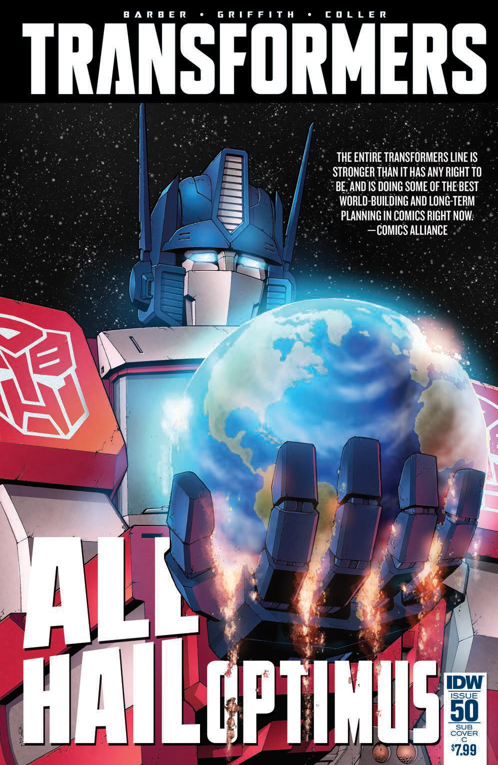 ALL HAIL OPTIMUS—PART 1! Backed by an army of zealous followers, OPTIMUS PRIME declares Earth to be a part of CYBERTRON'S Council of Worlds—and the DECEPTICONS and the people of Earth don't won't take it laying down! The story starts here, but the repercussions will last forever.