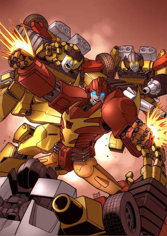 Hold on tight and strap yourself in. For the beleaguered Earthbound Autobot Tactical Response Unit, the ride is about to get bumpy. Big time! With Decepticon super-weapon Sixshot meting out the punishment, they're all looking distinctly like an endangered species. And it's not much better for Hot Rod and Wheeljack... who must face the Machination's Headmasters! Seriously.