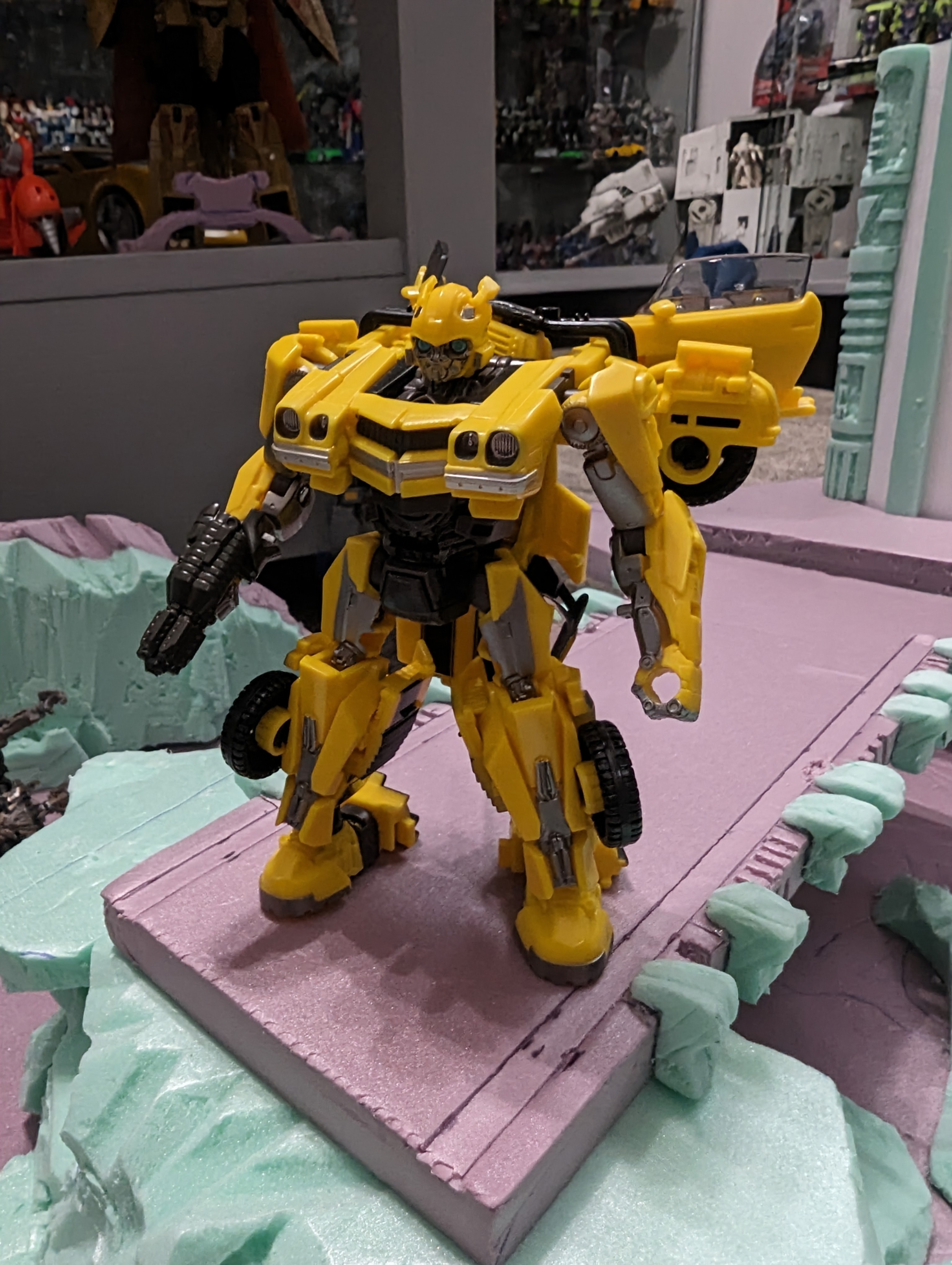 First up is Bumblebee, I bought a nice upgrade “masked” head for him. Love it, color is pretty darn close and fits well. For comparison photos if you look closely, i got rid of the front wheel pieces that stuck out behind the shoulder area. For my purpose, Im hoping to suspend BB “sort of” as he was flying down from jumping out of Stratosphere.