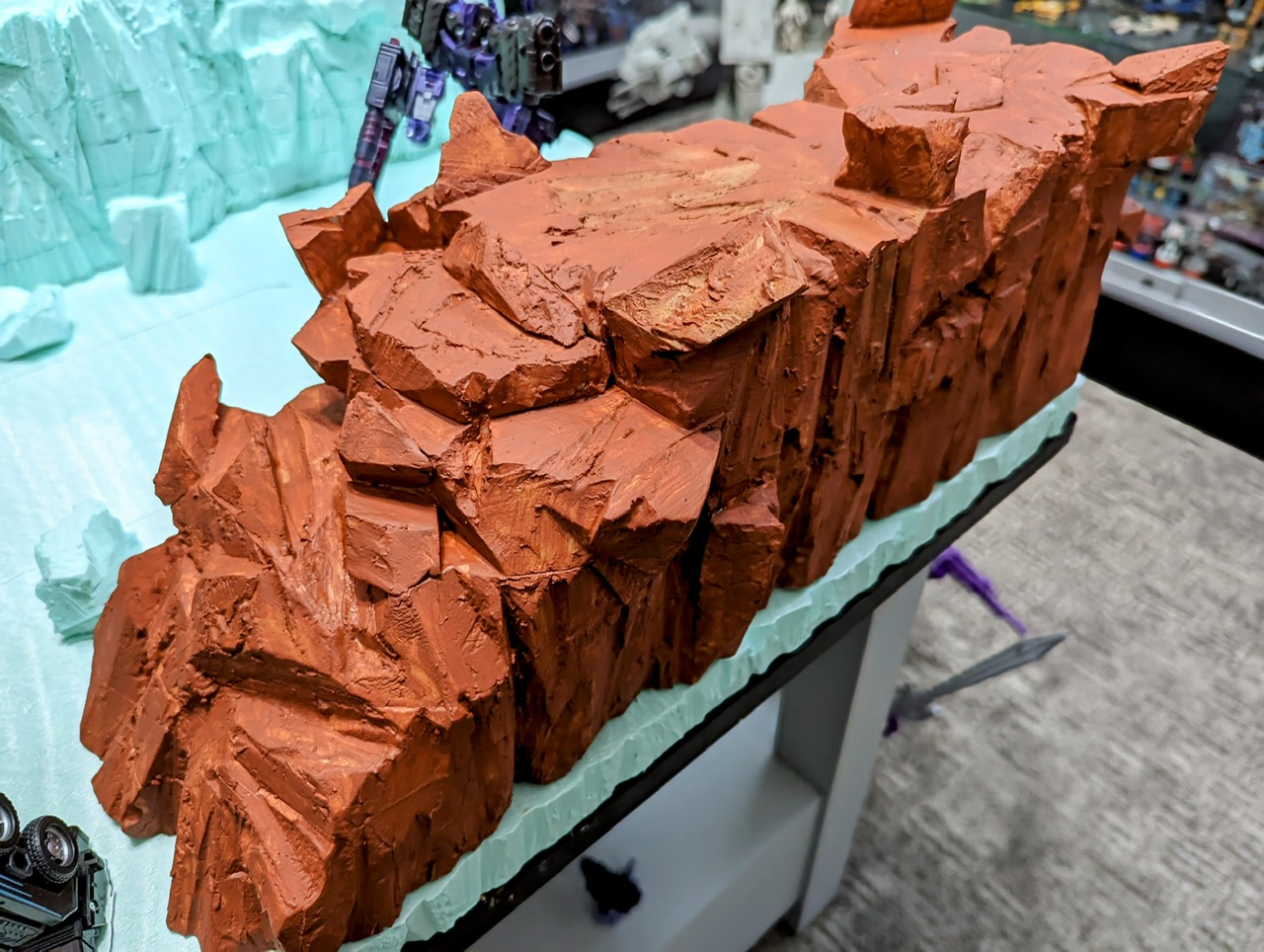 I have managed to paint right side cliff which is the base color so to speak. I took a photo with Galvatron and the Sharkticon just for reference. The last photo i have started applying the next two colors. Kind of hard to tell somewhat but as you are looking at it, the right side has been dry brushed and the left side has not. Definitely plenty to work on though.