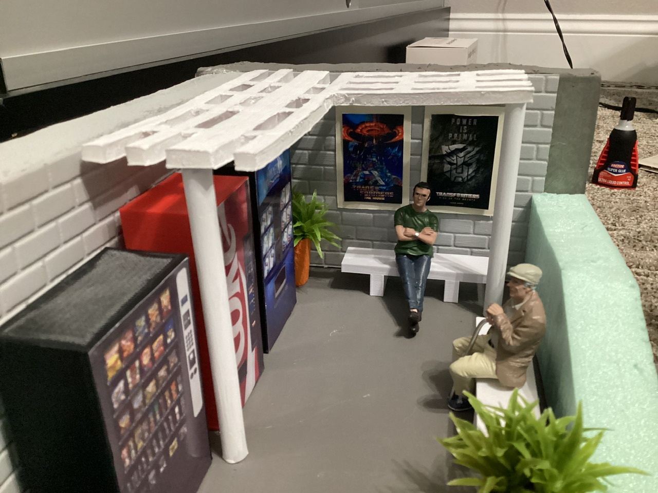 Small update with my parking garage. I have painted at least the floor areas of the ground and upper level. Tonight i worked on the upper level were i have the vending machines. The big highlight is the Transformer movie posters. A seller on eBay had a lot of 1/24 scale movie posters and I asked him if he would take request. He did and i sent him some suggestions. On the wall behind the one guy you can see the 86 movie poster and why not, something new that comes out this June. I have a couple more movie posters i will add throughout but thats it for now.