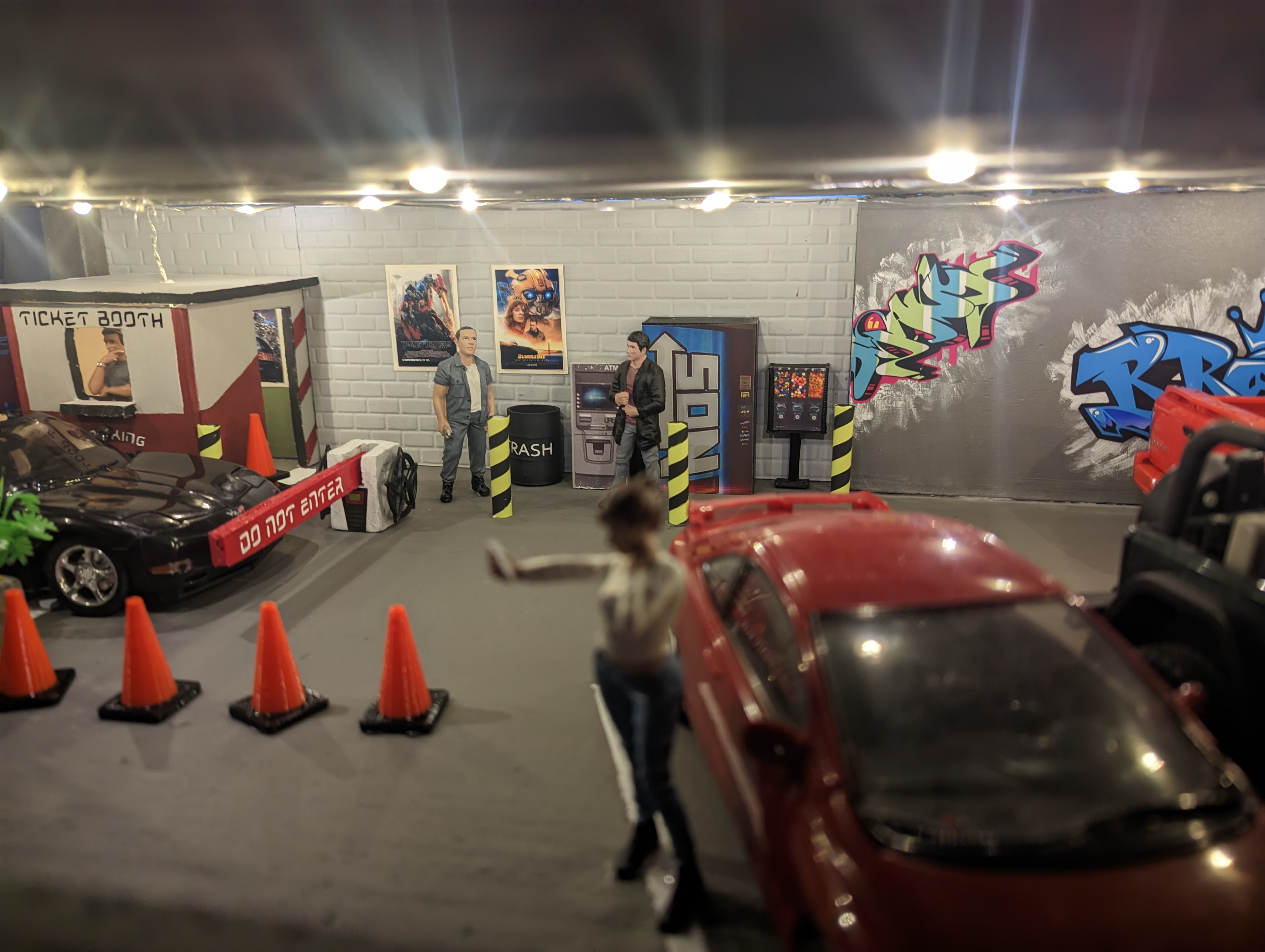 My final shots of my parking garage diorama. I put the new puck lights above the upper level and added the additional figures on the ground floor. Those would be the couple sitting in the corvette, the two to the right of the ticket booth, the girl doing a selfie, and the one by the exit door. All in all this is close to being my favorite of the four i have made at this point. Again a lot more detail put into this than I planned but without it, it would just look simple and nothing exciting to look at.