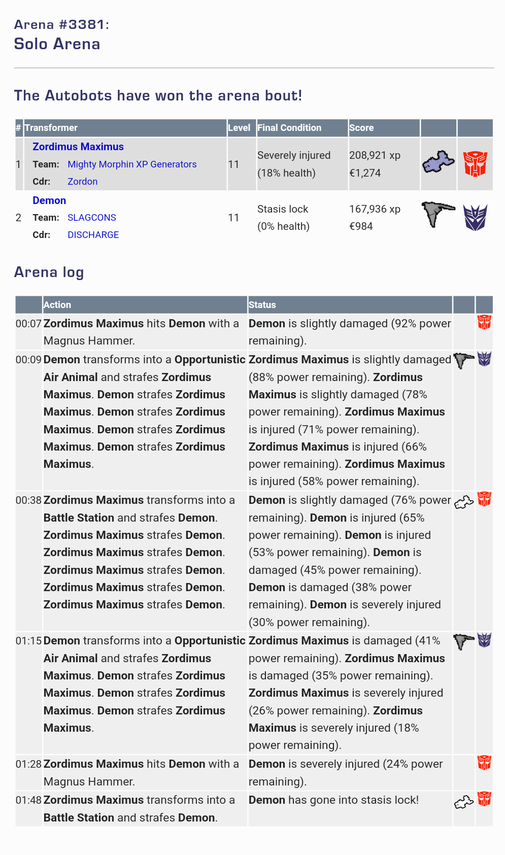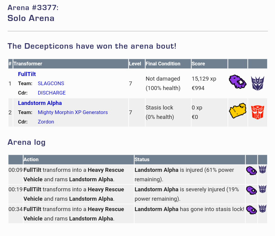 The Pits of Kaon have reopened!!! Both sides of the ongoing war between the Transformers have become weary of the struggle to survive and win the constant battles that their commanders send them into every day. Both the Decepticon and Autobot armies have called for a truce for one day, Sunday 18th April in the earth calendar. Throughout the day commanders everywhere are being asked not to enter into any mission hostilities but to bask in the glory of the legends of the before time, when one Transformer could test his skill and ability against another in the pits of Kaon.