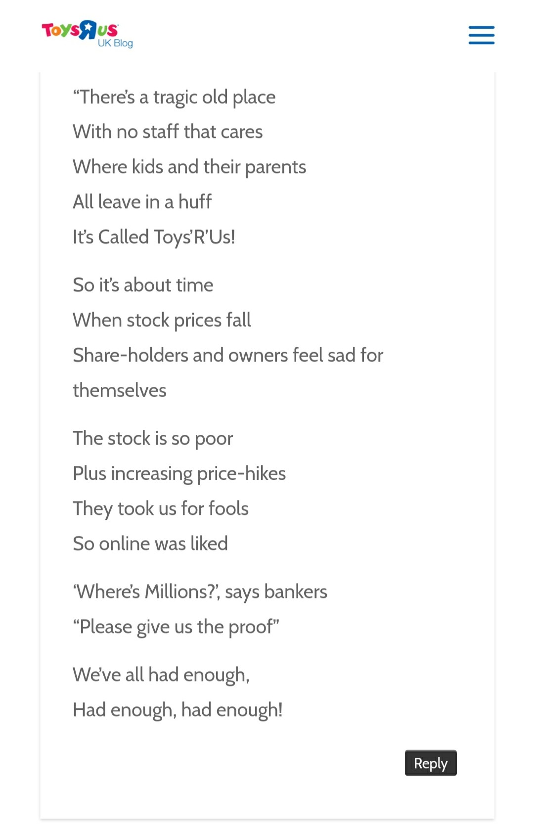 Retail experts said Toys R Us’s problems were down to a lack of investment in its stores and website. “It would be easy to blame Amazon, but the reality is that Toys R Us has been a victim of complacency,” said Natalie Berg, an analyst at NBK Retail . “As a specialist retailer, the Toys R Us experience should have been a magical one with in-store events, dedicated play areas and product demonstrations. The reality was a soulless shed.
