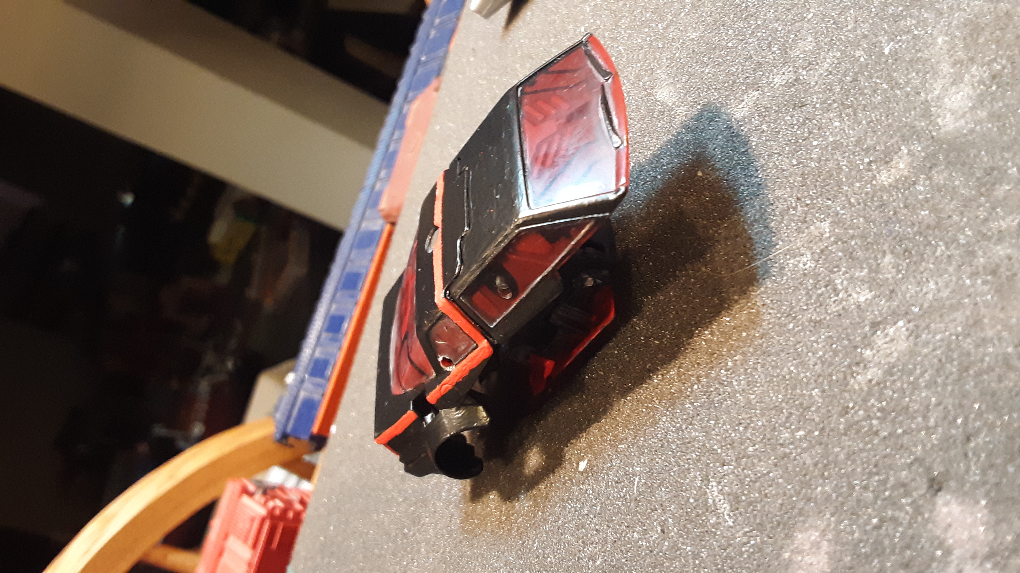 After bewildering myself at the sight of a totally unpainted piece of Transformer toy, I painted the roof and rear end of the outside, then painted the underside of the windows red so that they would still appear translucent but with Runabout's distinct colour scheme.