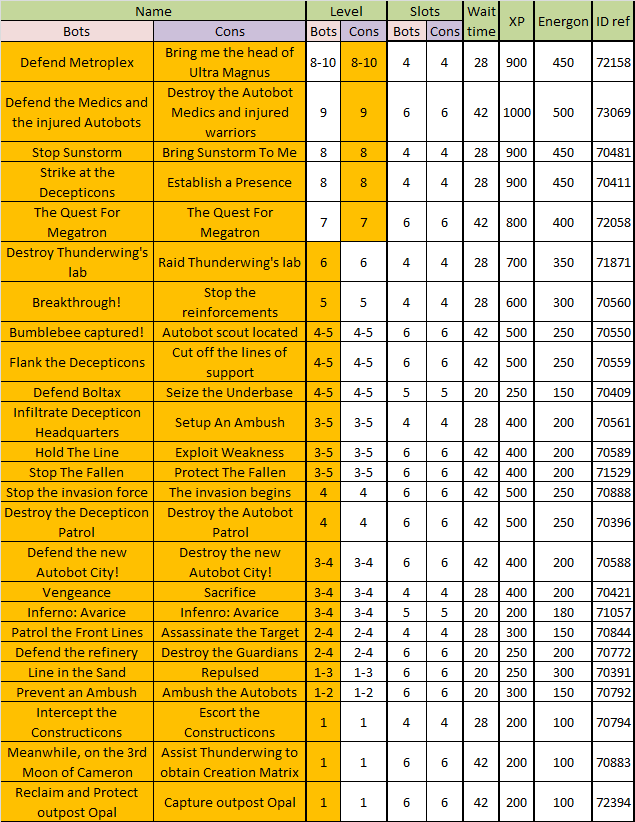 When you send me info I just need the # of Bots & Cons that can join, the XP and Energon bonus for winning, The name of the mission, the levels involved (just your side as in some rare cases it's different for the other side), and it's mission ID number to allow the other sides name for that mission (because they're usually different) to be easily obtained.