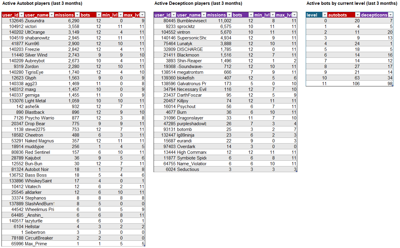 Interesting to see that the 'Cons have a slight edge in overall missions, but it's mostly concentrated on the sheer number of L11 fights happening at the top of the table.