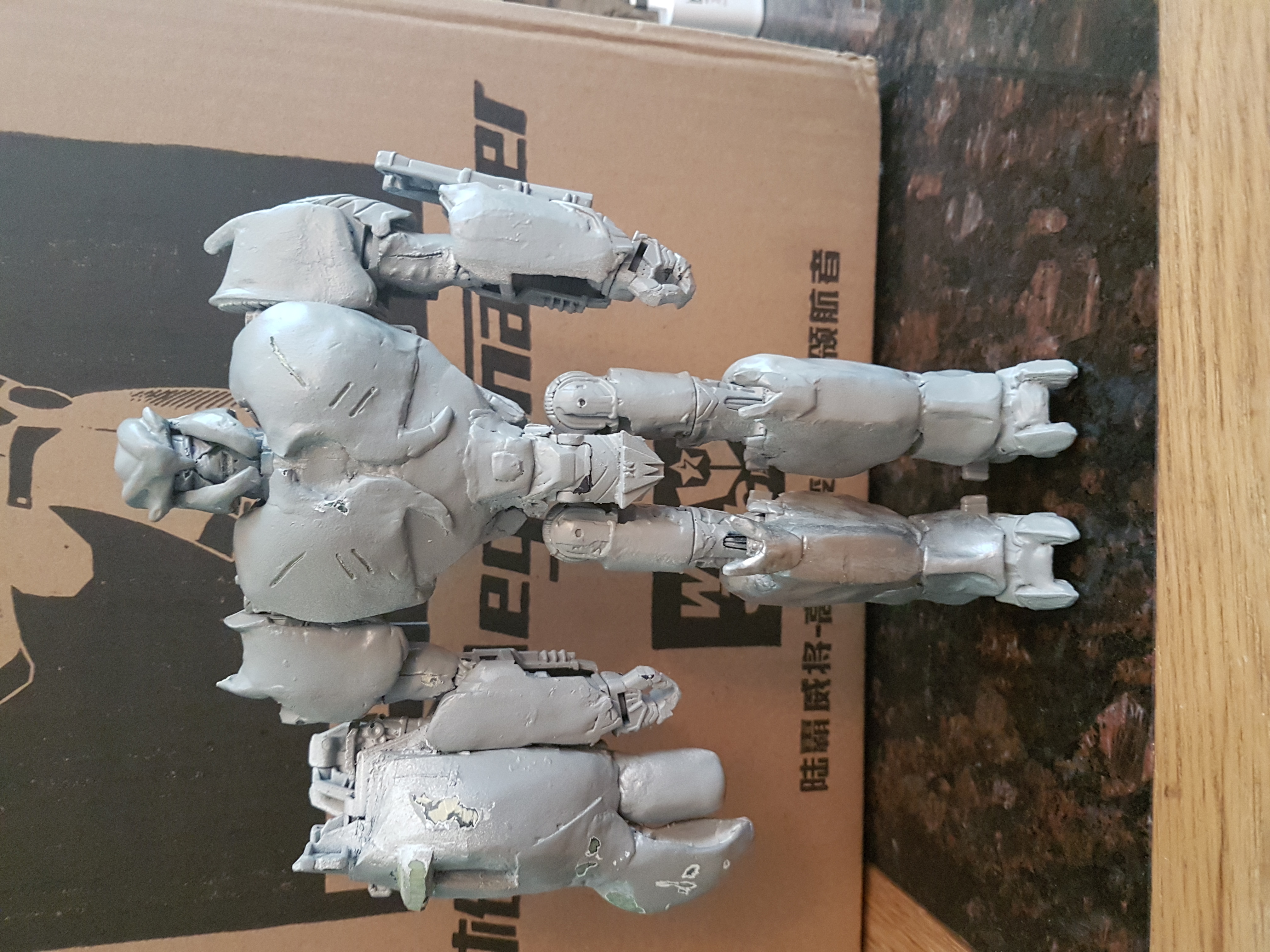 So, after a bit of a hiatus, I broke out the spray paint. Base coat and 1st coat done, the green showing through is just where I did a bit of remodelling on parts I was unhappy with. Another coat to do, then on to brushing with silver (as tested on the left lower leg) the detailing.