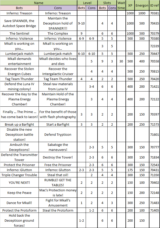 When you send me info I just need the # of Bots & Cons that can join, the XP and Energon bonus for winning, The name of the mission, the levels involved (just your side as in some rare cases it's different for the other side), and it's mission ID number to allow the other sides name for that mission (because they're usually different) to be easily obtained.