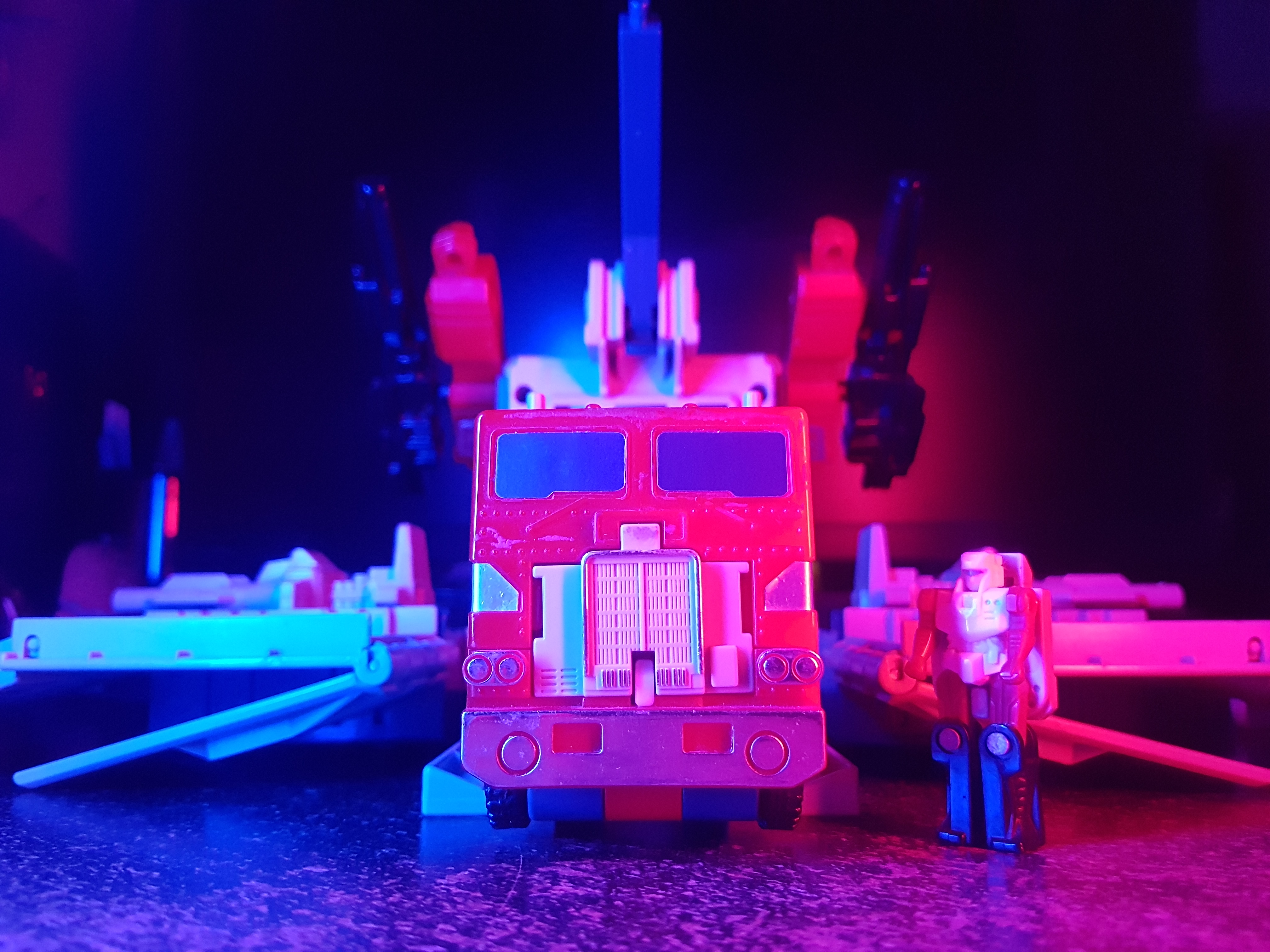 Today was the day the first episode of Transformers aired on tv in 1984. Fans on twitter have been doing pictures and fan art all day. So I took pictures of various Optimus' punching Megatrons in the face!
