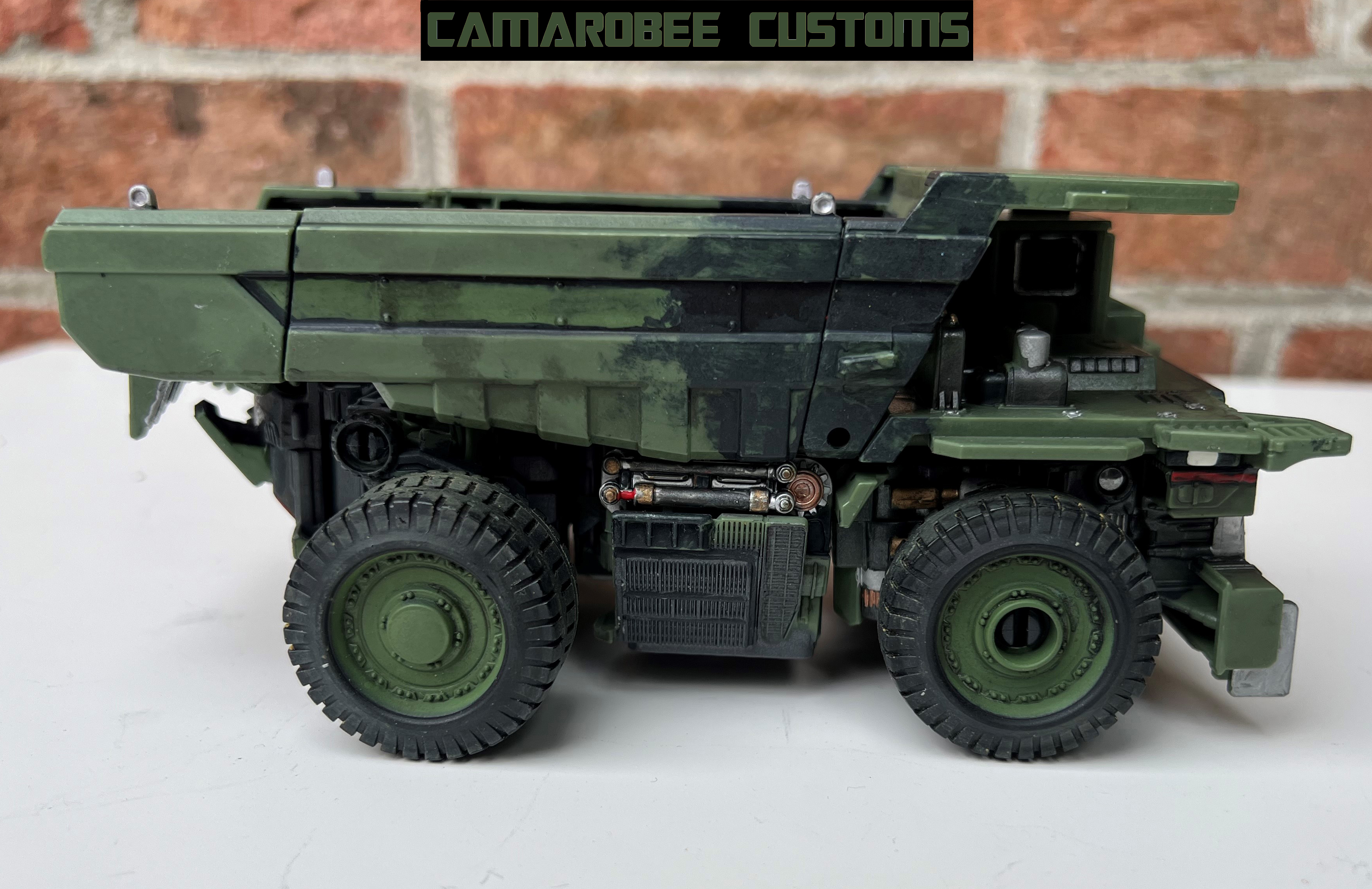 Another detail I thought about were the black stripes on the sides on the truck bed. They add some nice detail to alt mode, but they're not actually accurate to the screen-used truck. I went back and forth on removing them, and compromised by leaving the outline of the stripes but painting the center in green.
