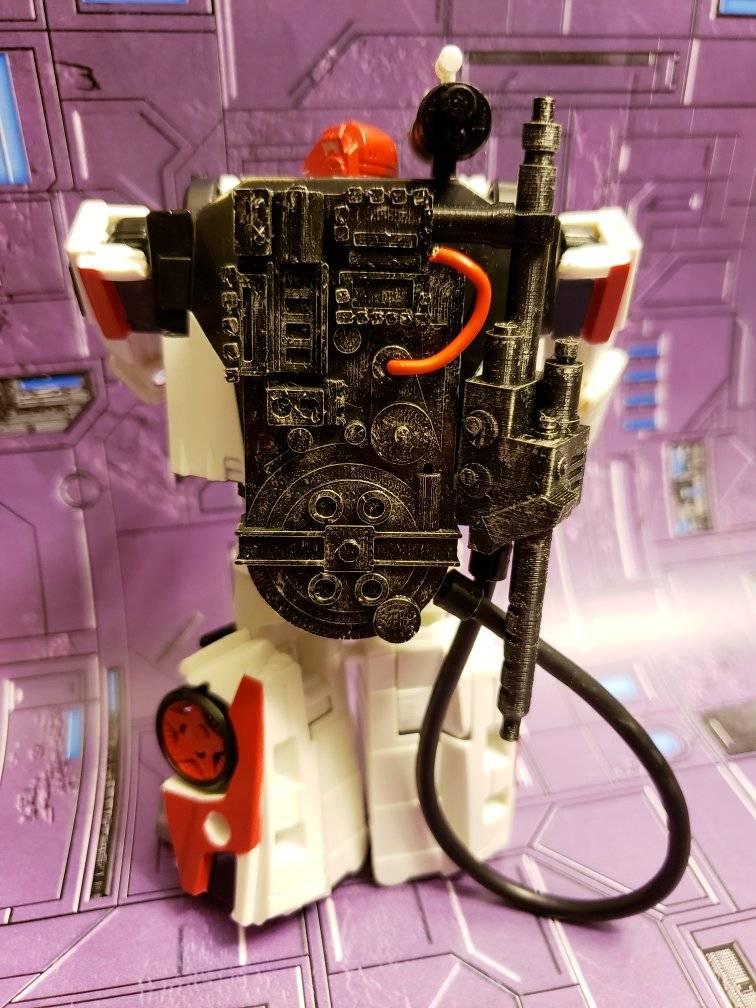 Having some fun with Ghostbusters theme and trying my hand at designing a proton pack and gun so Ectotron can have some help busting those ghosts. Did some dry brushing with silver paint to bring out the details and give a worn look. Added custom blast effect to simulate energy stream.