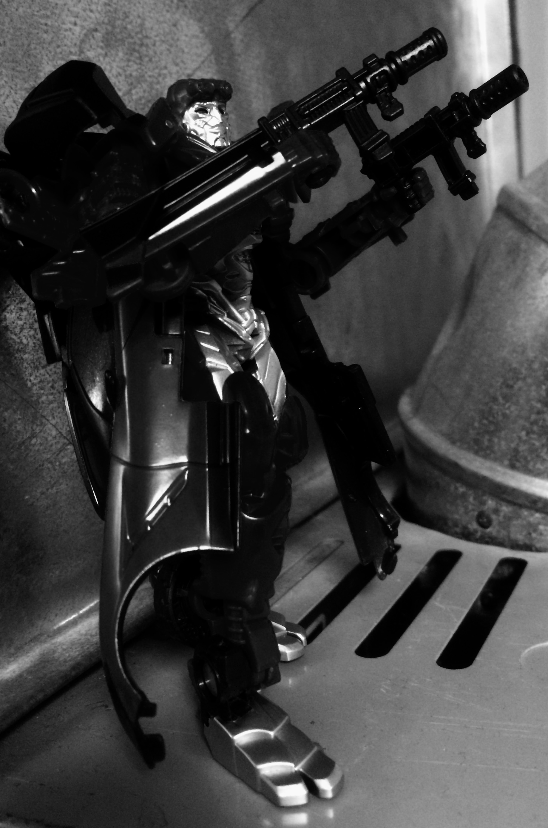 One of my fave ever Deluxe figures. RotF Dead End. Cool colours, excellent mold. And somehow balancing on those dainty little feet (though I often swing the lower leg panels down to make struts when putting him back on the shelf for stability purposes).