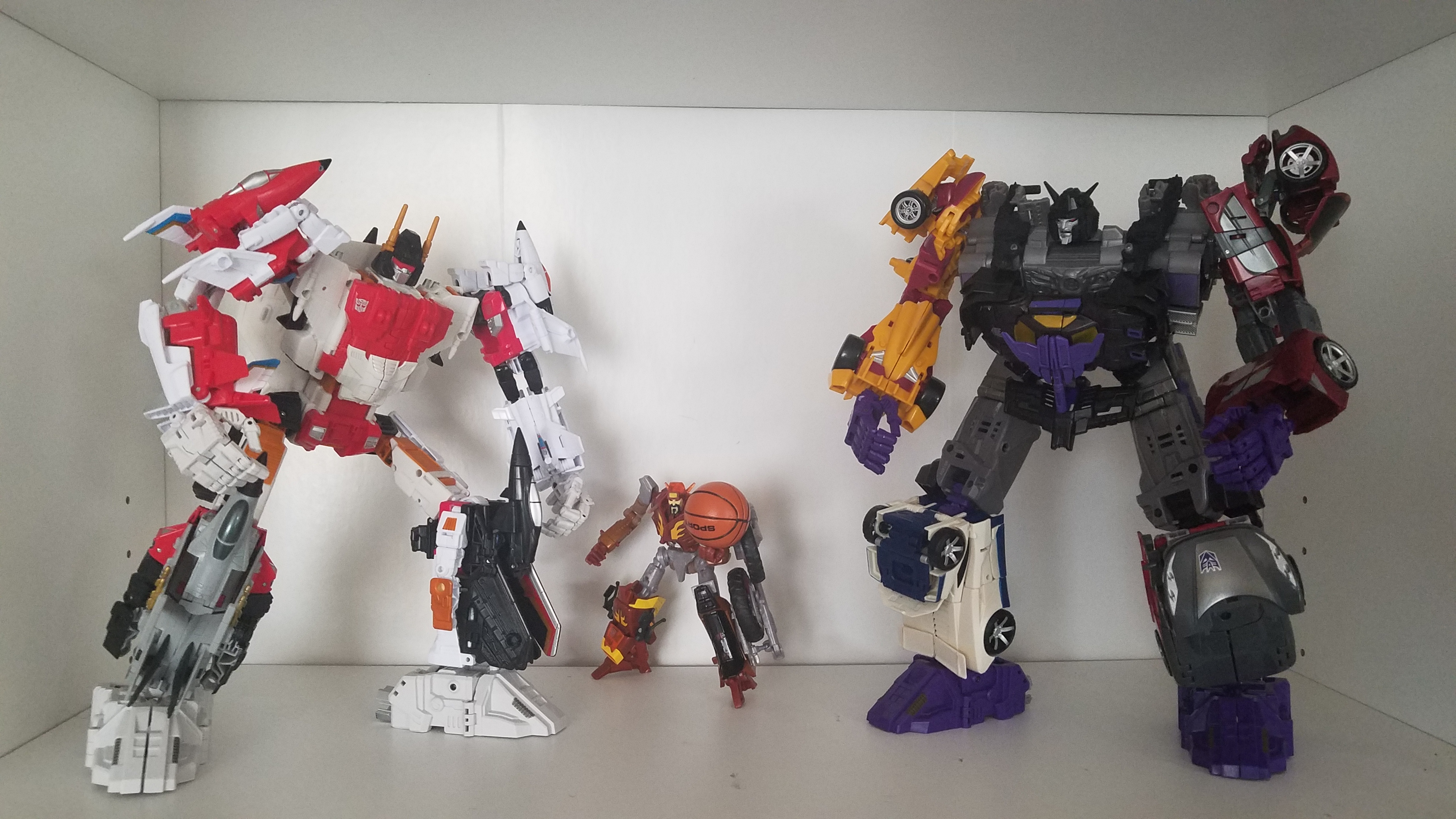 It made sense having Metroplex off to the right, where he then butted up against the desk next to the rack. Then the larger bots (combiners and Six-Gun) kind of just stood wherever they fit in the space in front of him, and then the smaller bots in front of that. There was a bit of an attempt with at least the smaller bots in front in giving them a balanced arrangement, but it was a token effort at best.