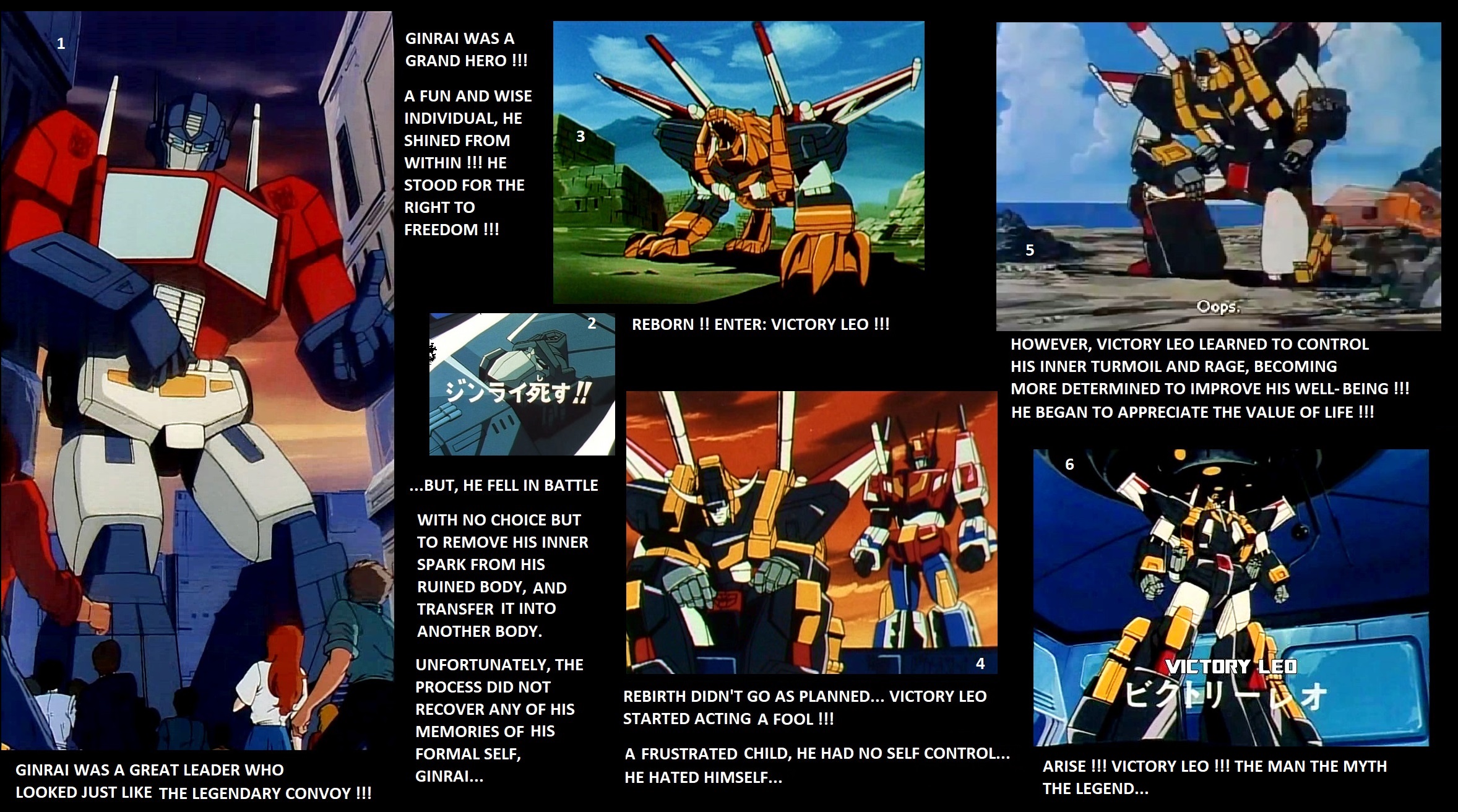 "Victory Leo is a true champion. Started out great. He even looked like Convoy. But, he got beat down, lost his memory and had his soul transferred to a new body. He wasn't the same anymore, man. Started acting out of frustration, got drunk and damaged some really expensive stuff, making Star Saber and Wheeljack concerned. But, with the help of family and friends, he turned his life around. His anger issues have died down, due to the medications he takes, along with therapy, a proper diet and daily exercise routine. His morale is elevated!"