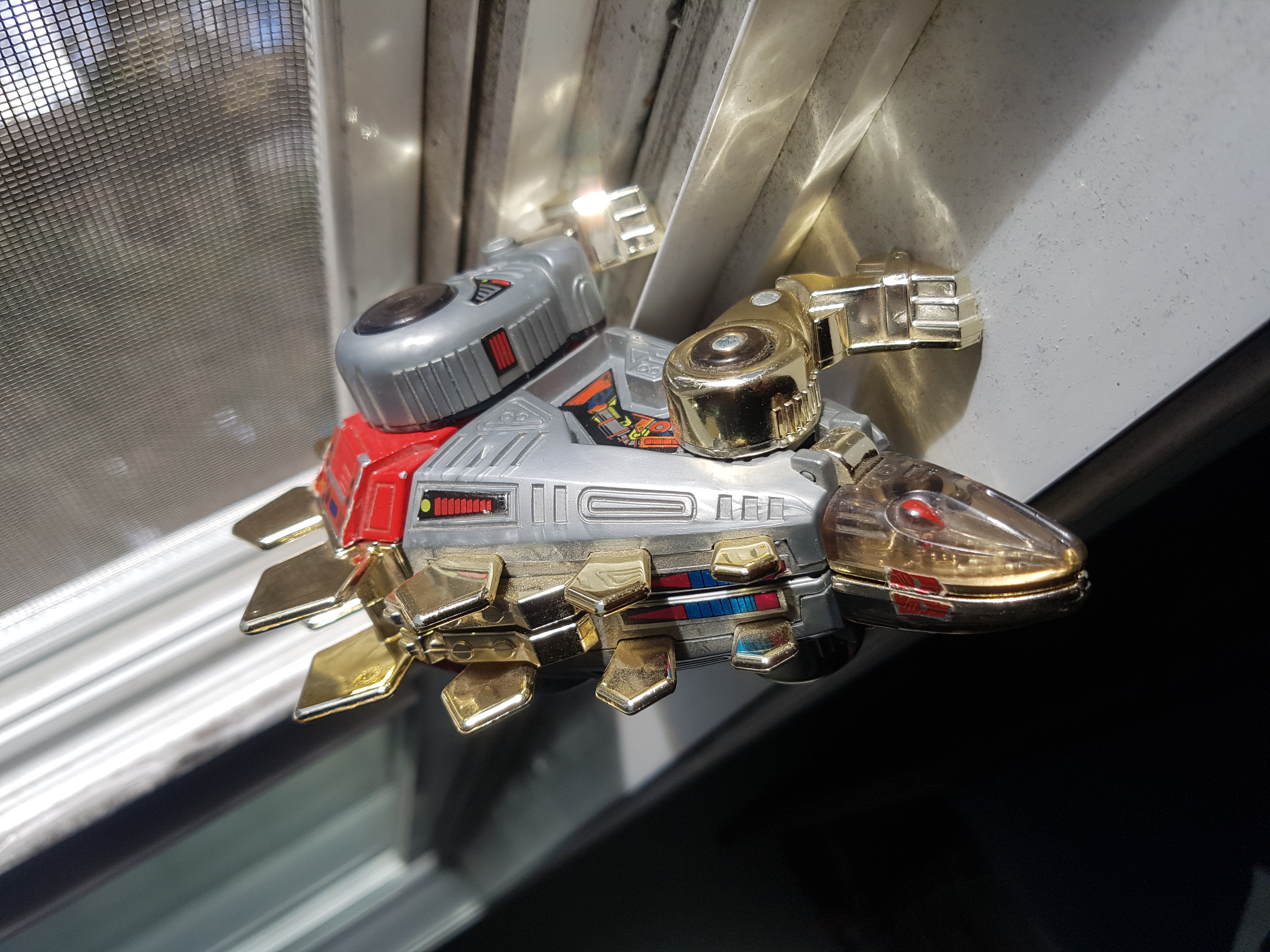 The Targetmasters can also attach to the tails of the Decepticon twins, via the same small pegs. In the case of Pounce, I had to fold-up the tail, as the hole was on the underside. In both of them, the guns could be folded down to emulate a "tail (extension)" of sorts, or the weapons could be attached as-is.