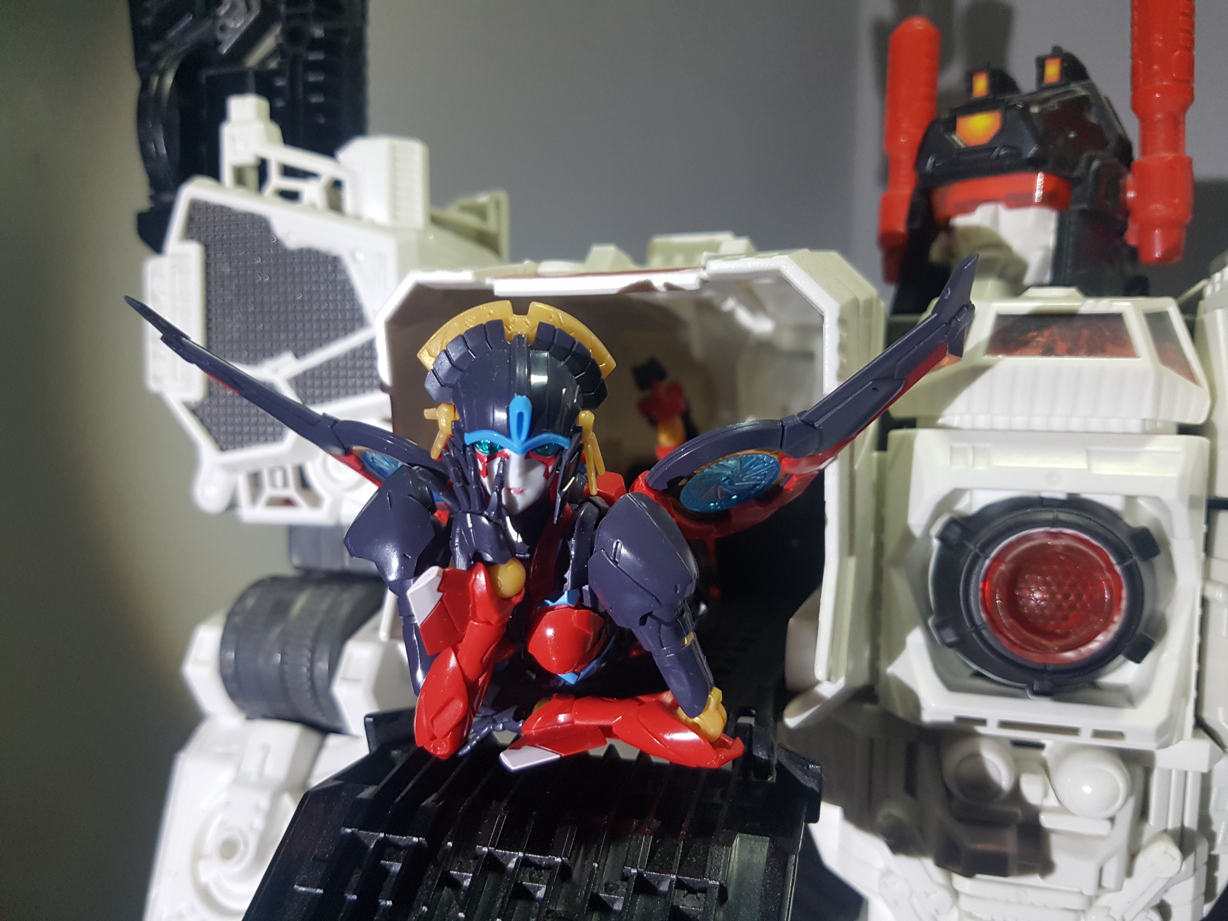 Obviously not an offical Hasbro figure, but I slapped Decepticon symbols on her anyway.