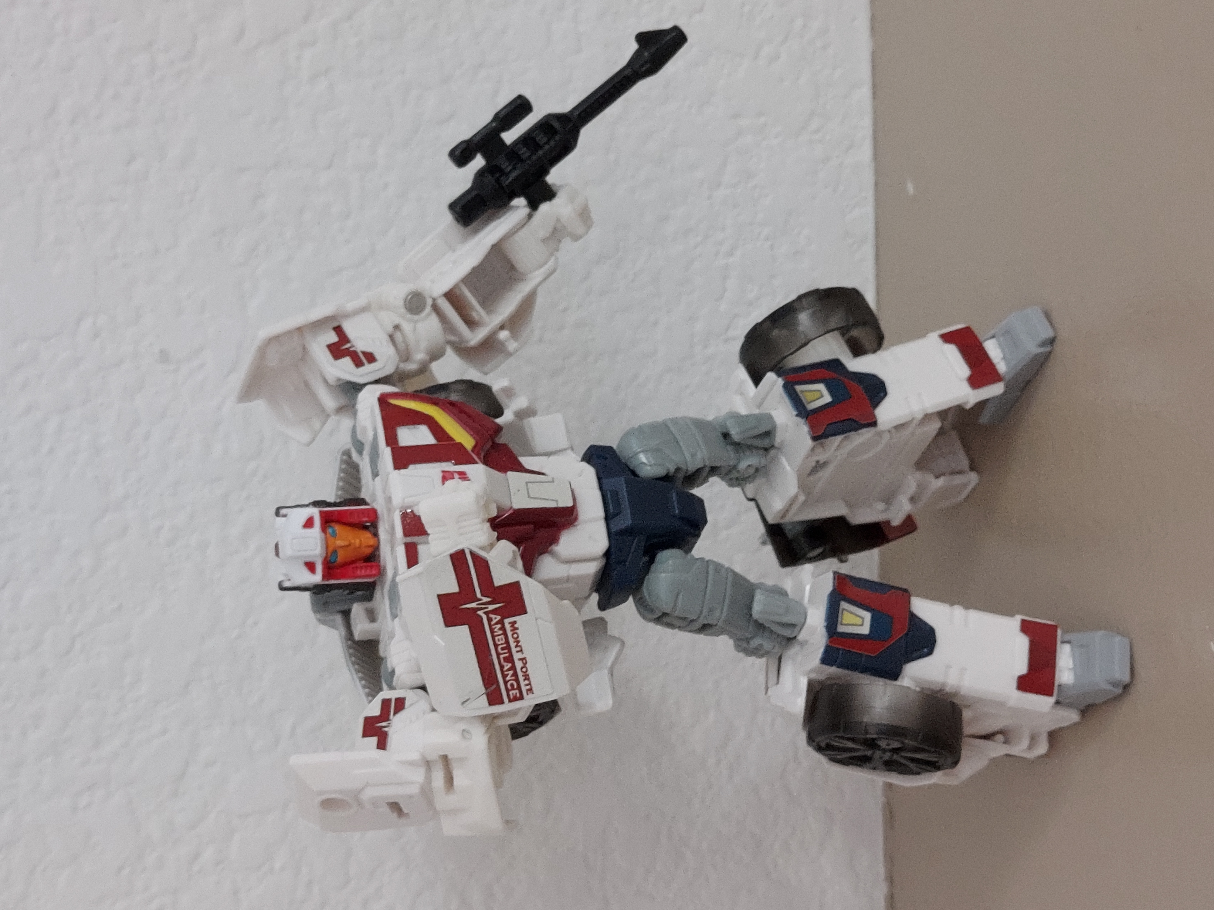 I don't think people appreciate this guy enough. Tailwhip's alt-mode is CLEAN! No robot bits poking out, no limbs dangling underneath, even his face is hidden behind a tinted cockpit. He's supposed to resemble a Hong Kong Police helicopter but I'm not sure how close to real life it is. Then you get to his robot mode and this is where problems arise. Mind you not a problem for me, I love this! Tailwhip has no real hands, but honestly I can forgive that. Despite his awkward appearance he's decently poseable! I mean, the articulation is limited, but he can still look like he's doing stuff. Also the helicopter rotors function as a spinning blade weapon, so what's not to love here?