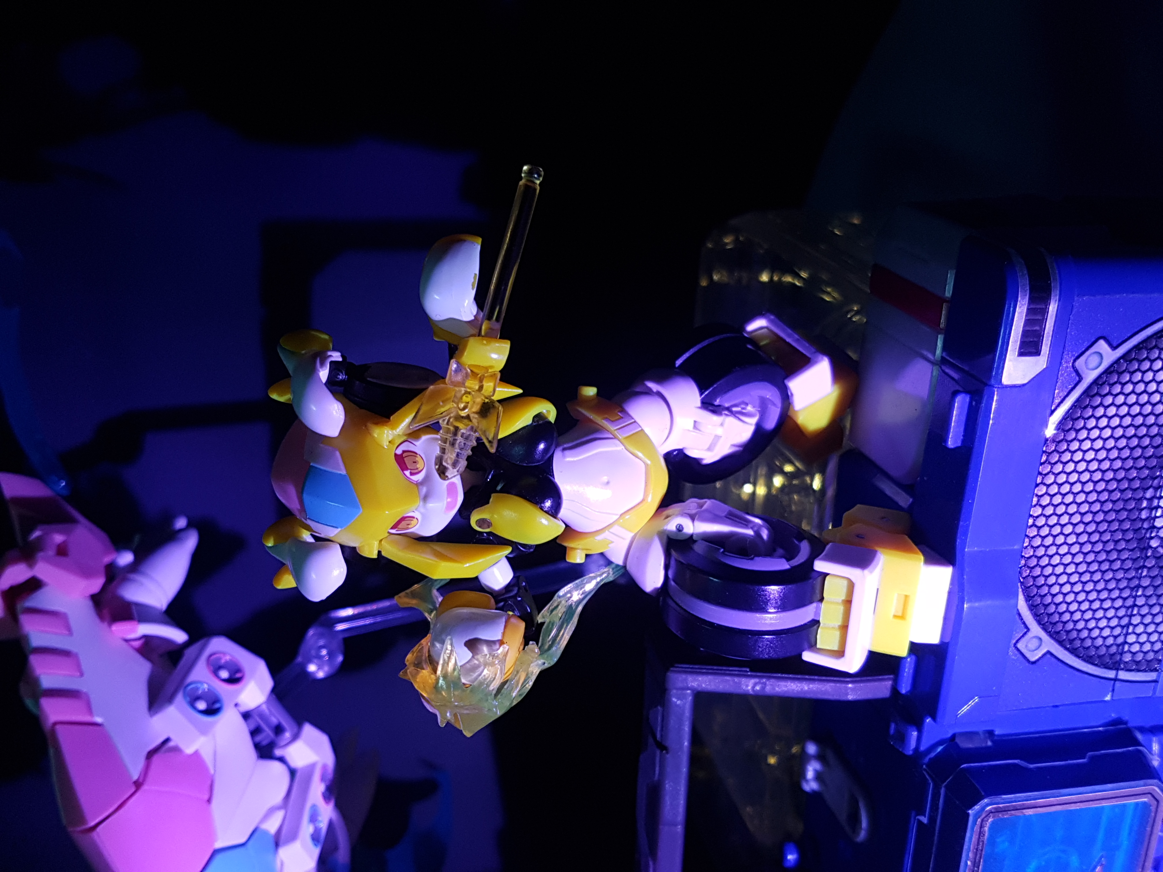 I had Scarlet Sonic (the red one with the two Botbots) standing on Soundwave in his boom box mode when this idea popped into my head. Thunderlight doing the singing, and Gemini Wings Pink and Blue... I don't know, playing drums from their speakers? I need a tiny drum set for things like this. Anyway, I like how this came out!