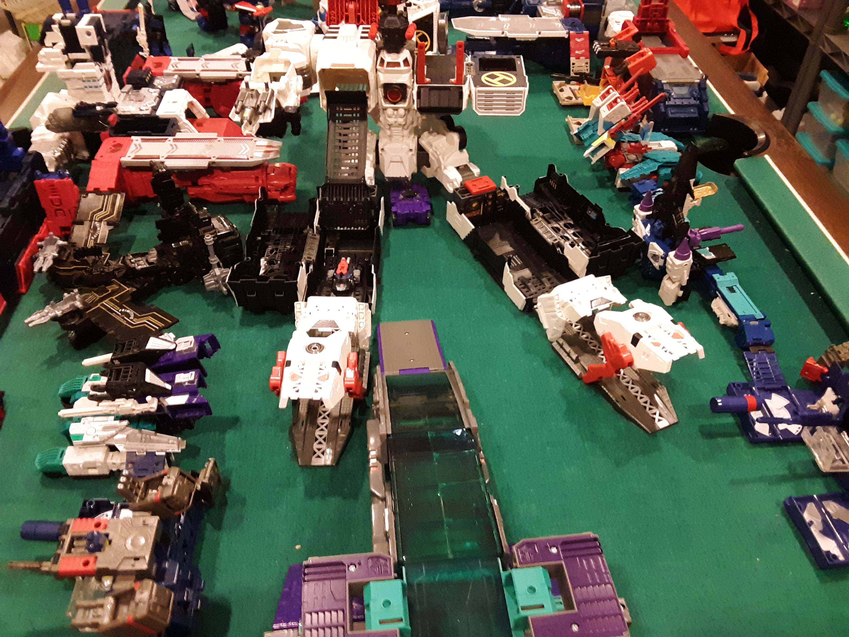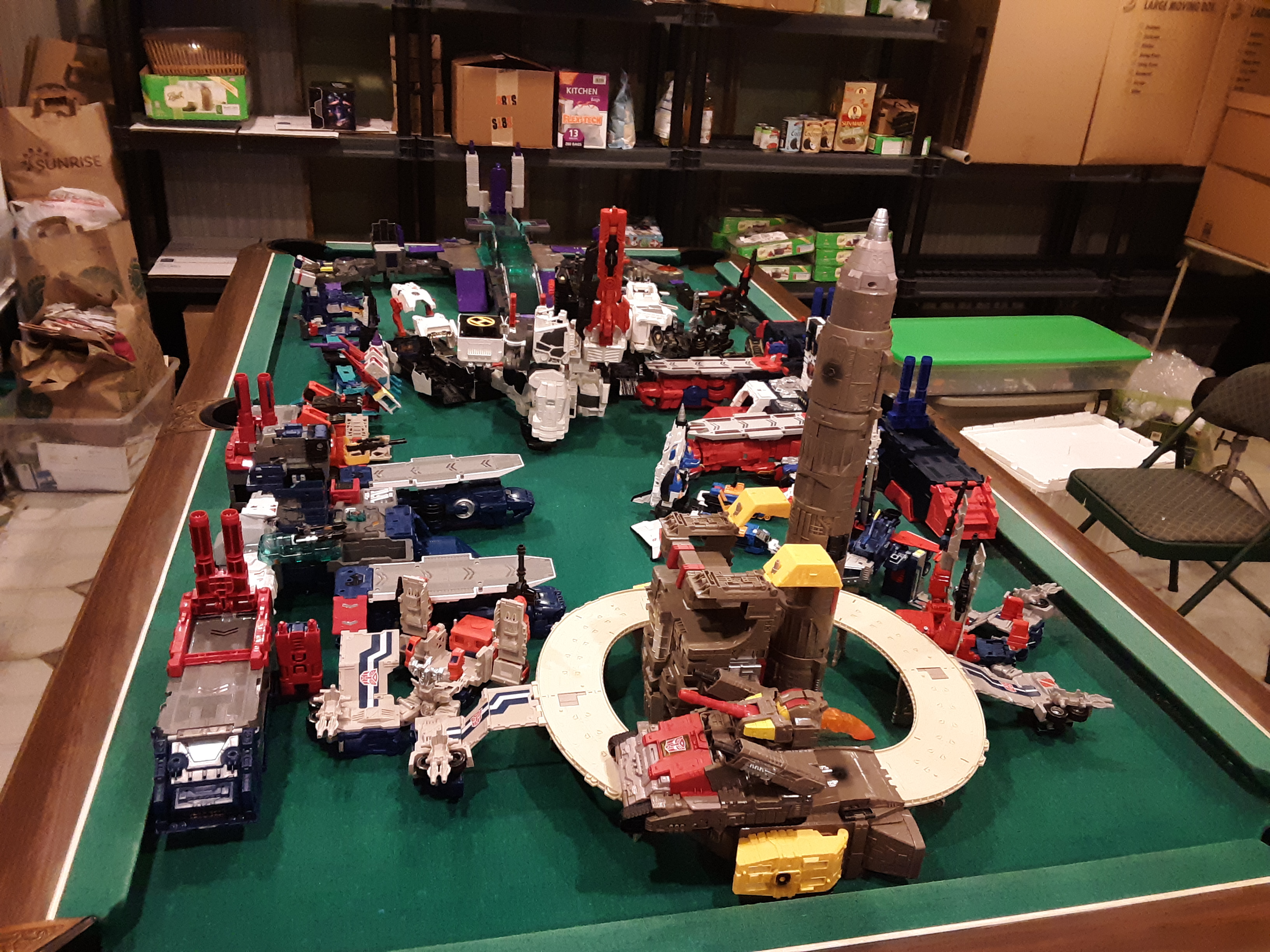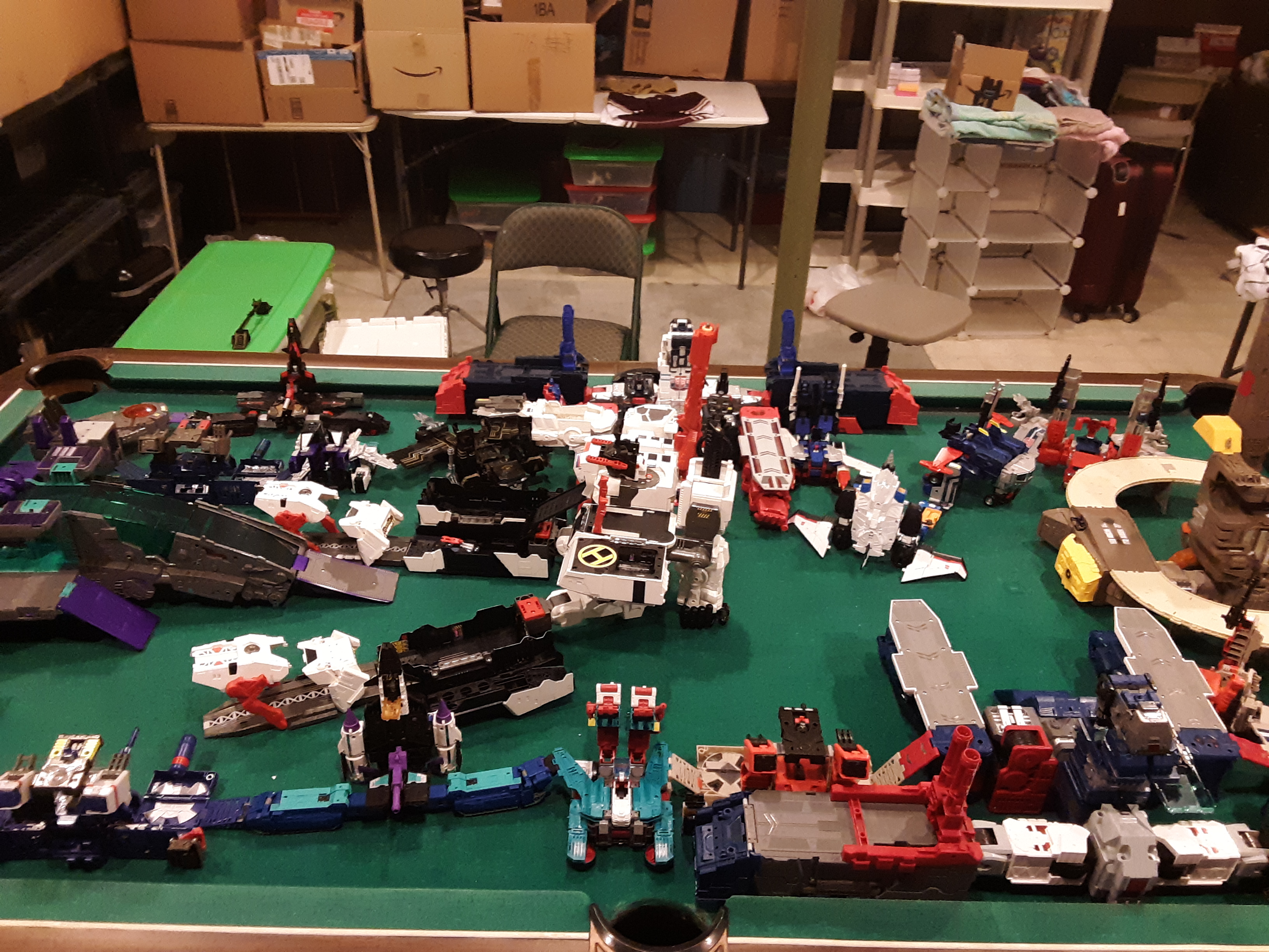 So here are the fruits of my weekend labor, Titan Town, the combined city using all the city bot titans and all of the Titans Return/Legends leaders figures with base modes. I wanted to see if I could like 1 giant loop through all the bots, but was limited to the confines of the pool table. I almost pulled it off, minus just 1 leader (Sky Shadow) who was a dead end that I was sort of able to cover up/blend in.