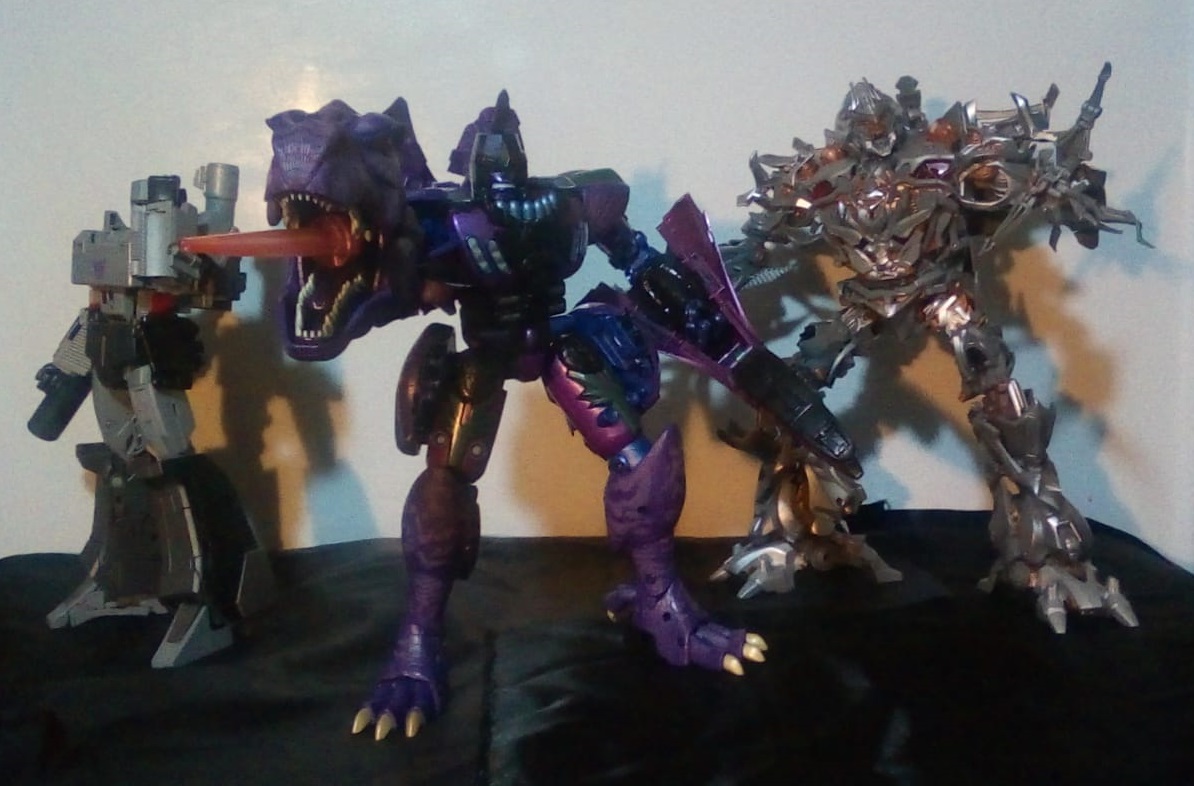 I don't have any shiny new figures. But I have this Trypticon that I got for Christmas last year and didn't finish stickering until last night! The instructions were all in Japanese and hard to follow so I had to rely on shaky videos and pictures to figure out what goes where, and that's not exactly easy to do. Anyway, this does put a smile on my face...