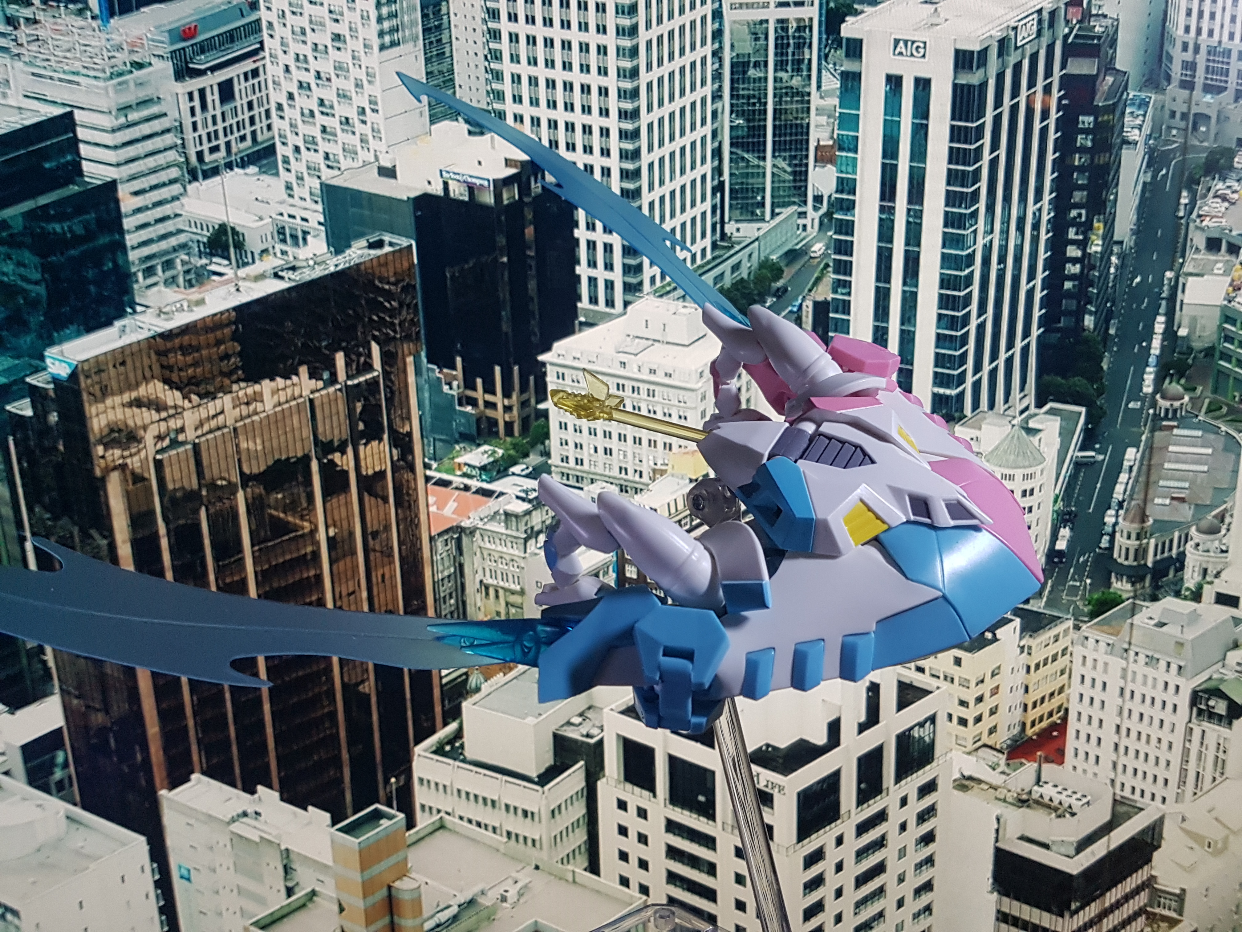 A pink and light blue stealth bomber. Gemini Wings Pink and Blue combine into the girliest flying death machine I've ever seen! Also part of the bomber mode becomes a stage, microphone, and speakers so I guess they're a band.