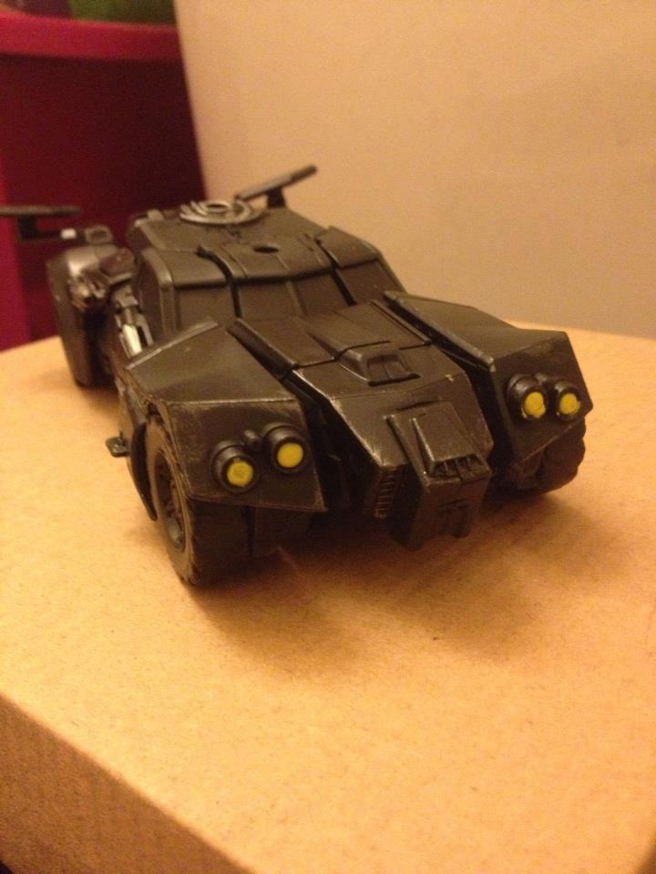 My only suggestion to maybe eschew the drybrushed silver scratches, as it give the alt mode more of a Mad Max feel than a Batmobile, IMO. And like the others said, a more batman-esque head and some bat emblems would highlight the Batman theme you're going for.