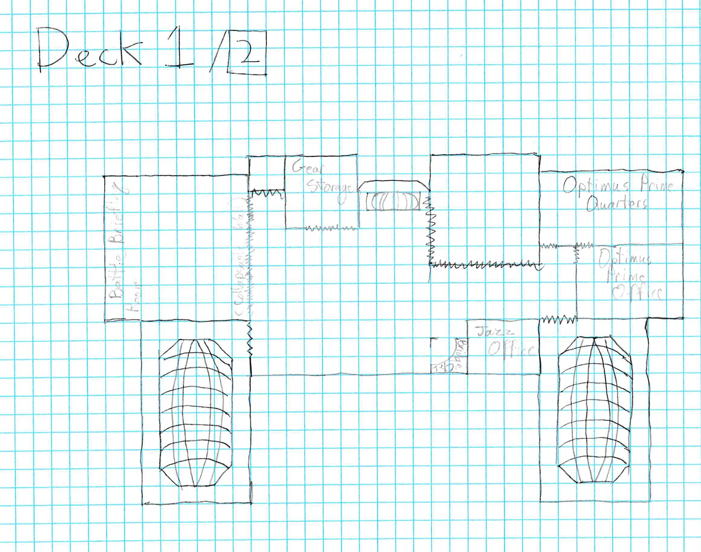 In the left Pectoral region is a 2x2 (30' square) area marked "Lift". I wasnt entirely sure how Cybertronians handle moving between floors given the heights vary from the 8' tall Motorcycle Arcee to bots like Magnus, so an Elevator seemed the most practical, even though a single elevator doeant seem the most reliable on a warship, although one must remember this is a living ship, so if someone knocks out the Elevator there are probably more pressing concerns anyway.