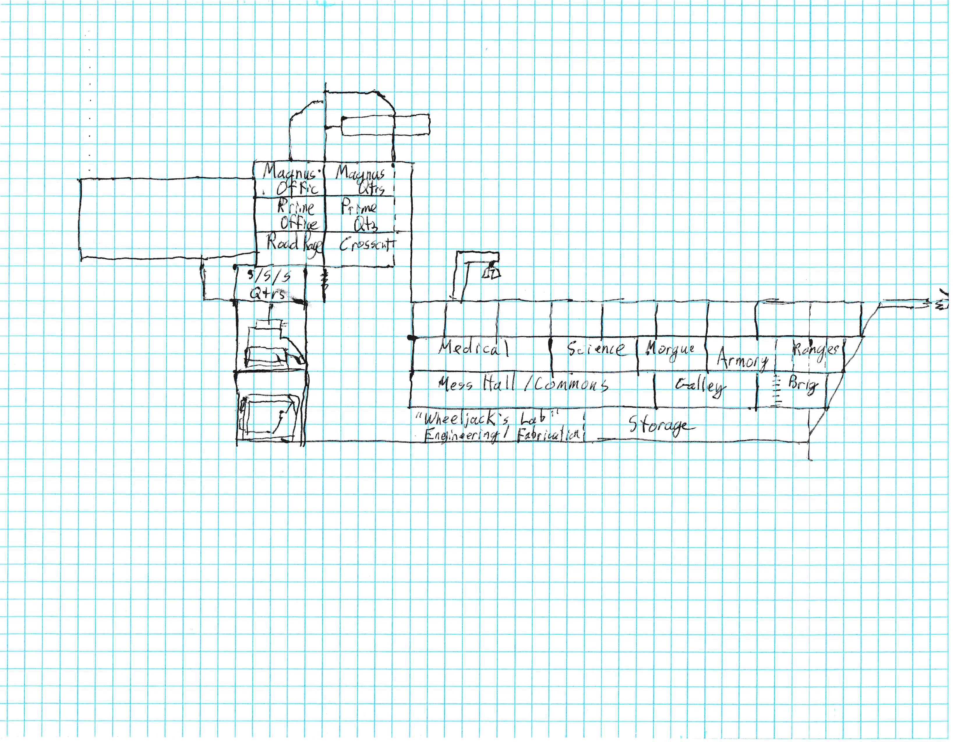 In the left Pectoral region is a 2x2 (30' square) area marked "Lift". I wasnt entirely sure how Cybertronians handle moving between floors given the heights vary from the 8' tall Motorcycle Arcee to bots like Magnus, so an Elevator seemed the most practical, even though a single elevator doeant seem the most reliable on a warship, although one must remember this is a living ship, so if someone knocks out the Elevator there are probably more pressing concerns anyway.