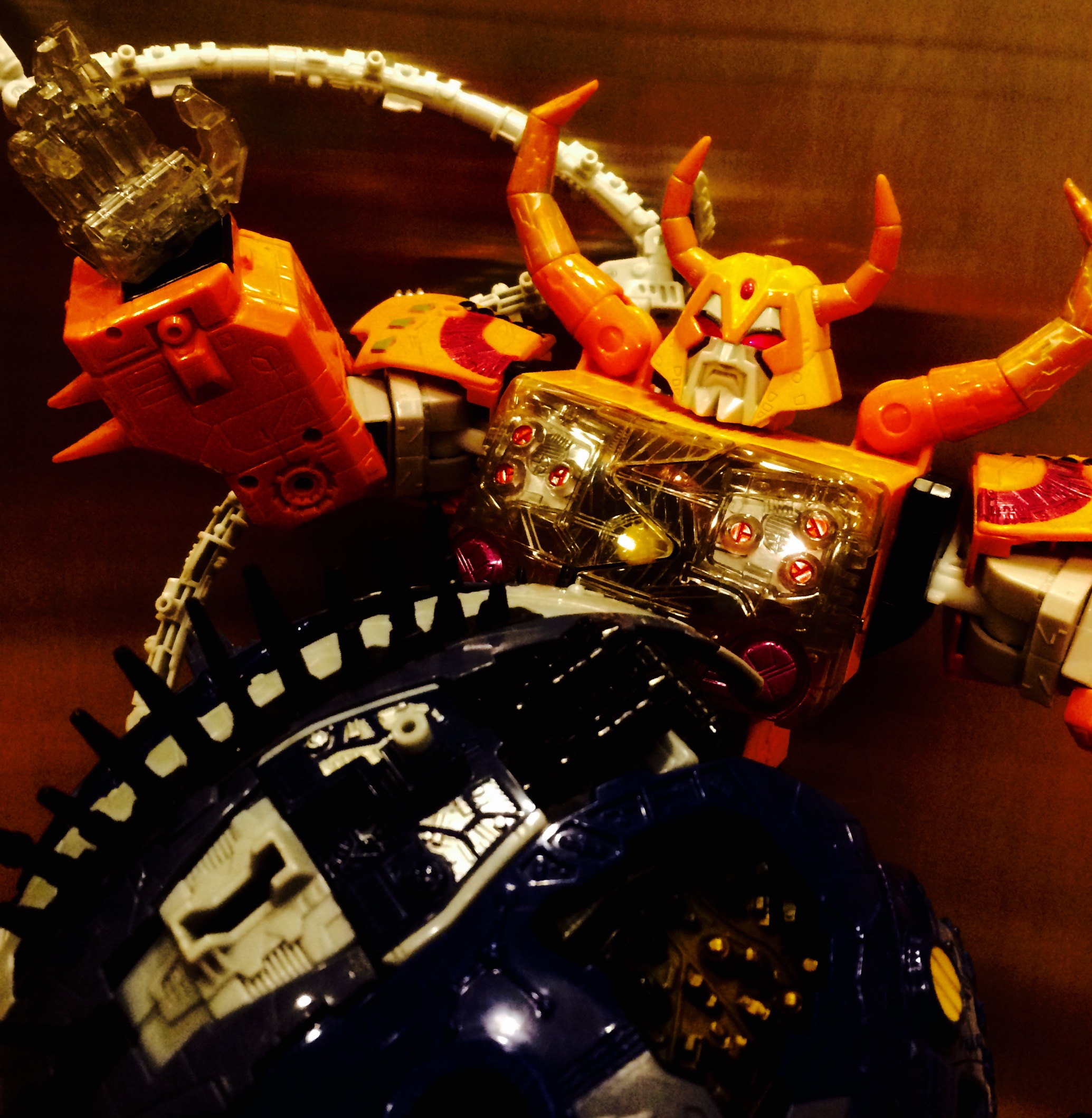 I went to my favorite vintage toy store and scored this loose and incomplete Cybertron Primus for $7.99. He doesn't have his feet or accessories, but he's still great fun to pose.He does "planet" better than my Unicron, but...